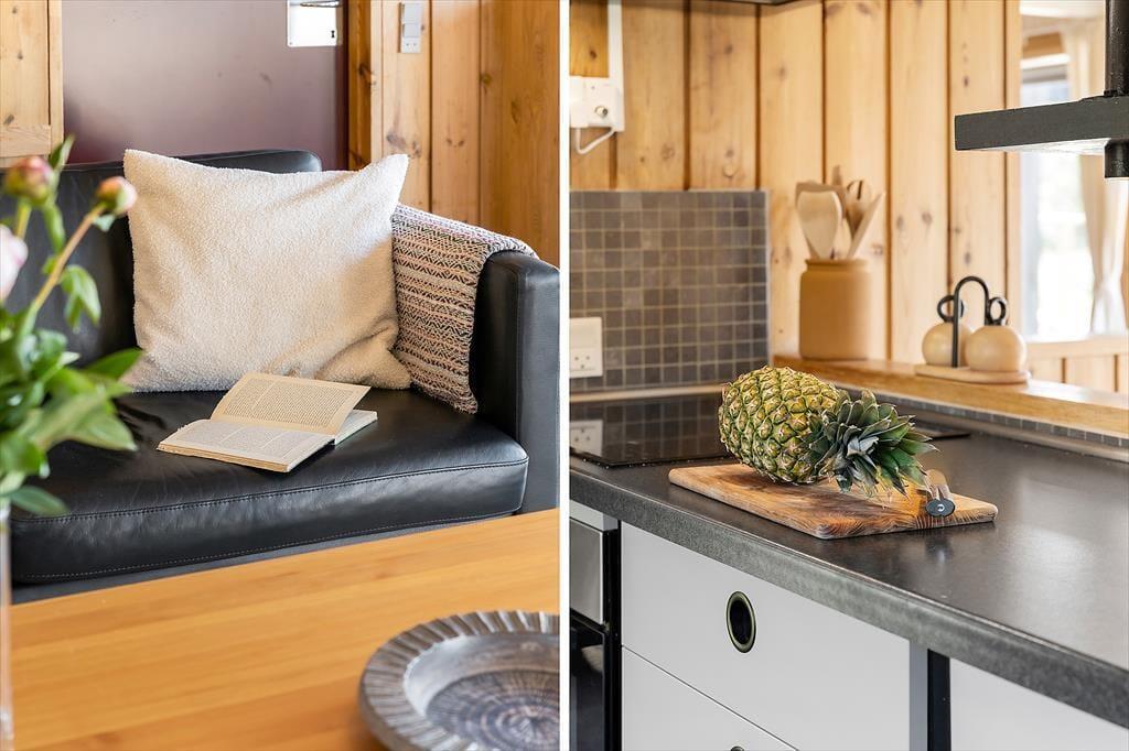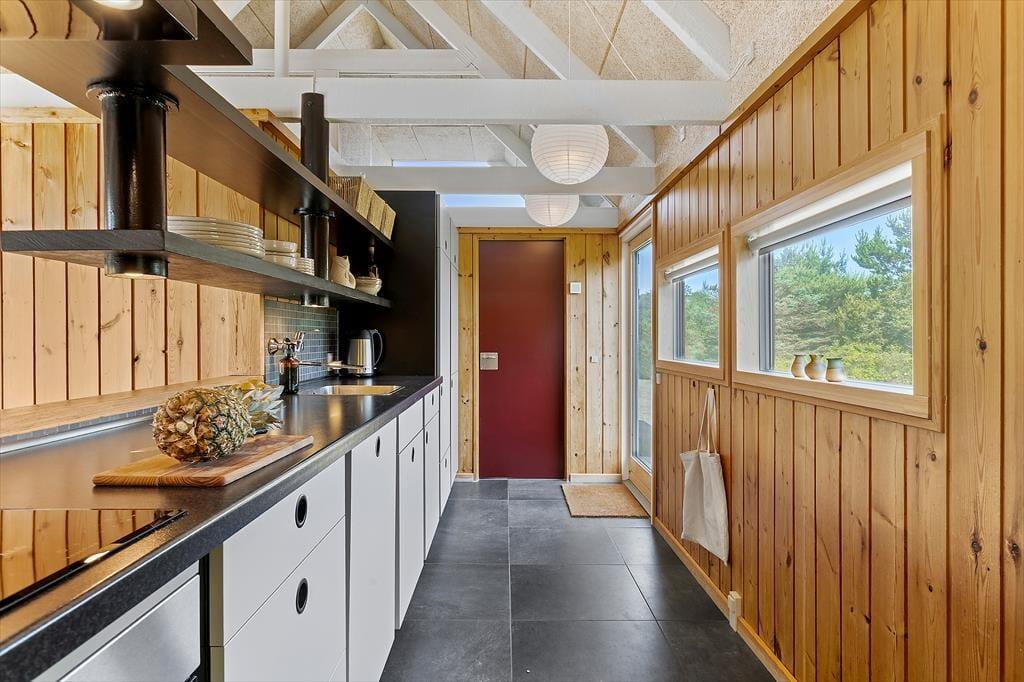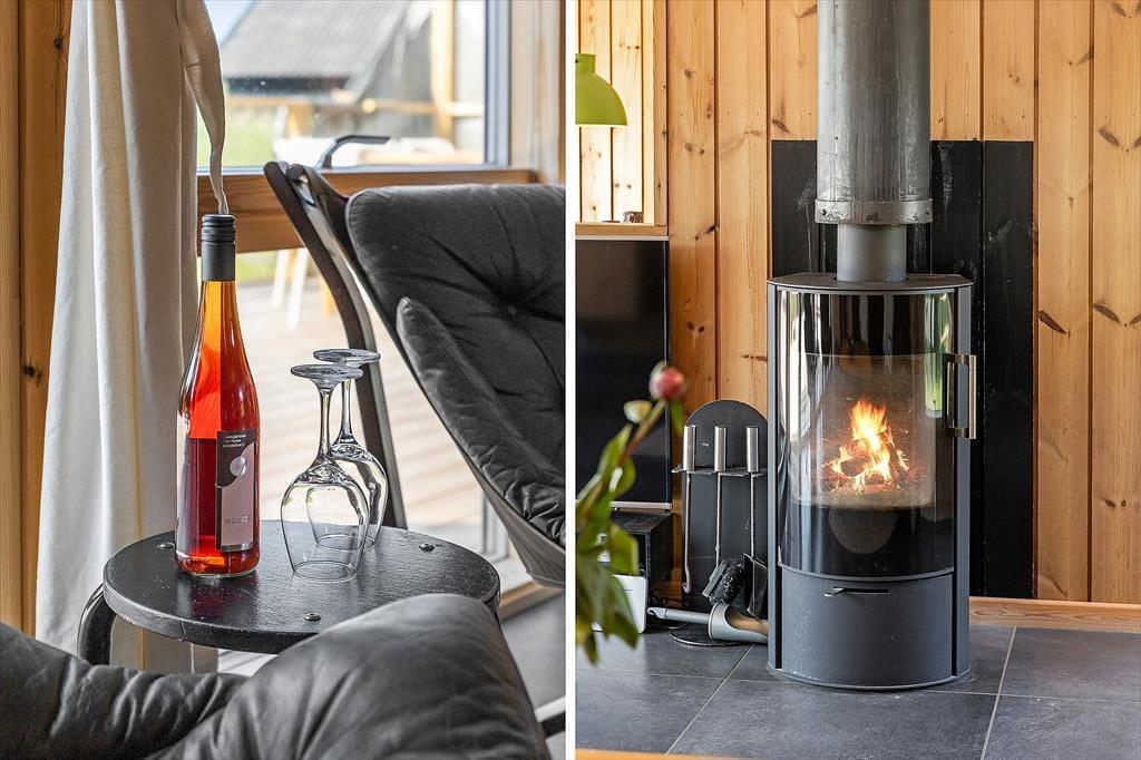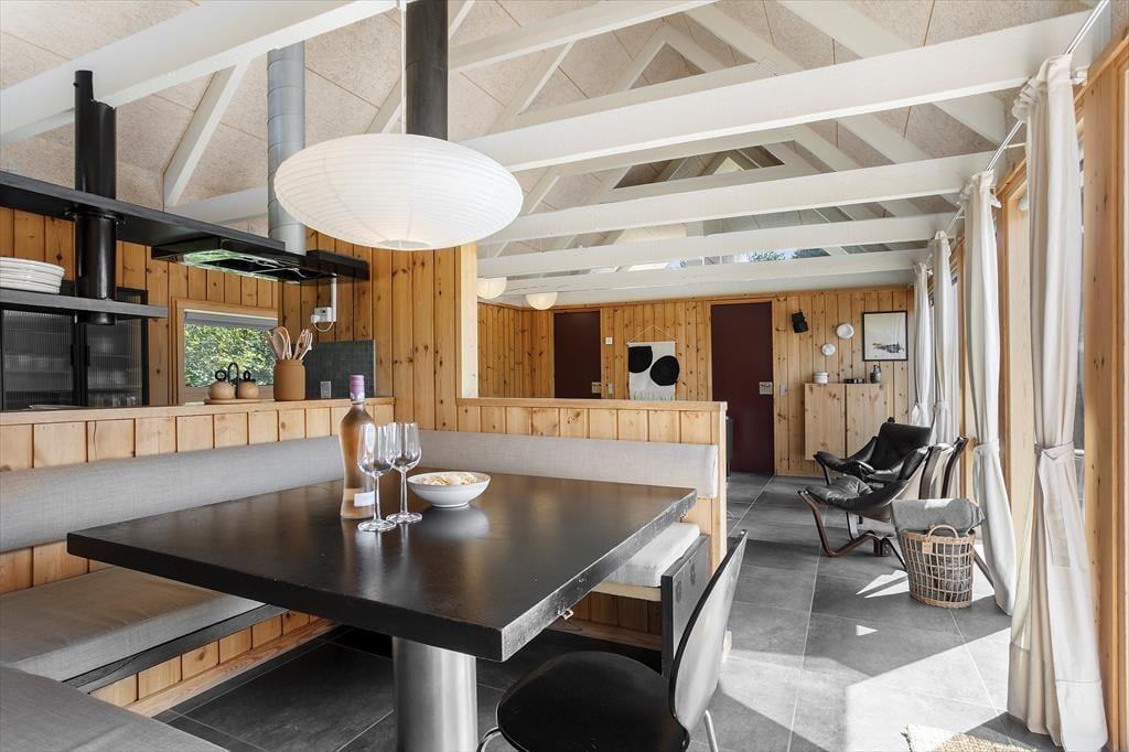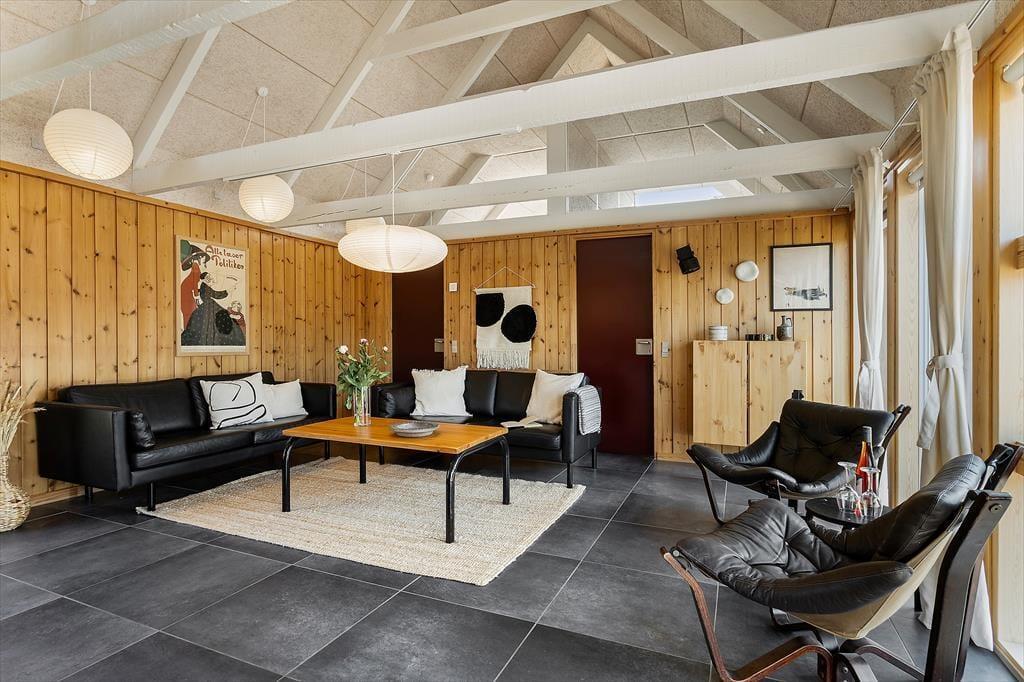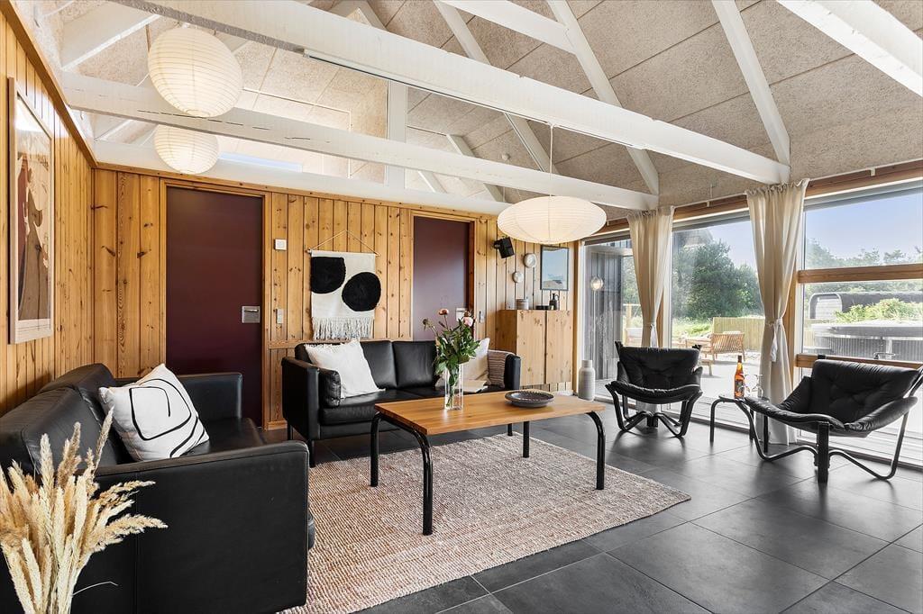 Når du træder indenfor, bliver du mødt af en lys og indbydende atmosfære, hvor sommerhusets charmerende detaljer skaber den perfekte ramme for en afslappende ferie. De åbne opholdsrum med loft til kip og store vinduespartier gør, at lyset strømmer ind, og naturens farver bliver en del af indretningen. I stuen kan du samle familie og venner omkring brændeovnen på kølige aftener eller nyde en god bog i sofaen med en varm kop kaffe i hånden. Det rummelige køkken er veludstyret, så du nemt kan tilberede lækre feriemåltider, mens feriestemningen breder sig i huset.
