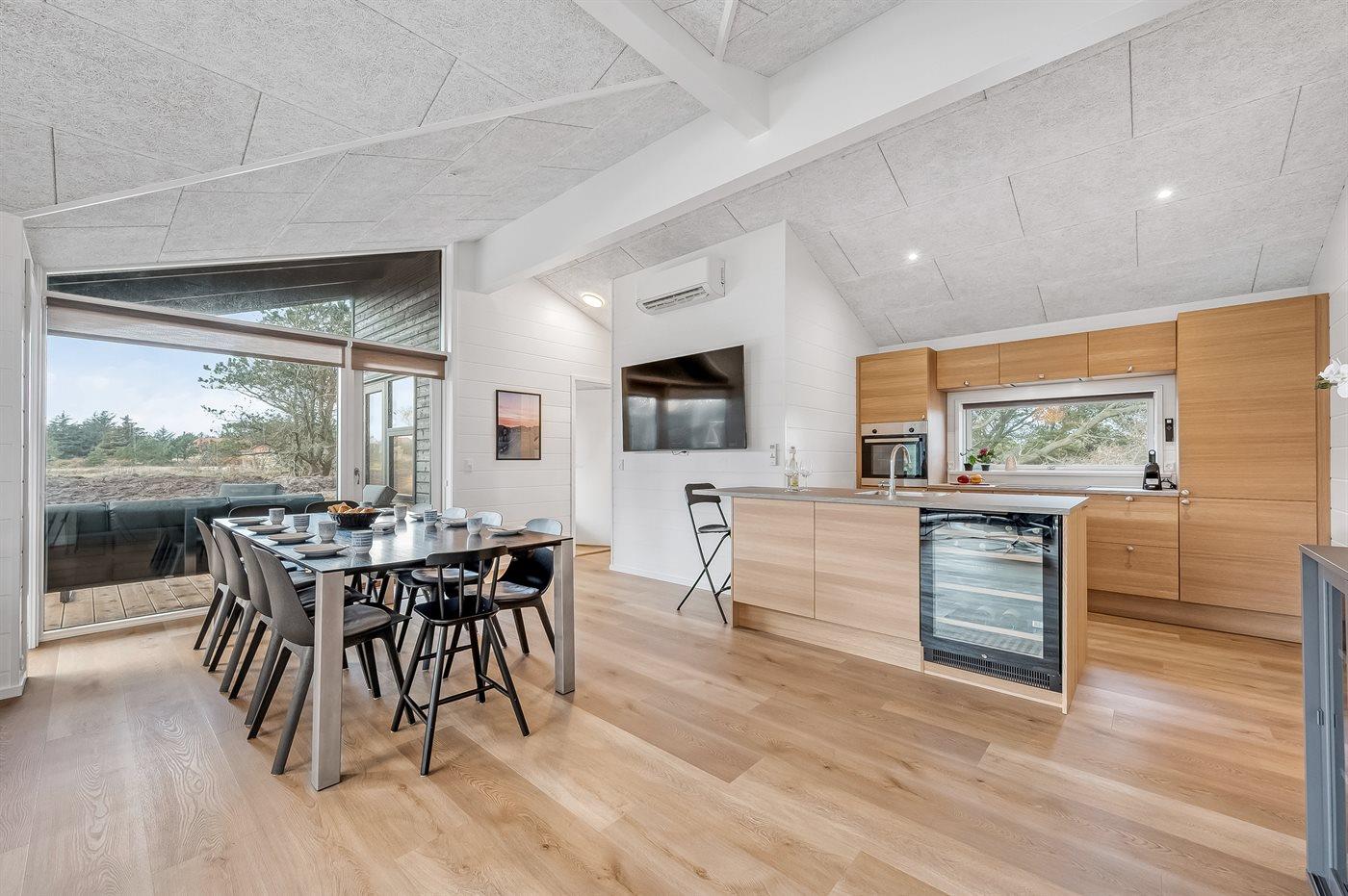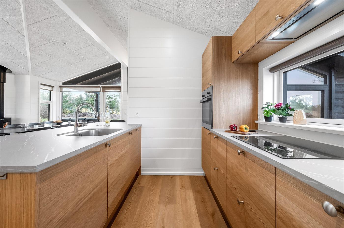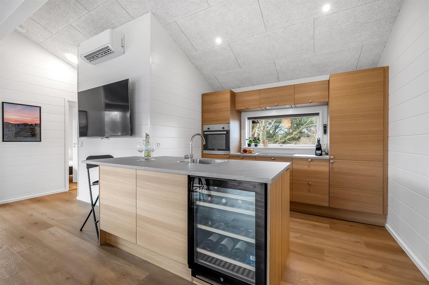 Køkkenet er udstyret med 1 køleskab. Der er 4 induktionskogeplader, varmluftovn, mikrobølgeovn samt opvaskemaskine.