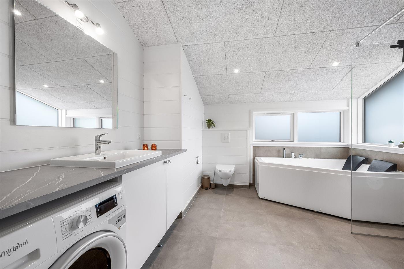 Der er 2 badeværelser med bruseniche og 2 toiletter. Der er gulvvarme på 2 badeværelser. I saunaen er der mulighed for afslapning.