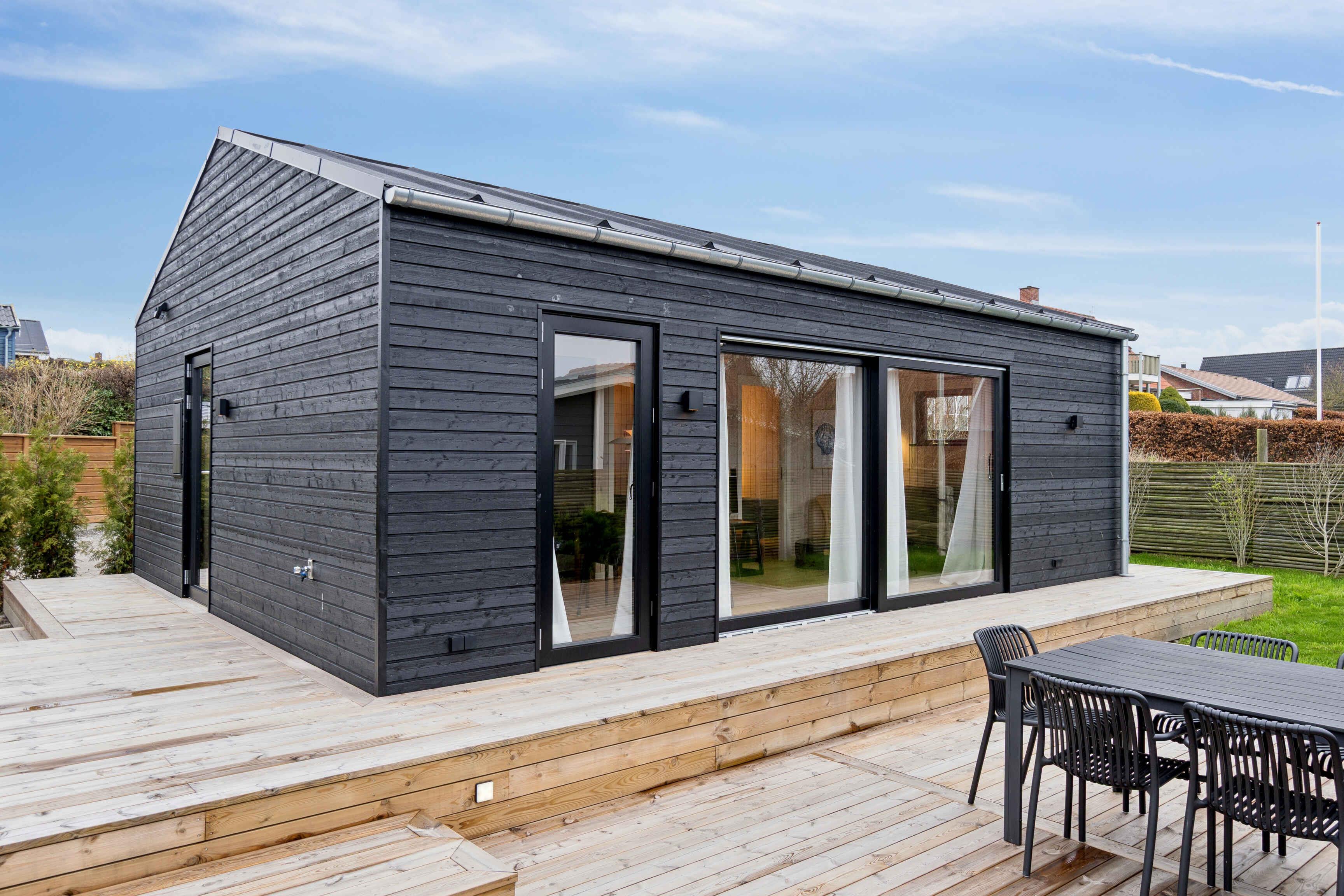 Charmerende nybygget sommerhus kun 300 m fra stranden i Karrebæksminde med stor sydvendt terrasse og moderne faciliteter.