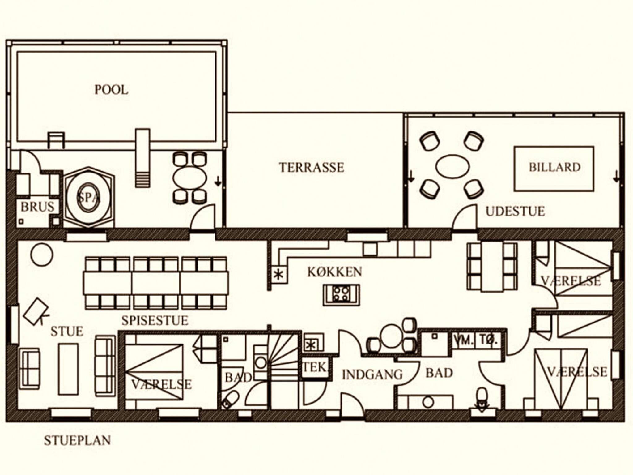 Vil du forkæle din familie, skal du vælge denne 444 m² store ejendom, som er beliggende meget afsides. Der er en stor skov omkring huset, denne må IKKE benyttes, da den bruges til jagt og er overvåget - man kan i stedet tage til den store lækre Kompedal plantage, hvor der er rig mulighed for skønne naturoplevelser. Fra den 95 m² store opholdsstue på 1. sal kan man være heldig at se rådyrene, eller man kan samle familien om det 65" store TV. Udover den 20 m² store pool med vandrutschebane, står det indbydende 7 pers. spabad ved siden af poolen. På 1. sal er saunaen med indgang fra badeværelset. Solgården er perfekt til feriens varme dage, hvor der både er grill og havemøbler. Til børnene er der gynger, sandkasse og legeborg samt en lille fodboldbane og en . lækker volleyballbane til fornøjelse for både store og små I udestuen er der billard og bordtennis. Der er 3 badeværelser med toilet, håndvask og bruseniche samt en bruseniche i poolrummet. Huset er opført i 1998 og er blevet delvist renoveret i 2022. Det opvarmes med pillefyr og varmepumpe samt brændeovn på begge etager. Skovejendommen har 24 sovepladser: 5 værelser med 1 dobbeltseng, 3 værelser med 1 dobbeltseng og 2 køjepladser samt 1 sovesofa i stuen til 2 personer. 2 husdyr er tilladt. Der er ikke TV2 kanal eller betalingskanaler i huset. HUSET UDLEJES IKKE TIL UNGDOMSGRUPPER. RYGNING ER IKKE TILLADT.