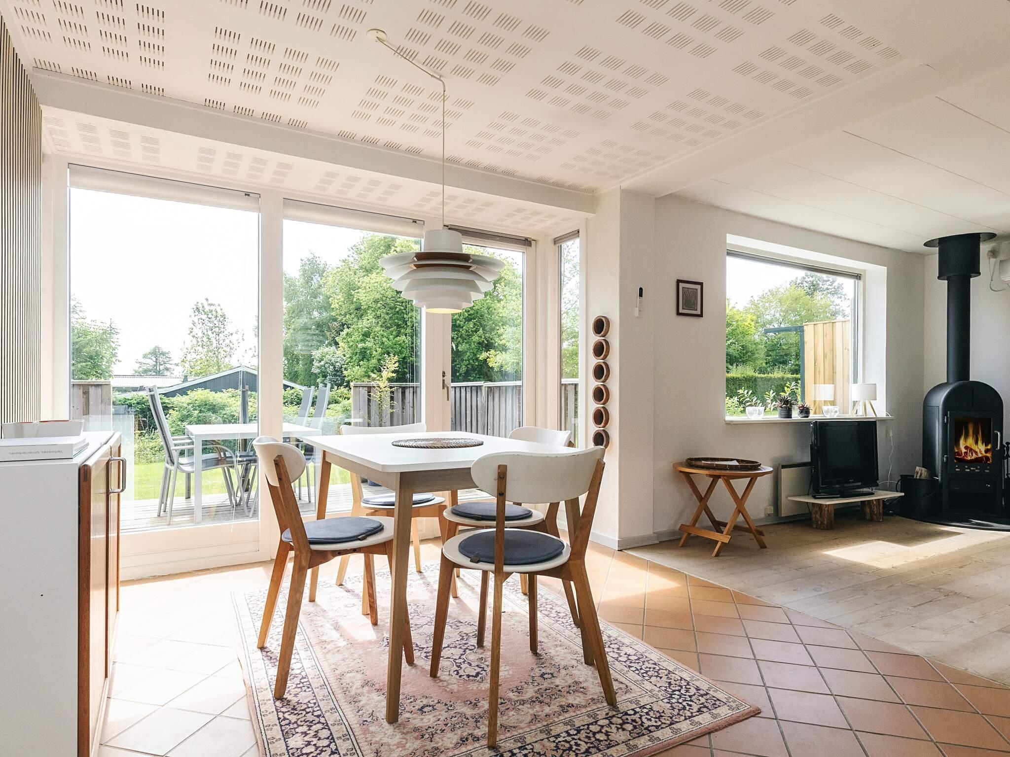 Huset opvarmes med elvarme og har både luft/luft varmepumpe og brændeovn – hvilket gør det behageligt året rundt.