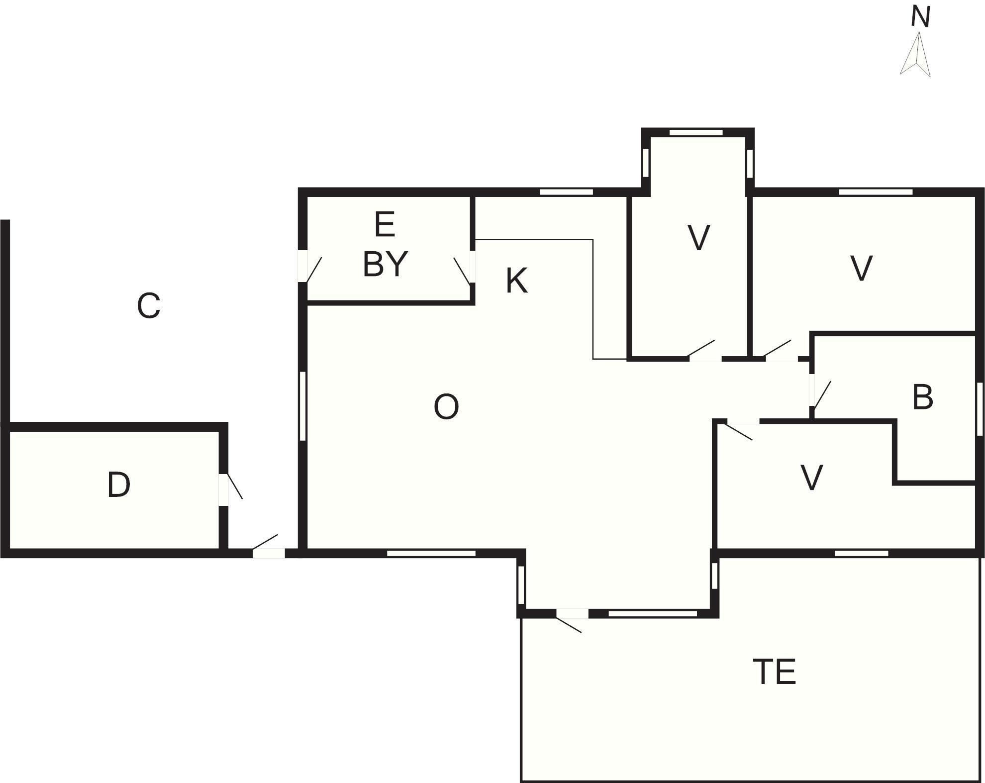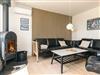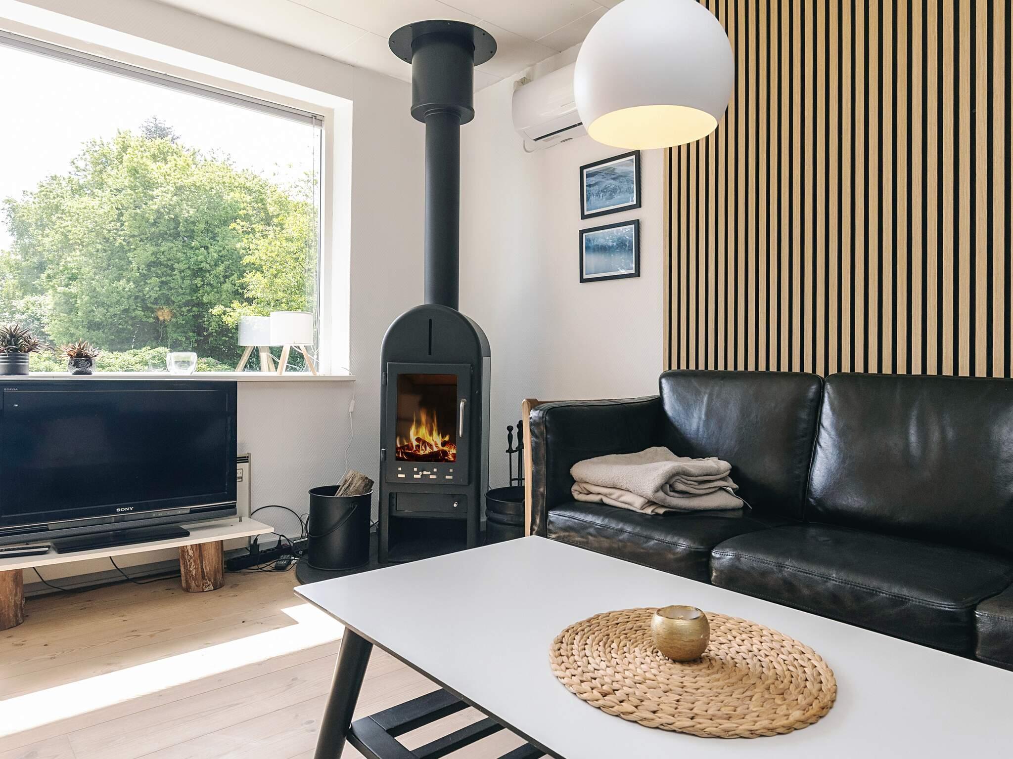 Indenfor finder du en hyggelig opholdsstue med brændeovn og TV – her er der lagt op til ægte feriestemning. Køkkenet ligger i åben forbindelse med stuen og er fuldt udstyret med el-komfur, køle-/fryseskab, separat fryser (1–59 liter), mikroovn, kaffemaskine og opvaskemaskine – alt, hvad du skal bruge til madlavning i ferien.