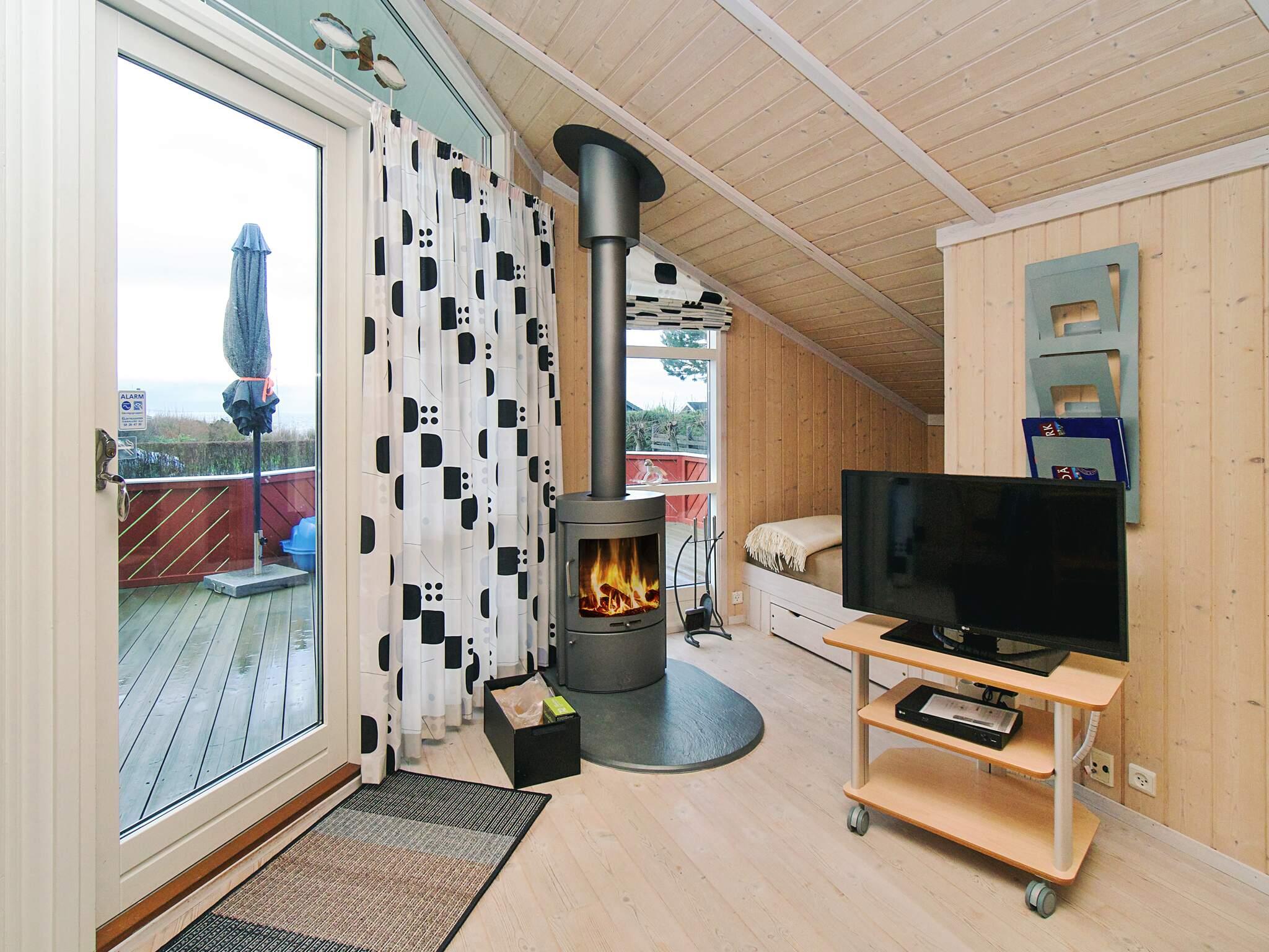 1 Opholdsstue: Brændeovn, stereoanlæg med cd, tv, video, parabol, barneseng og høj stol