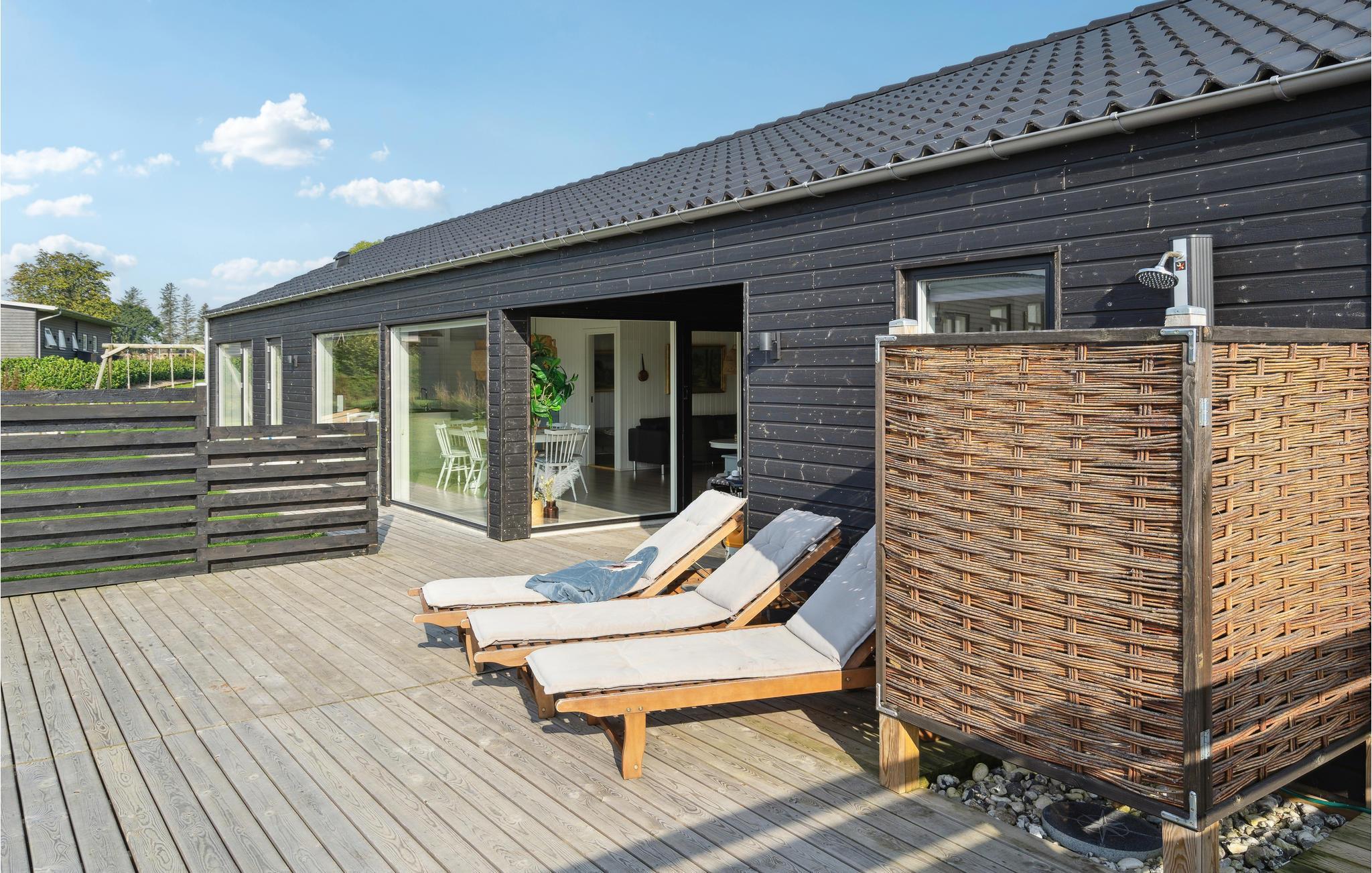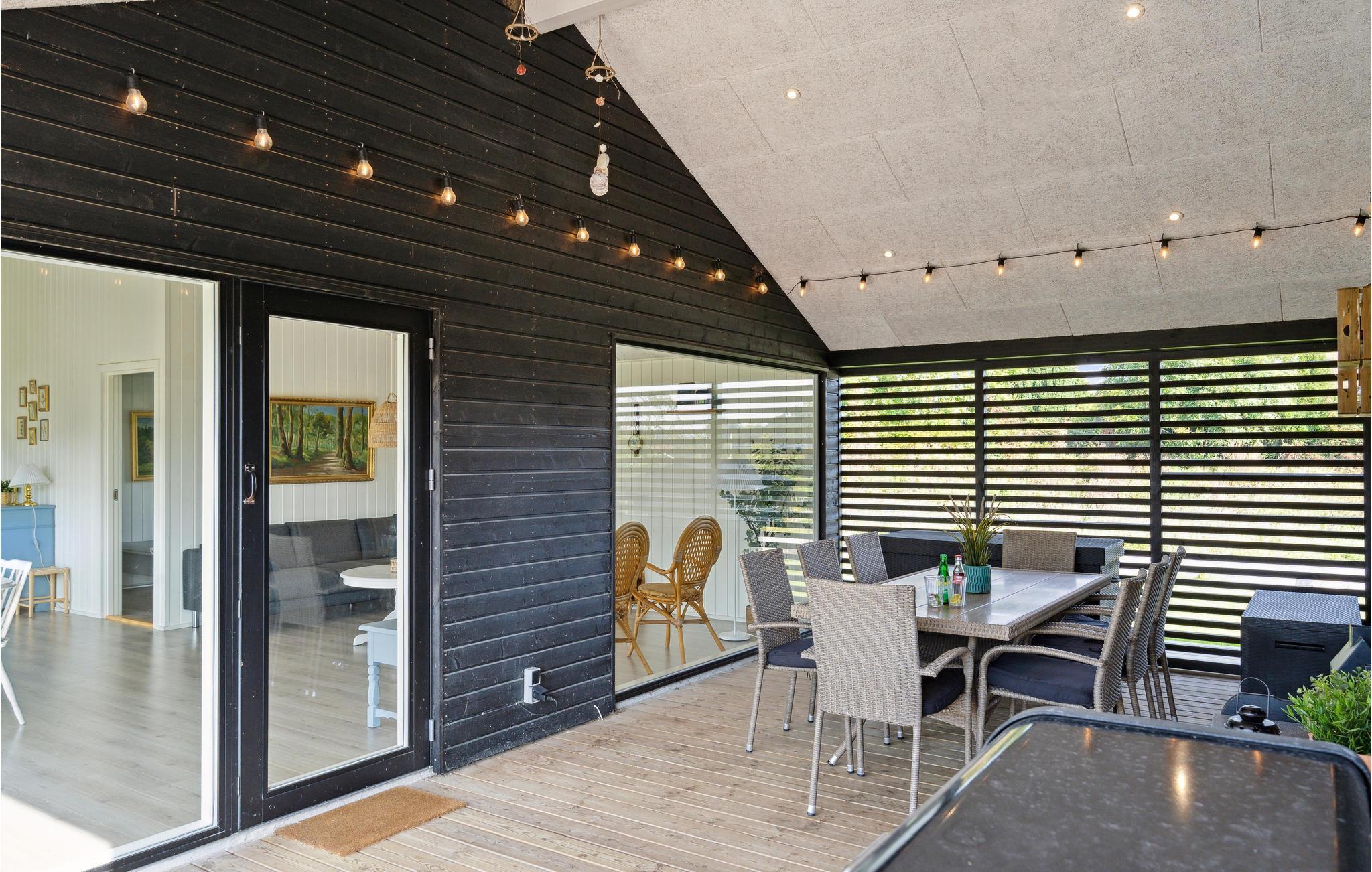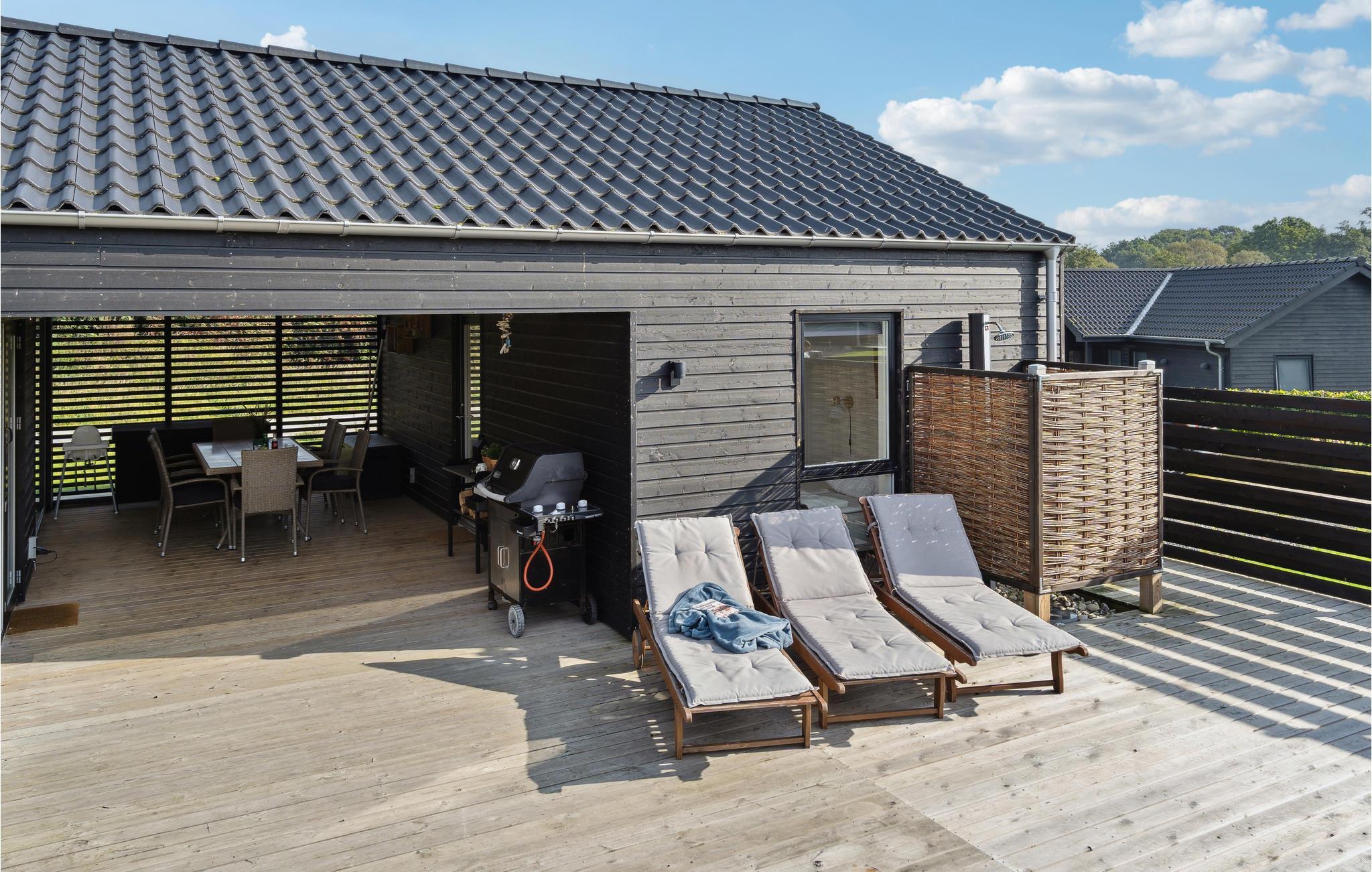 Spændende familievenligt træhus ved Kelstrup Strand med stor overdækket terrasse og spabad.