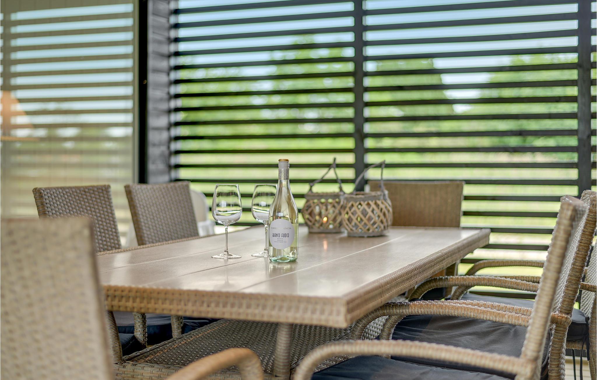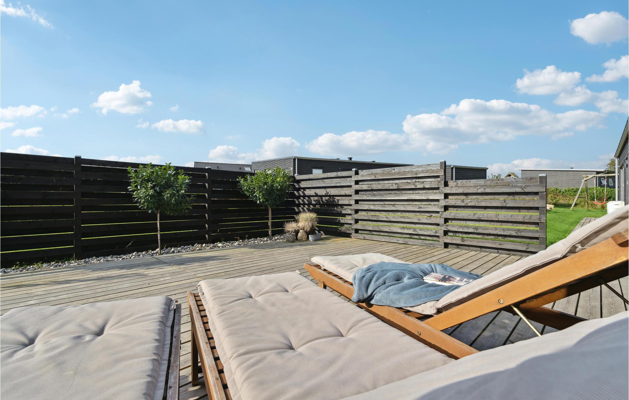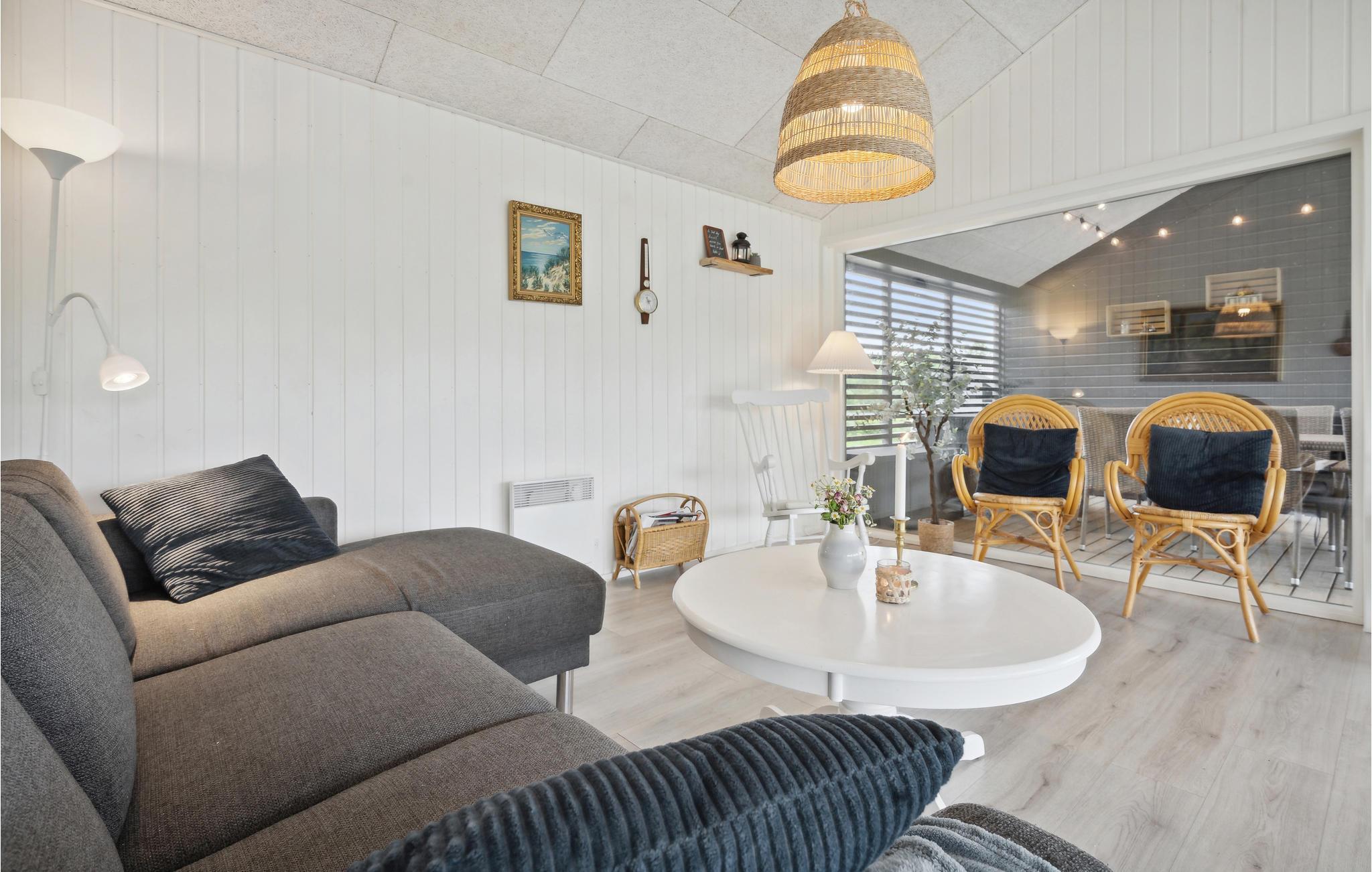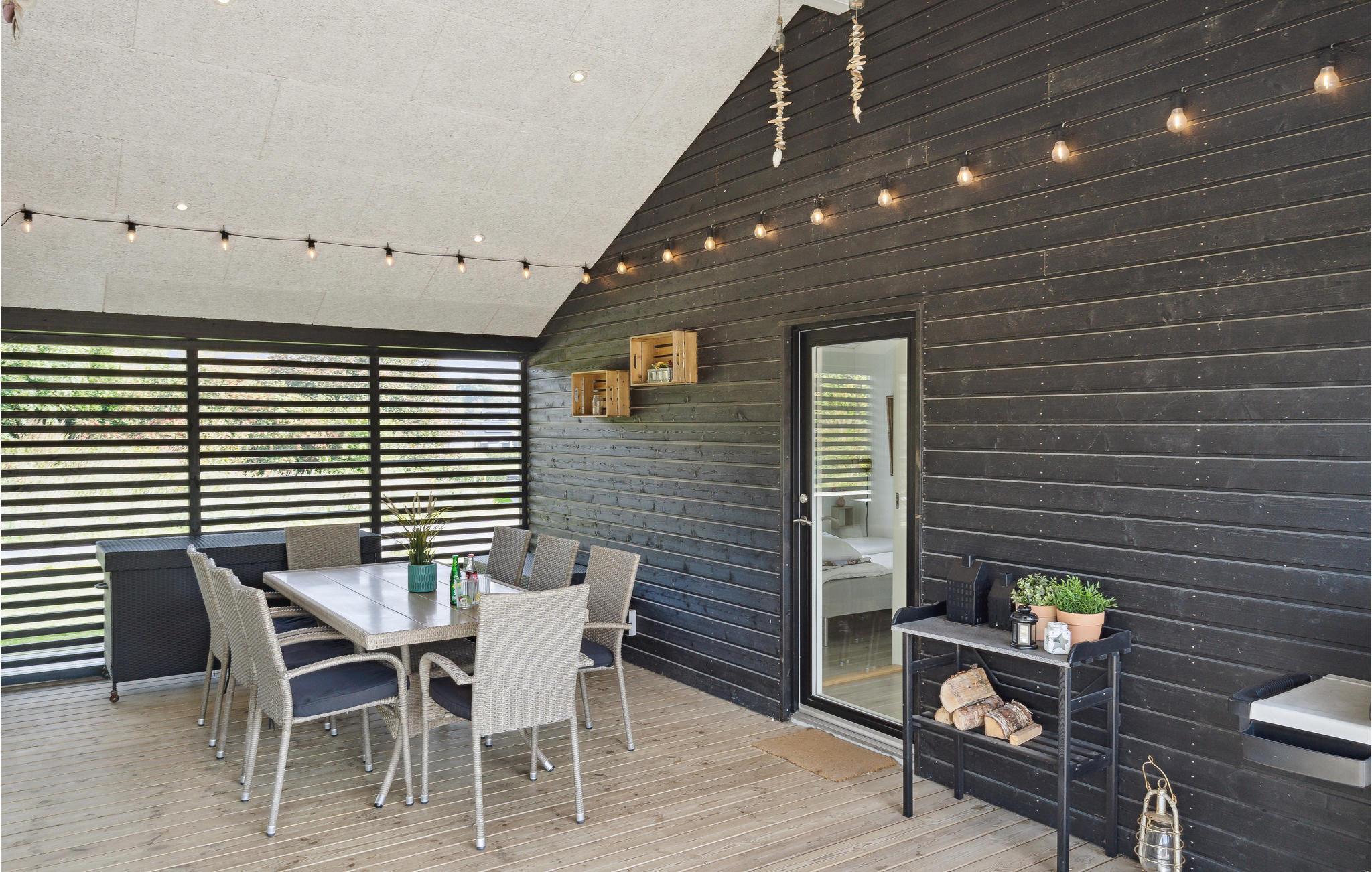 Spændende familievenligt træhus ved Kelstrup Strand med stor overdækket terrasse og spabad.