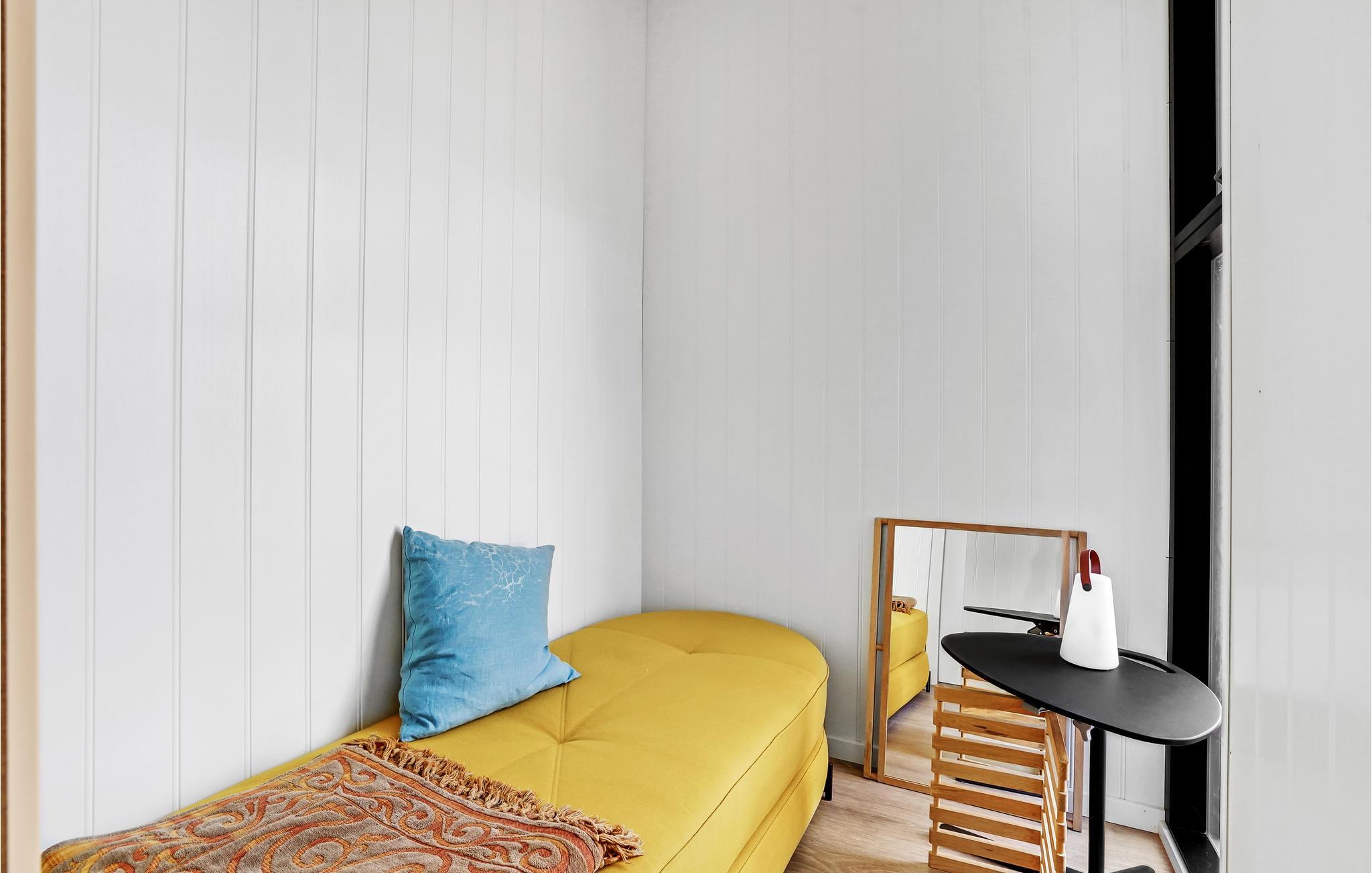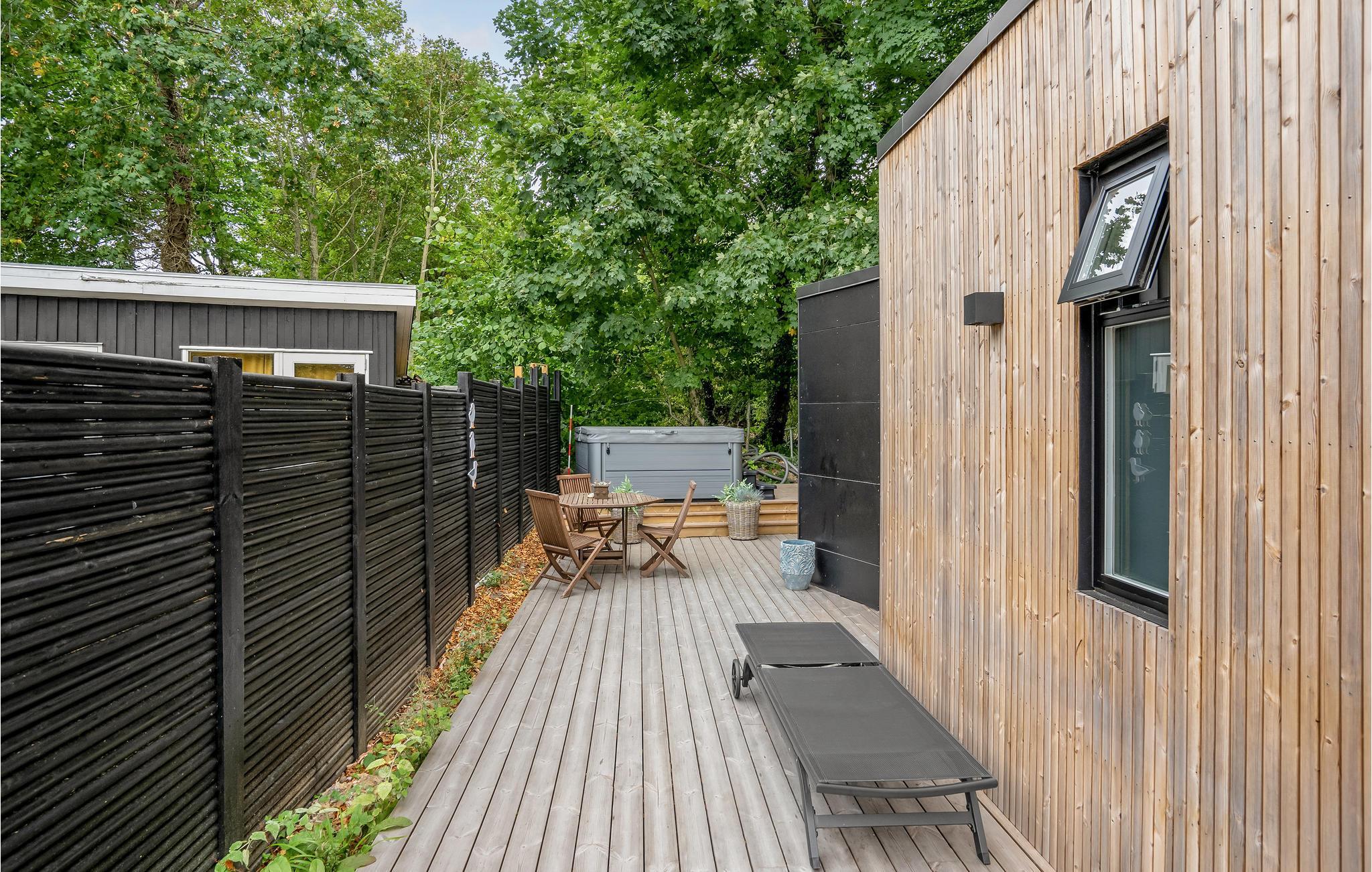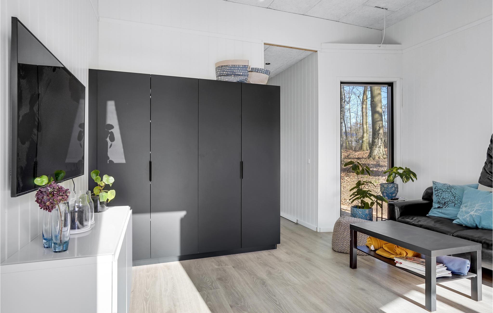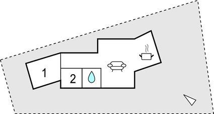 Soverummene er praktisk indrettede med en sovesofa og en vægseng, som, når den er pakket sammen som reol, giver nem udgang ud til terrassen. Den store, dejligt lyse terrasse løber omkring det meste af huset og byder masser af plads til afslapning og sommermåltider i det fri. Hvis vejret er dårligt, kan I også spise indenfor i stuen ved det lille spisebord, der kan slåes ud. Der er desuden en p-plads ved huset.