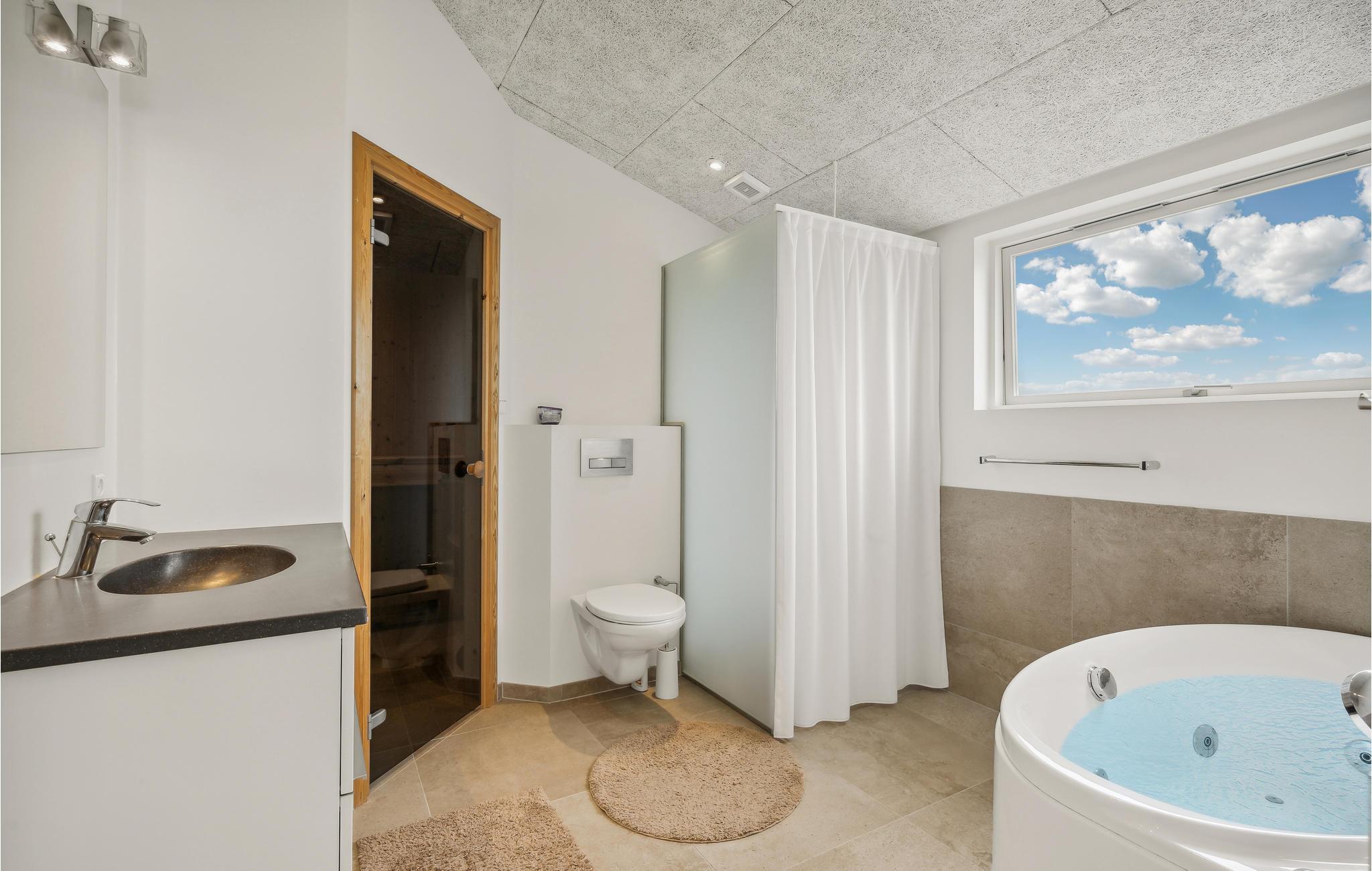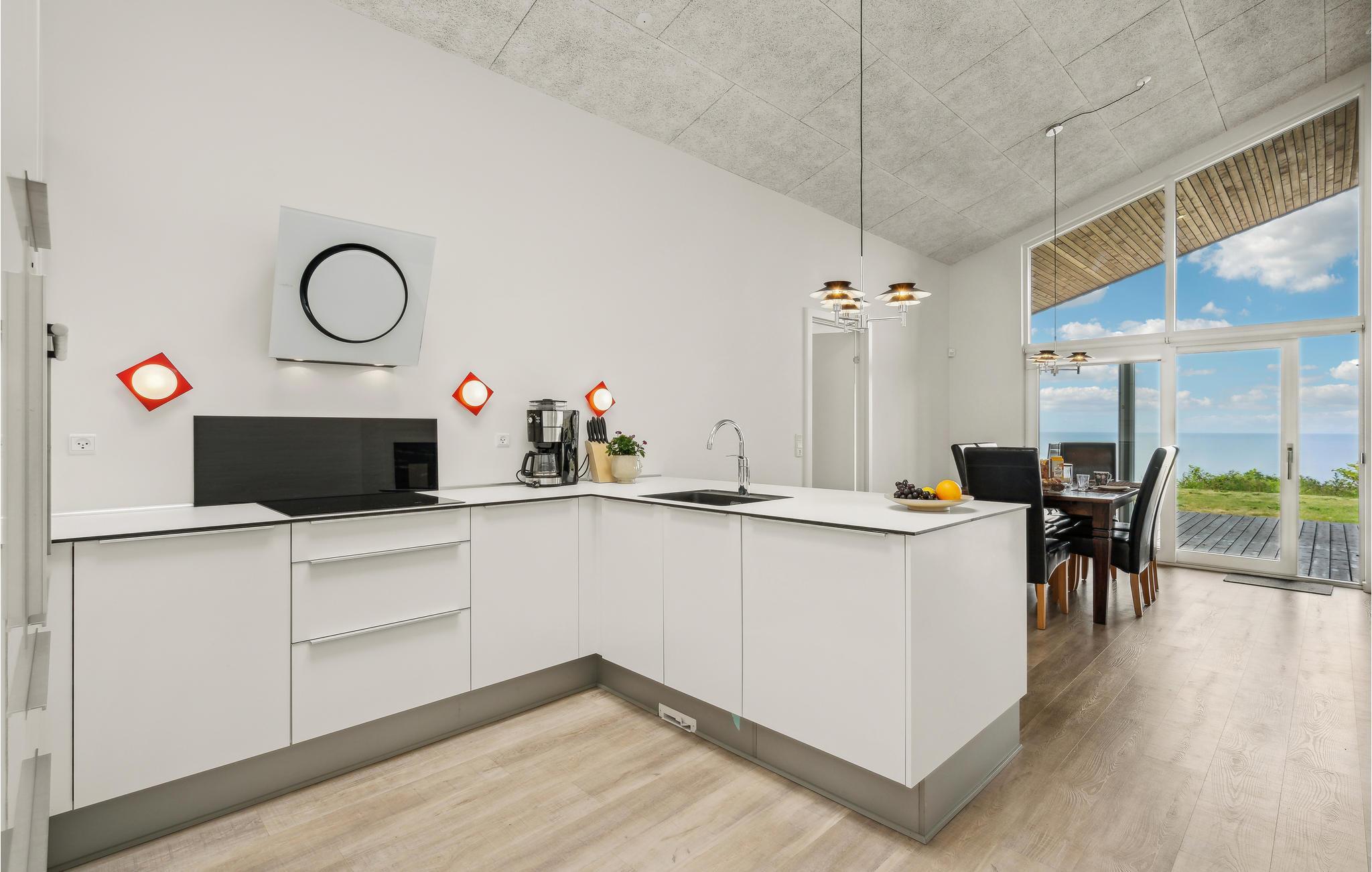 Leder I efter det perfekte feriehus i Kelstrup Strand, hvor alle familiemedlemmer kan koble af? Så har I fundet det helt rette sted! Dette indbydende hus med en lys og let atmosfære giver jer masser af plads til hyggeligt samvær med sjove aktiviteter. Den åbne stue med høje lofter, store panoramavinduer og en exceptionel lysgennemstrømning bliver det centrale mødested for familien. Særligt den store sofa vil med sikkerhed vække begejstring. Nyd varmen fra brændeovnen på en kølig dag eller aften og spil kort ved spisebordet. Det bliver en sand fornøjelse at dyste i madlavning i det moderne køkken. De fine retter kan I nyde på en af terrasserne. Hvis I vil slappe af, er der et boblebad og en sauna til rådighed. Gå ud i den dejlige have med havudsigt, spred armene ud, luk øjnene, hør børnenes latter og mærk følelsen af ferielykke. Lav snobrød over flammerne i bålfadet om aftenen. Fra huset kan børnene spæne ned til den kilometerlange sandstrand, som er et paradis for både store og små. Her er det også muligt at fiske.