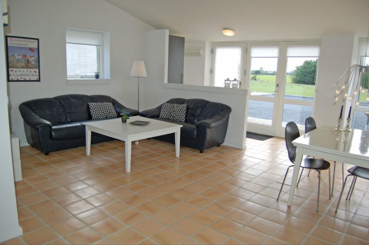 Fra stuen er der udgang til en privat terrasse med havemøbler med udsigt til søerne i Sybergland og golf/spa resortet Great Northern.