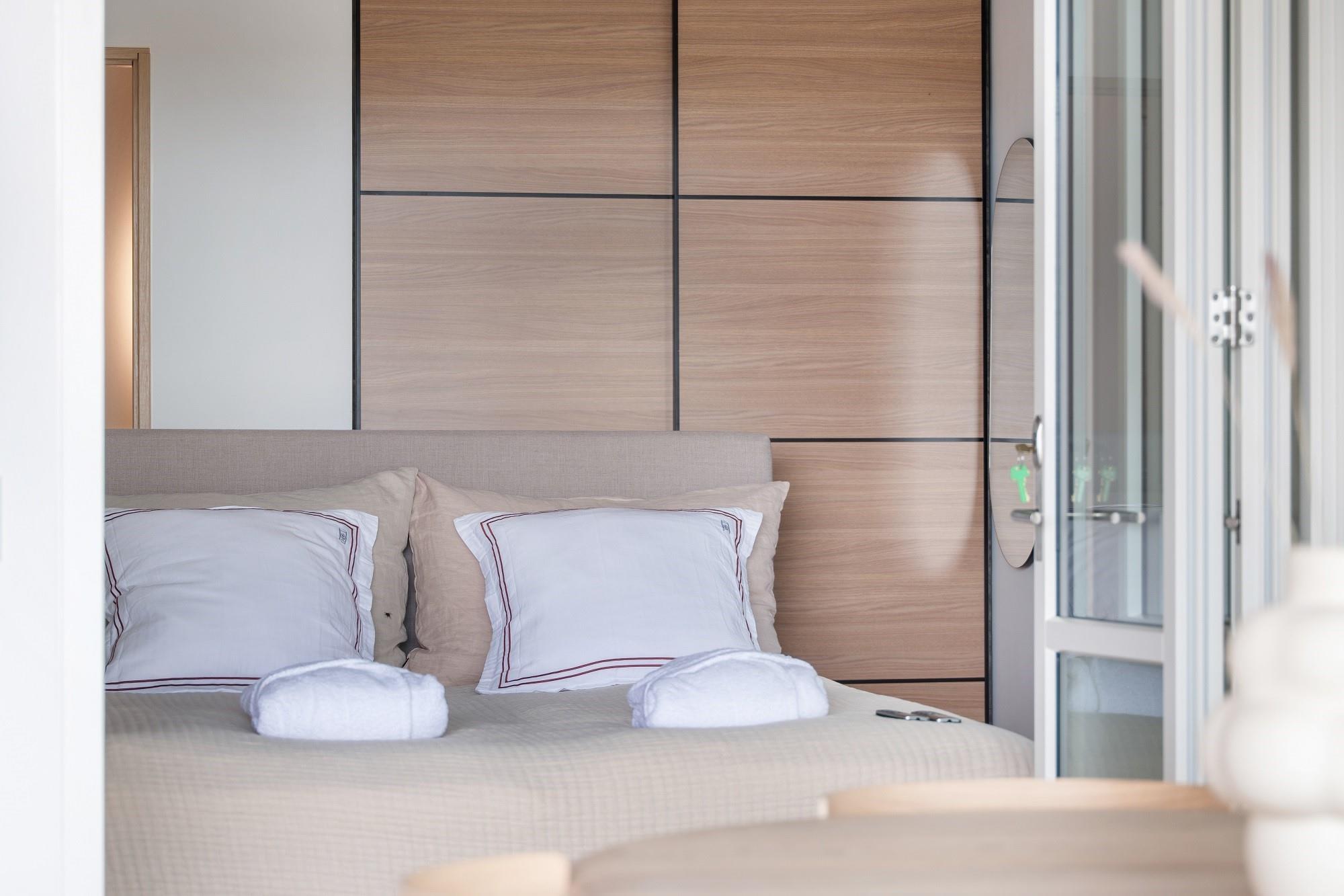 Boligen ligger i stueplan og er indrettet med smukt interiør og skønne detaljer. Fra stue og køkken har du adgang til den rummelige terrasse. På en lun sommerdag kan de store foldedøre skydes til side, så du får naturen og stranden helt tæt på. Boligen har 3 soveværelser, hvoraf de 2 er med dobbeltseng. Fra det ene dobbeltværelse kan du ligge i sengen og nyde solopgangen igennem det store glasparti, som vender mod stuen. Dette værelse har direkte adgang til eget badeværelse. Boligens andet badeværelse kan tilgås fra gangen. Boligen har Smart-TV med mulighed for streaming (ingen TV-programmer).
