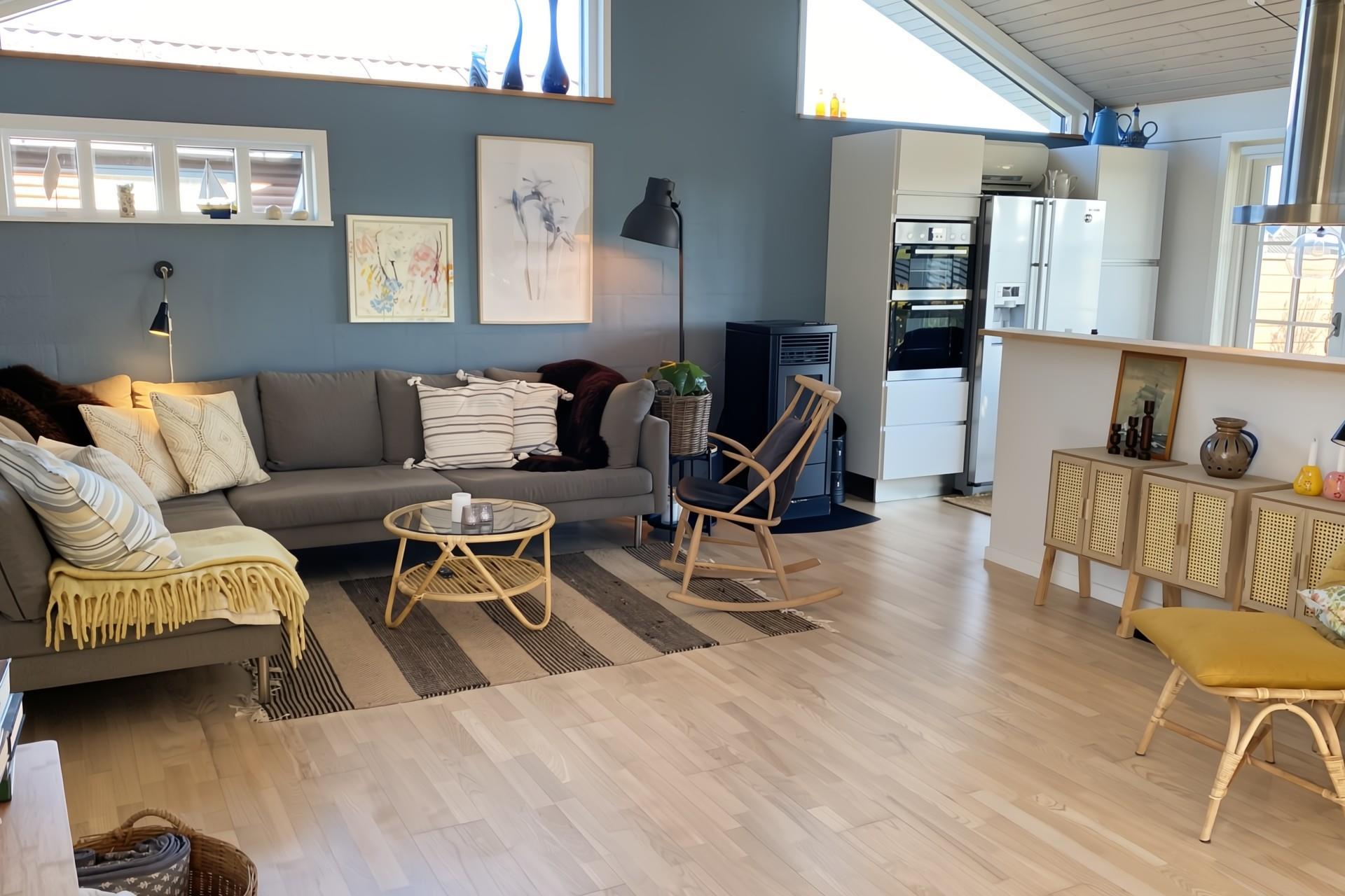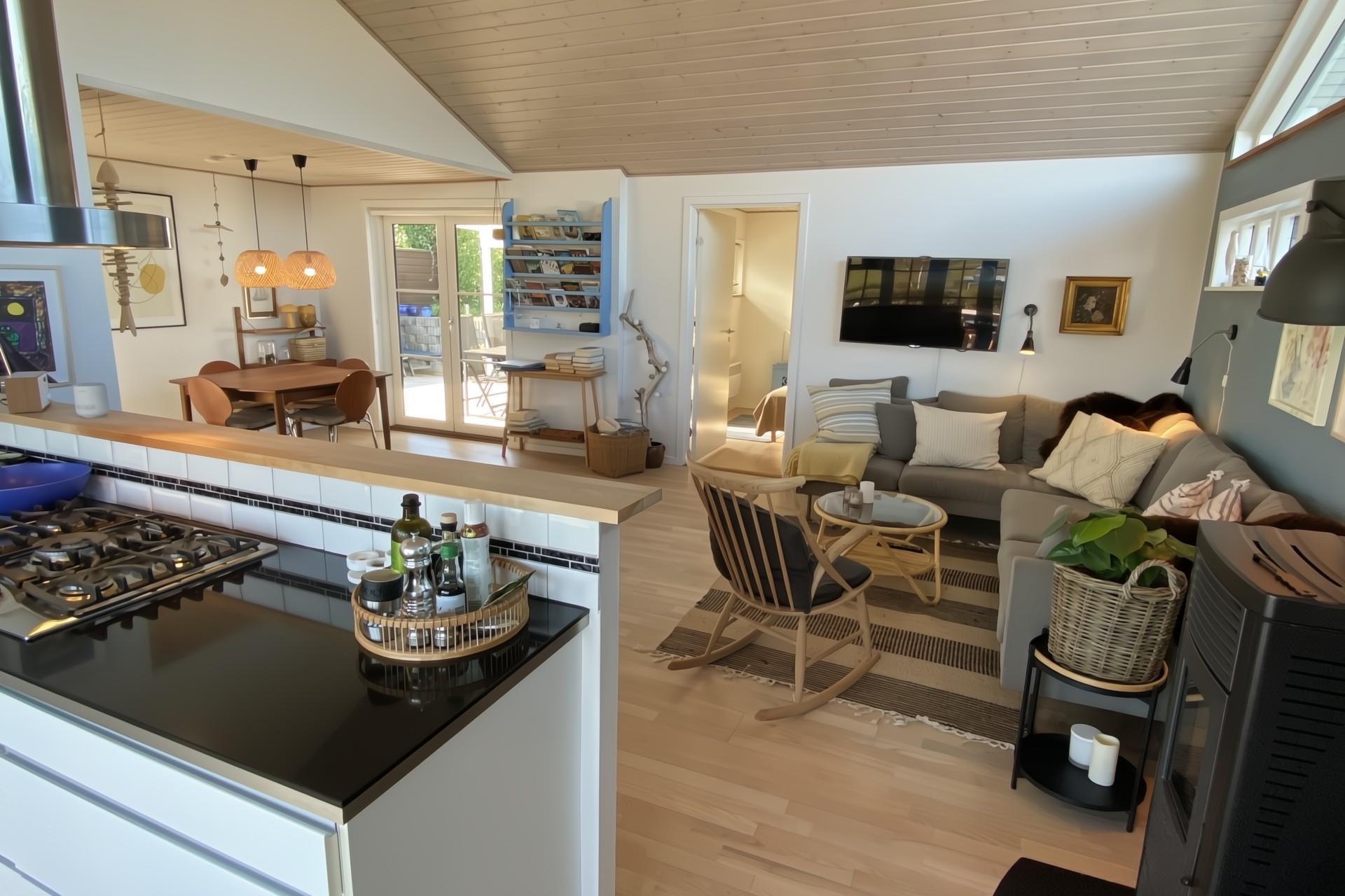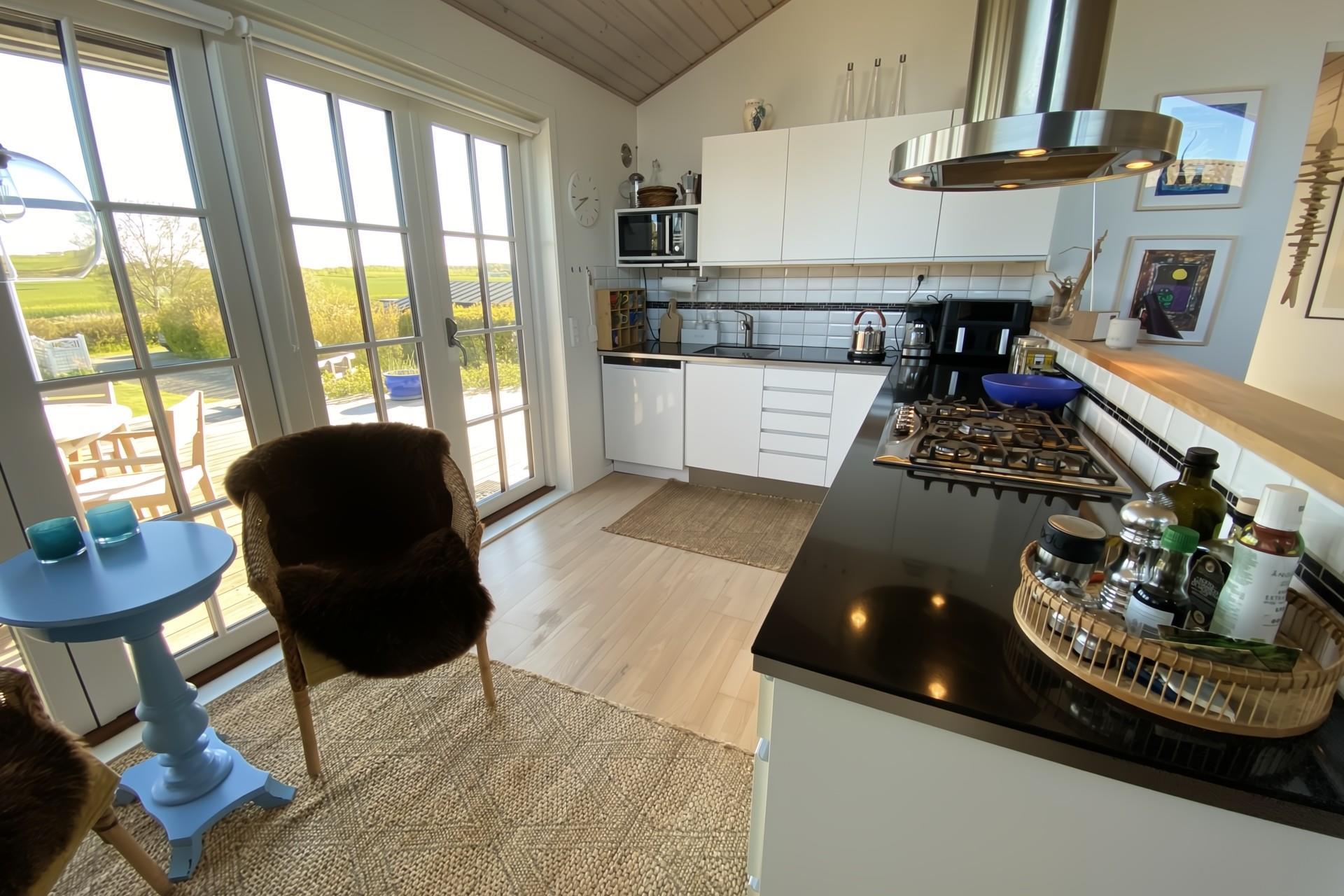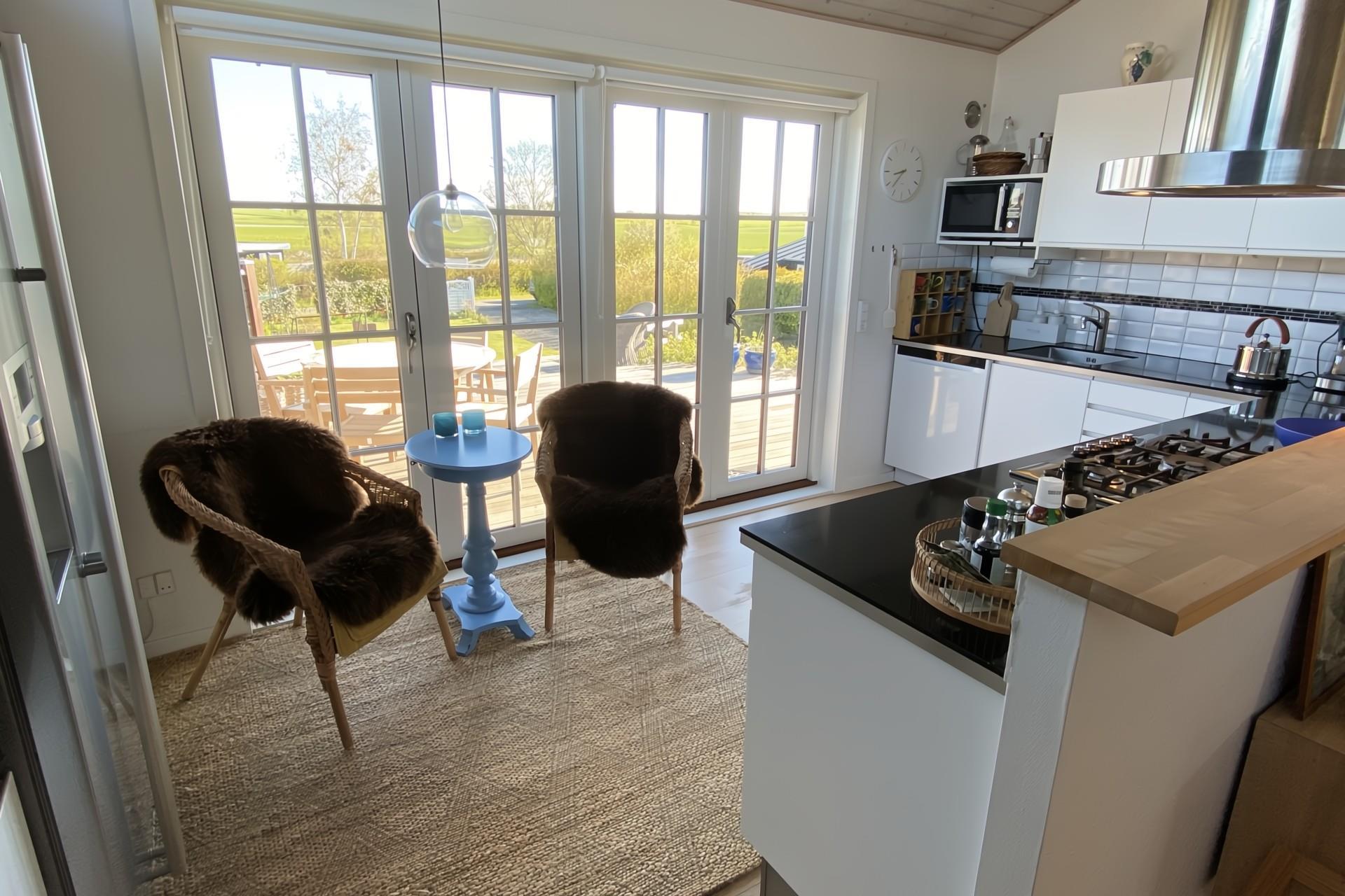 Huset byder på en rummelig og lys opholdsstue i åben forbindelse med køkkenet samt loft til kip, der skaber en dejlig atmosfære. Det moderne køkken er veludstyret med amerikanerkøleskab med isterningemaskine og gaskomfur, og herfra er der direkte udgang til forhaven med udsigt over det naturskønne landskab. Fra stuen er der adgang til en skøn, overdækket terrasse, hvor privatlivet kan nydes i ro og fred – med sol det meste af dagen.