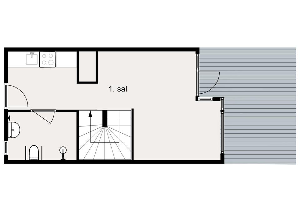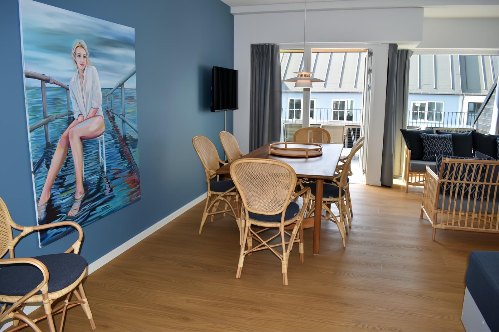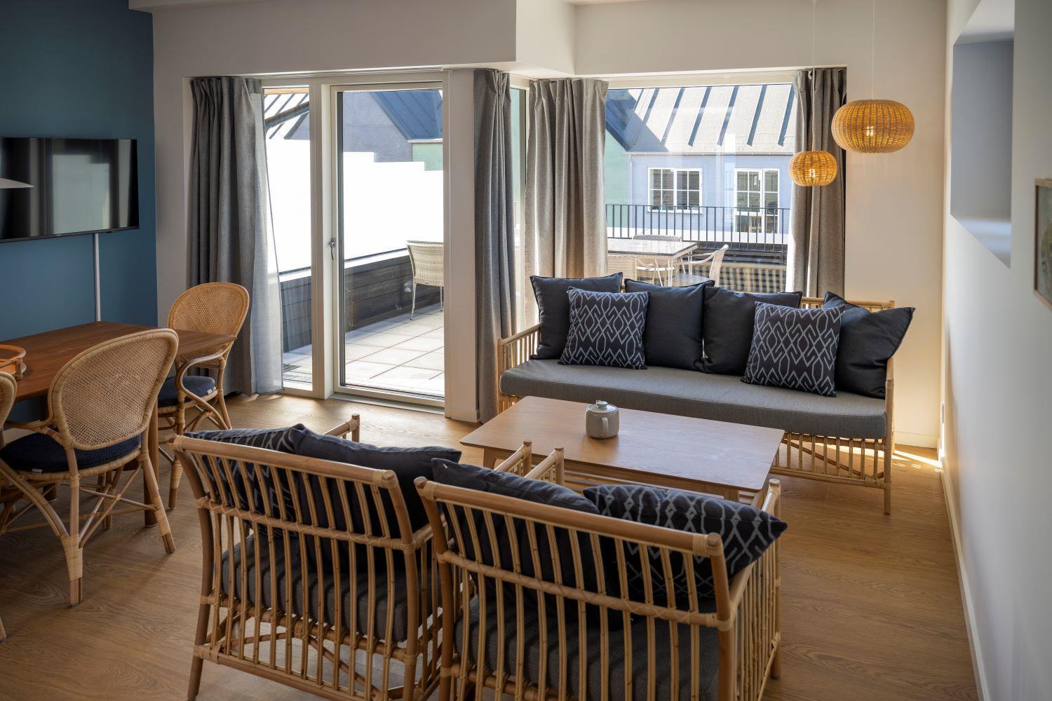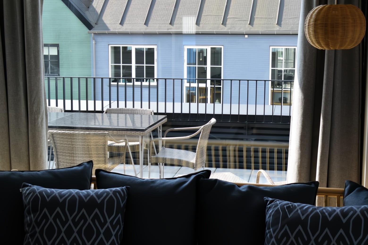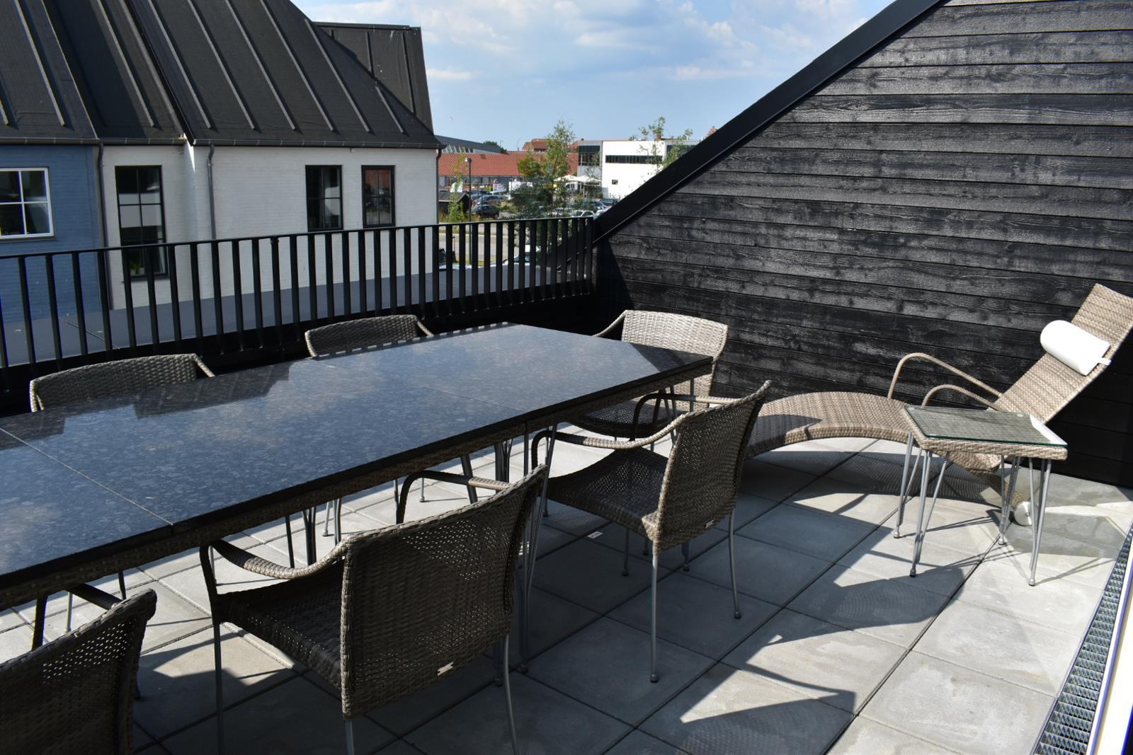 Fra stuen er der udgang til en stor, privat terrasse, hvor komfortable havemøbler indbyder til afslapning og hyggelige stunder. Fra terrassen er der kig til havnen og byen.