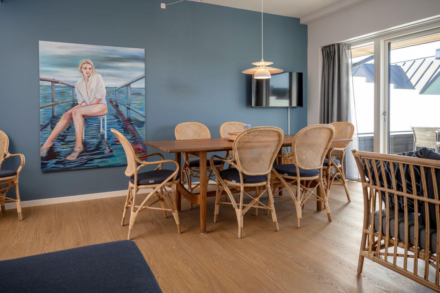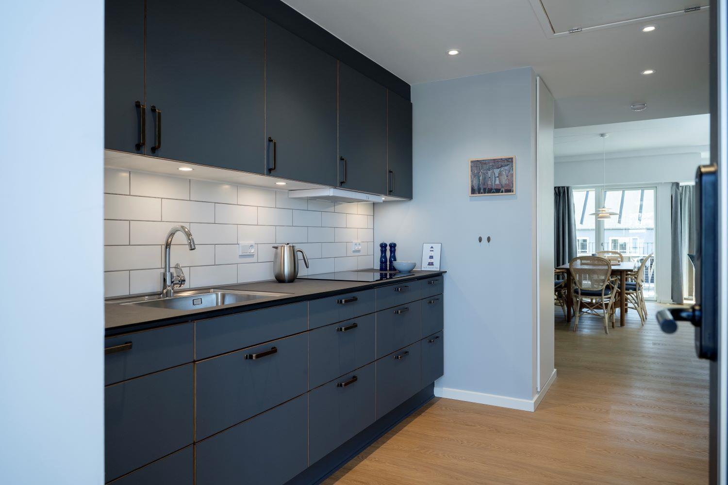 Nyopført og moderne ferielejlighed til 7 pers. beliggende ved Kerteminde Havneferie. Lejligheden strækker sig over både 1. og 2. sal og er indrettet med fokus på komfort og kvalitet. På 1. sal finder du en lys stue med smart-TV og en sovesofa, et veludstyret køkken samt et stort, handicapvenligt badeværelse med gulvvarme. På 2. sal er der endnu et badeværelse med bruser og gulvvarme samt tre komfortable soveværelser: to med hver en dobbeltseng og et med to enkeltsenge.