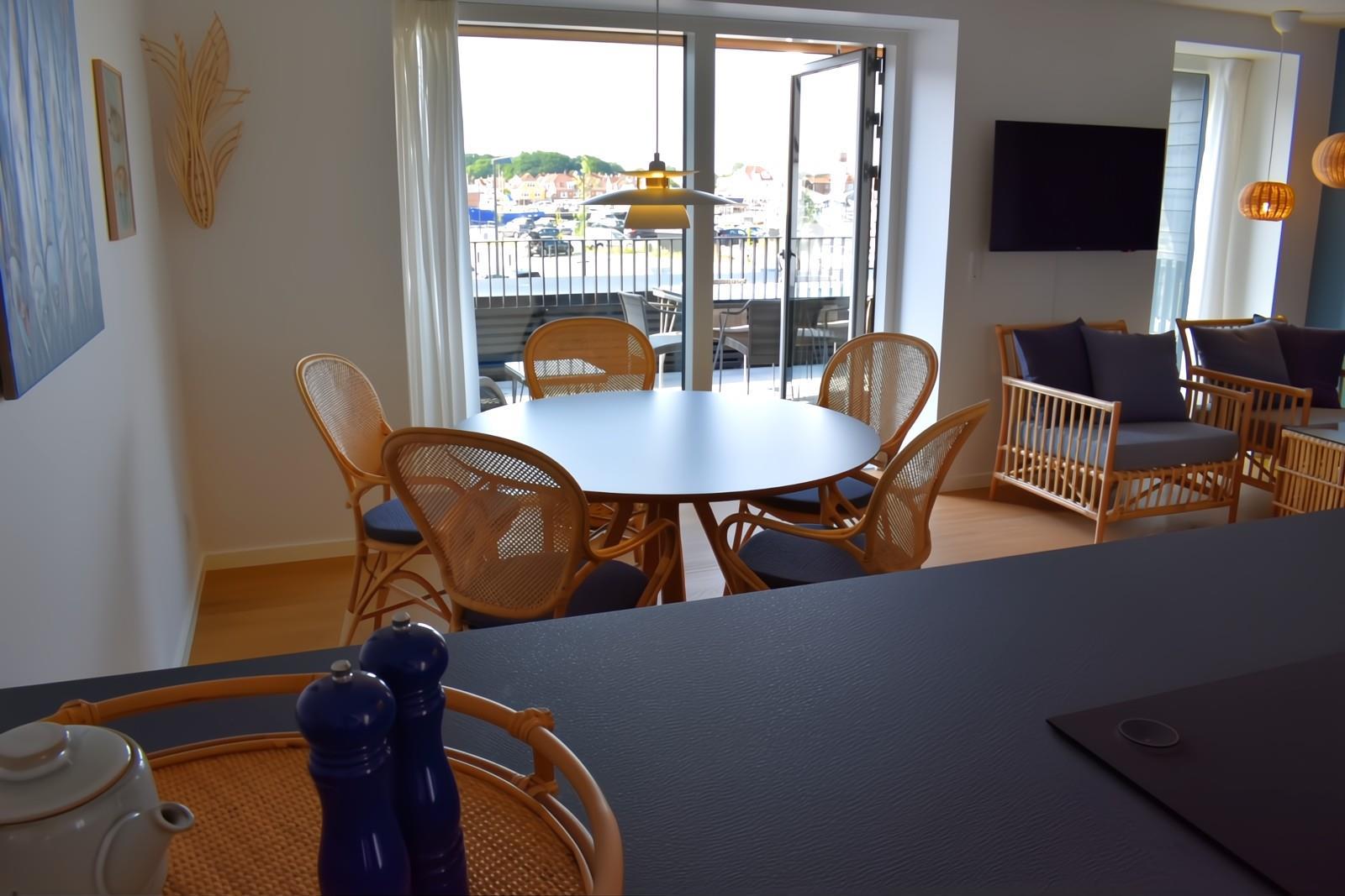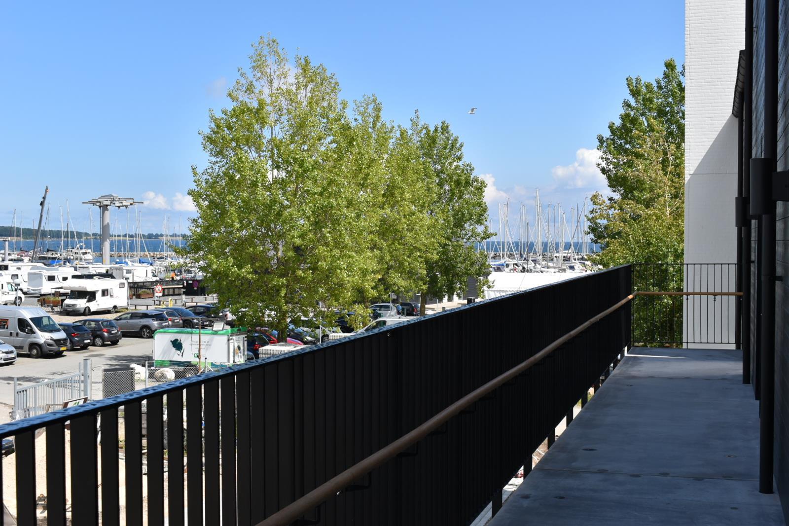 Fra stuen er der udgang til en privat terrasse, hvor komfortable havemøbler indbyder til afslapning og hyggelige stunder. Fra terrassen er der kig til havnen og byen.