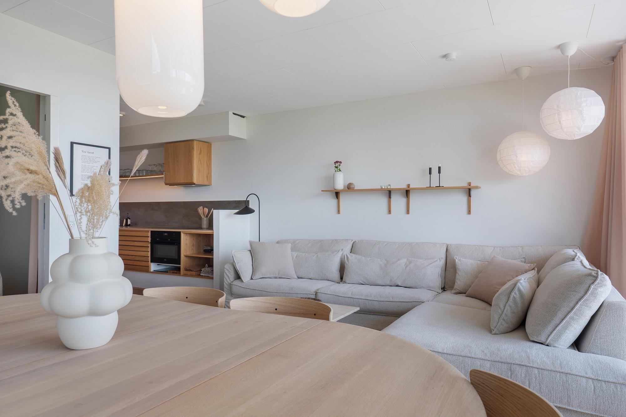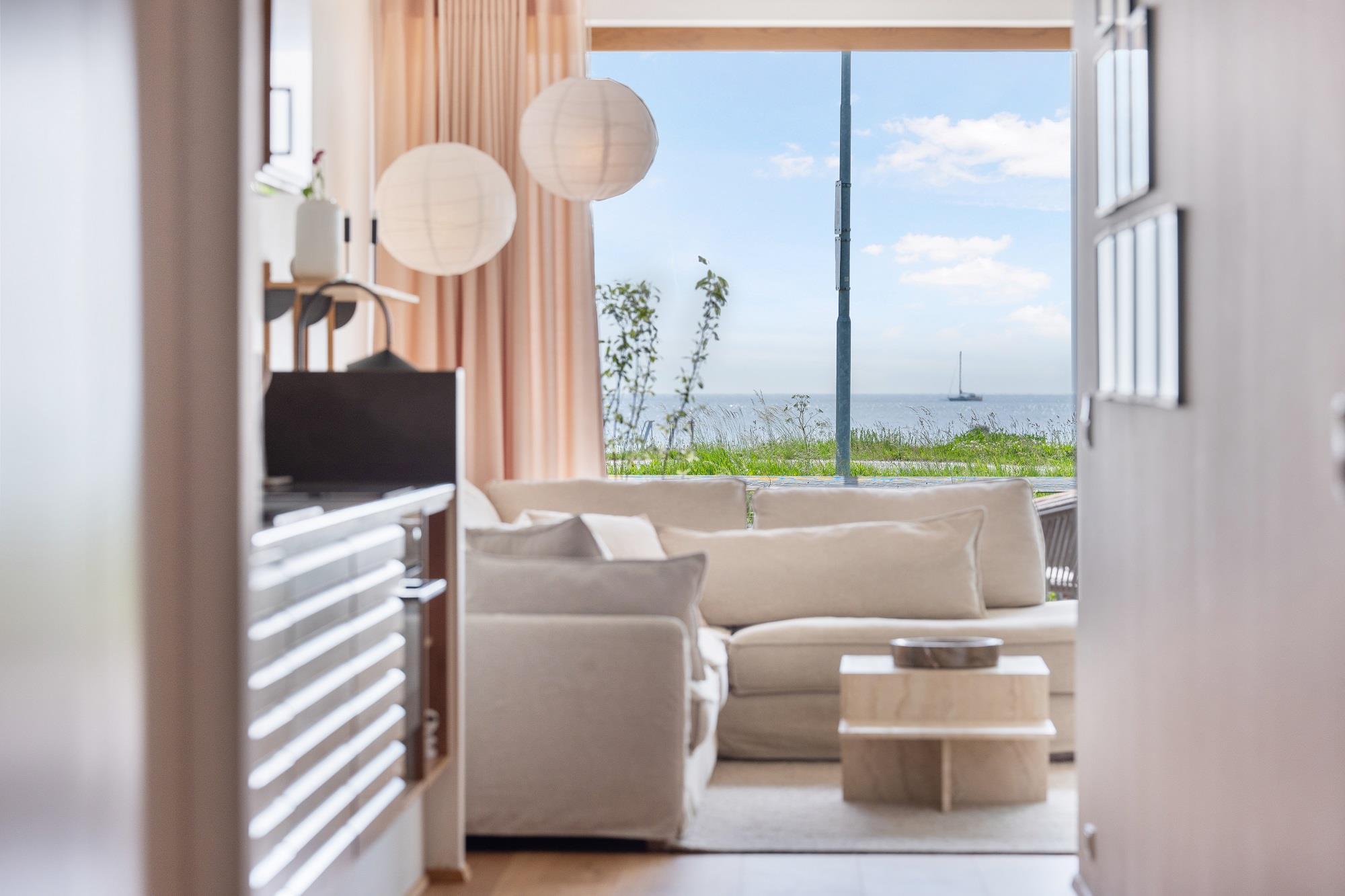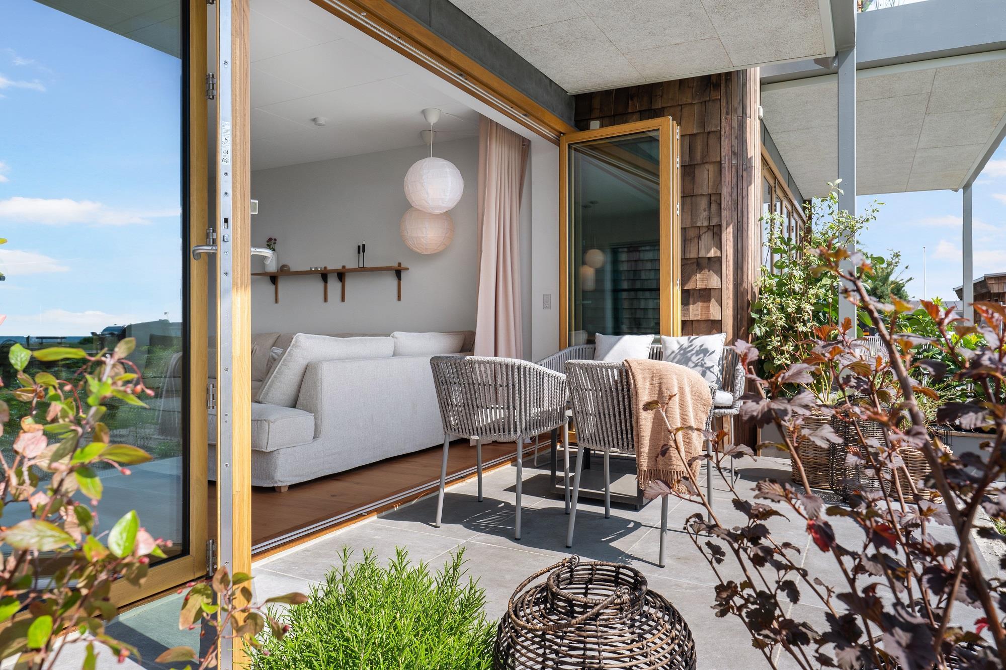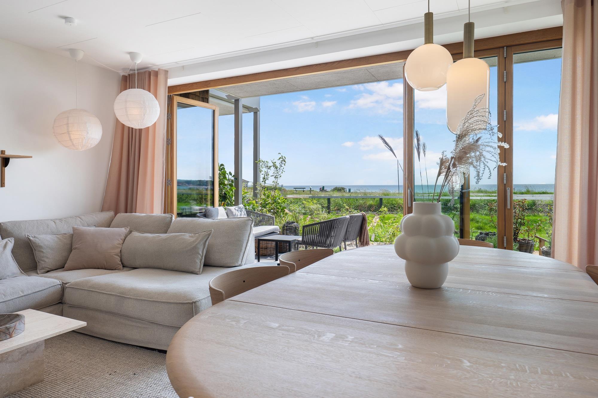 Boligen ligger i stueplan og er indrettet med smukt interiør og skønne detaljer. Fra stue og køkken har du adgang til den rummelige terrasse. På en lun sommerdag kan de store foldedøre skydes til side, så du får naturen og stranden helt tæt på. Boligen er indrettet med 1 soveværelse med en dobbeltseng samt et dejligt stort badeværelse. Boligen har smart TV med mulighed for streaming (ingen TV-programmer).