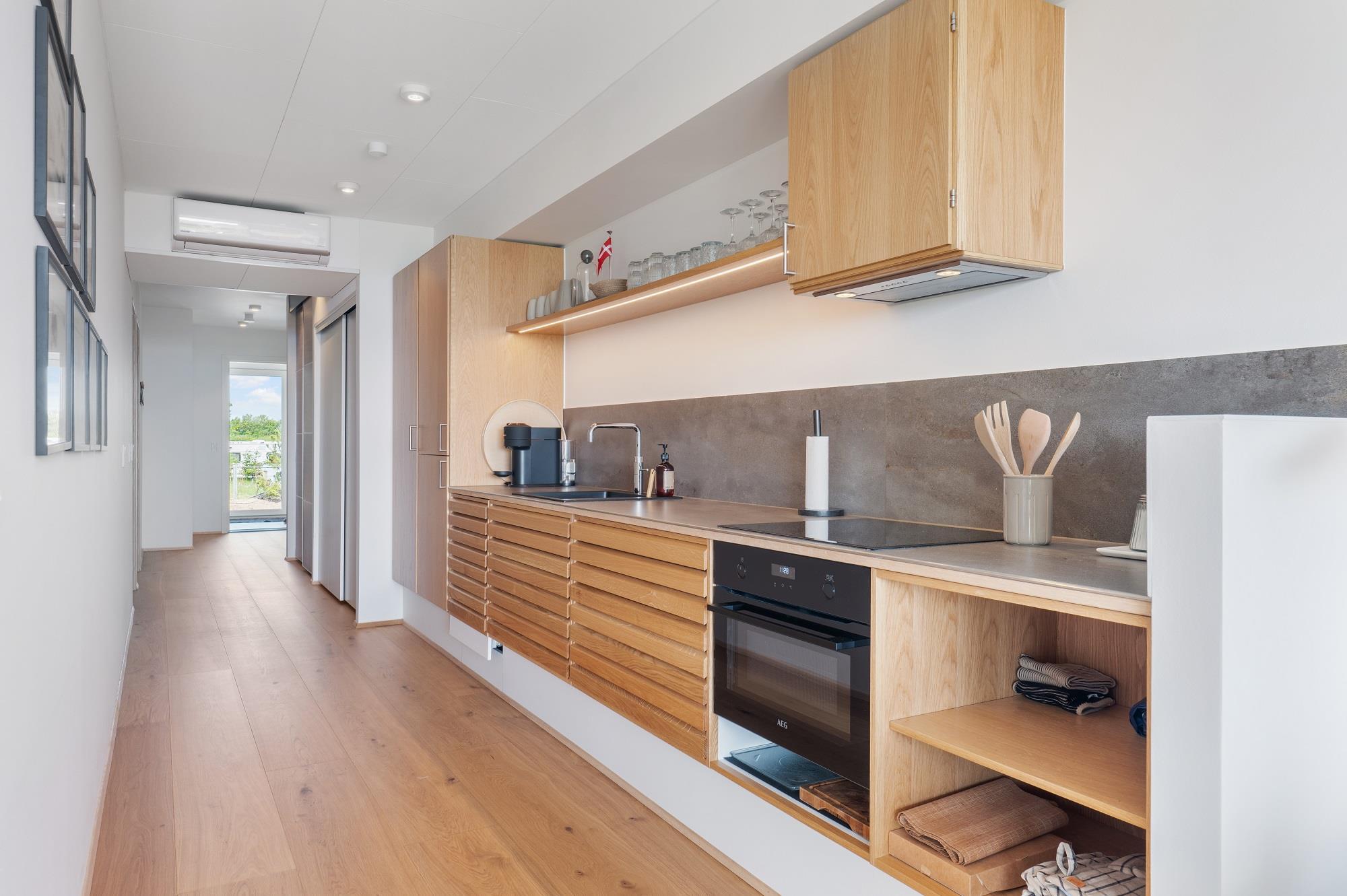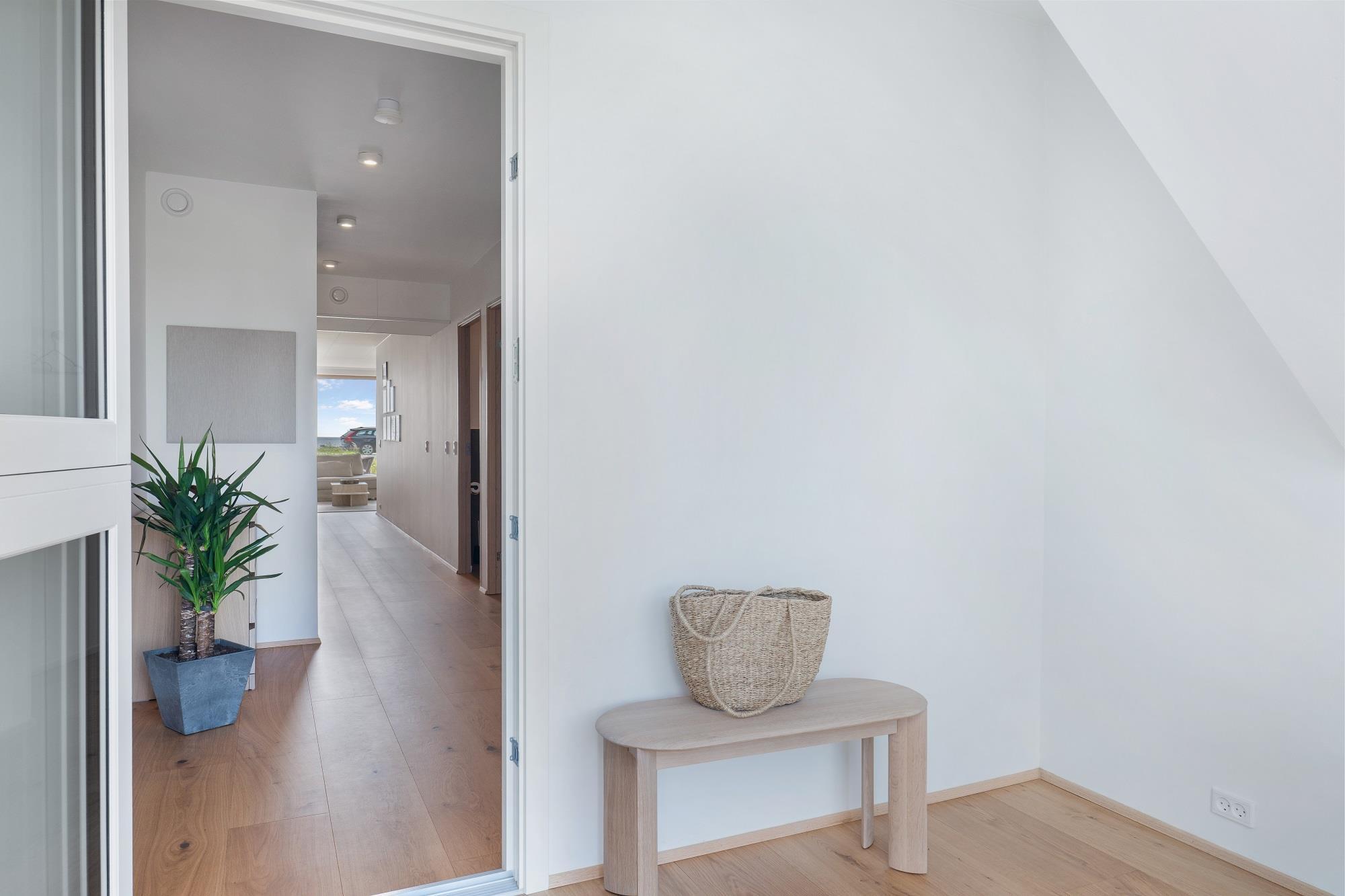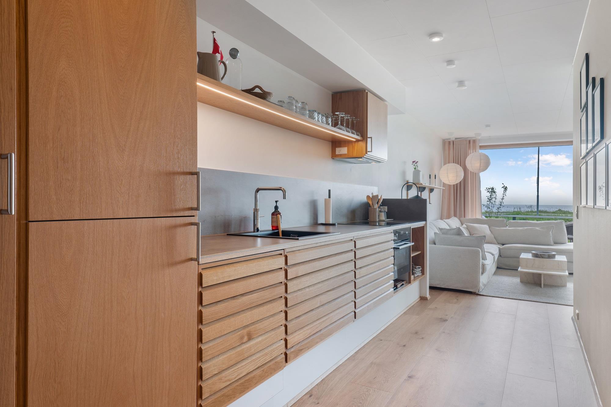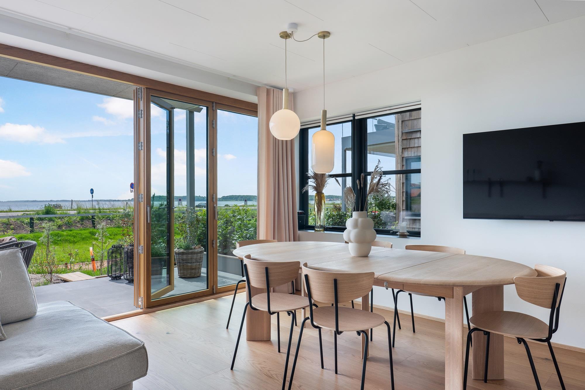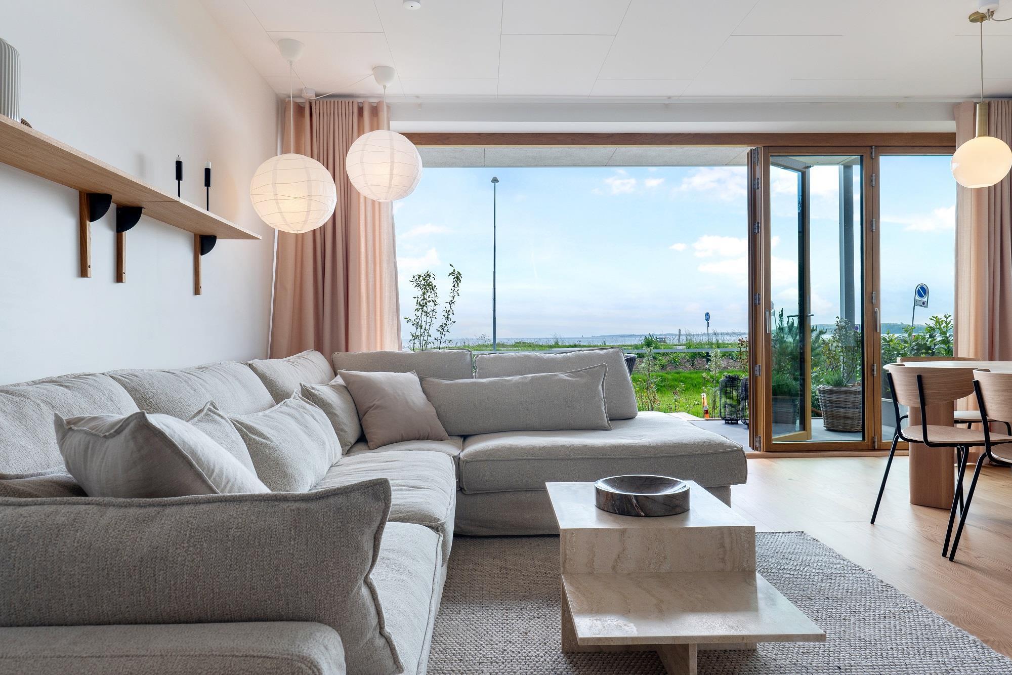 Boligen ligger i stueplan og er indrettet med smukt interiør og skønne detaljer. Fra stue og køkken har du adgang til den rummelige terrasse. På en lun sommerdag kan de store foldedøre skydes til side, så du får naturen og stranden helt tæt på. Boligen er indrettet med 1 soveværelse med en dobbeltseng samt et dejligt stort badeværelse. Boligen har smart TV med mulighed for streaming (ingen TV-programmer).