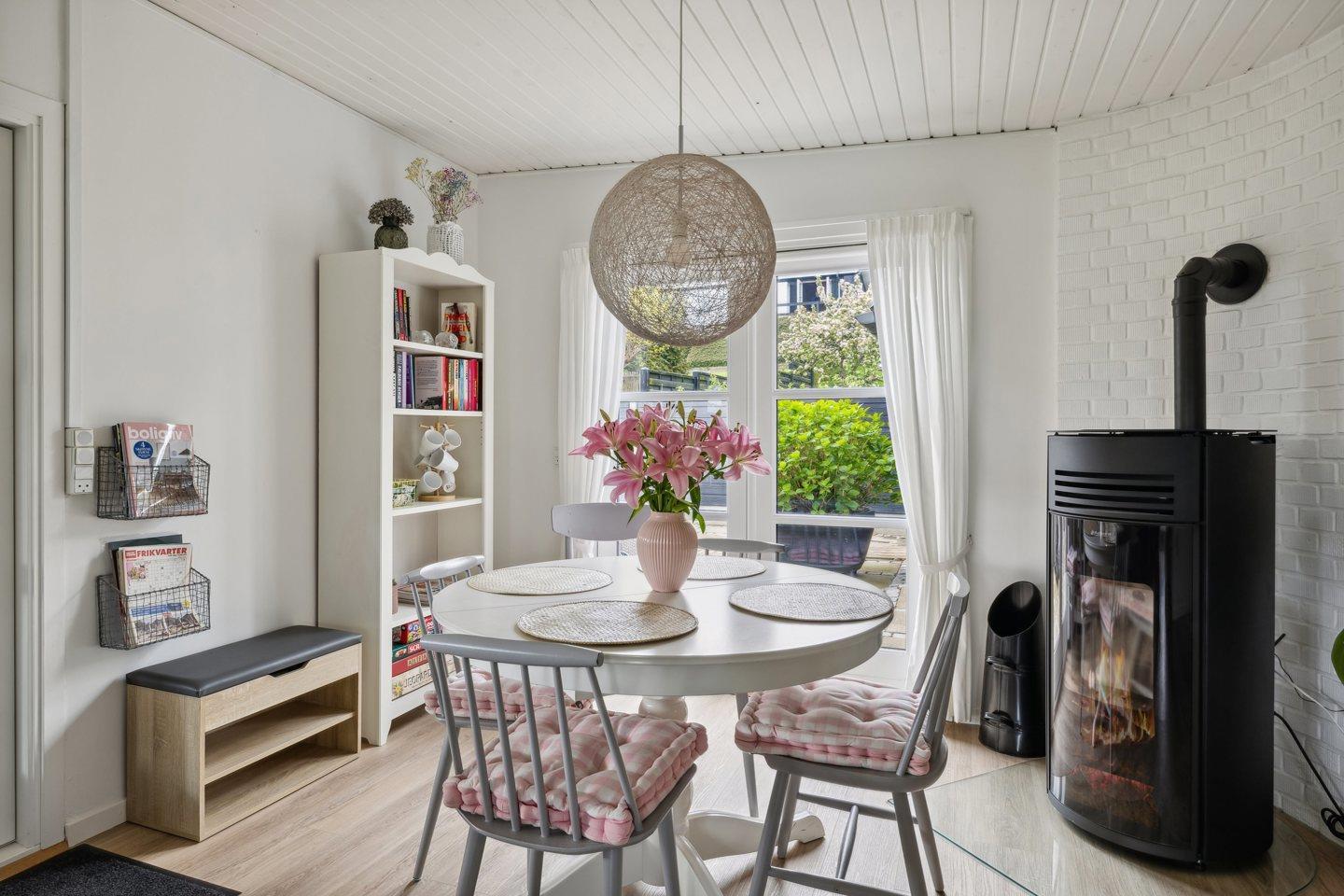 Sommerhuset har energibesparende pilleovn og varmepumpe. Det er muligt at købe træpiller til pilleovnen i sommerhuset.