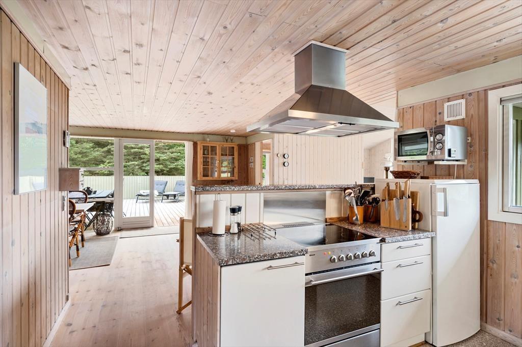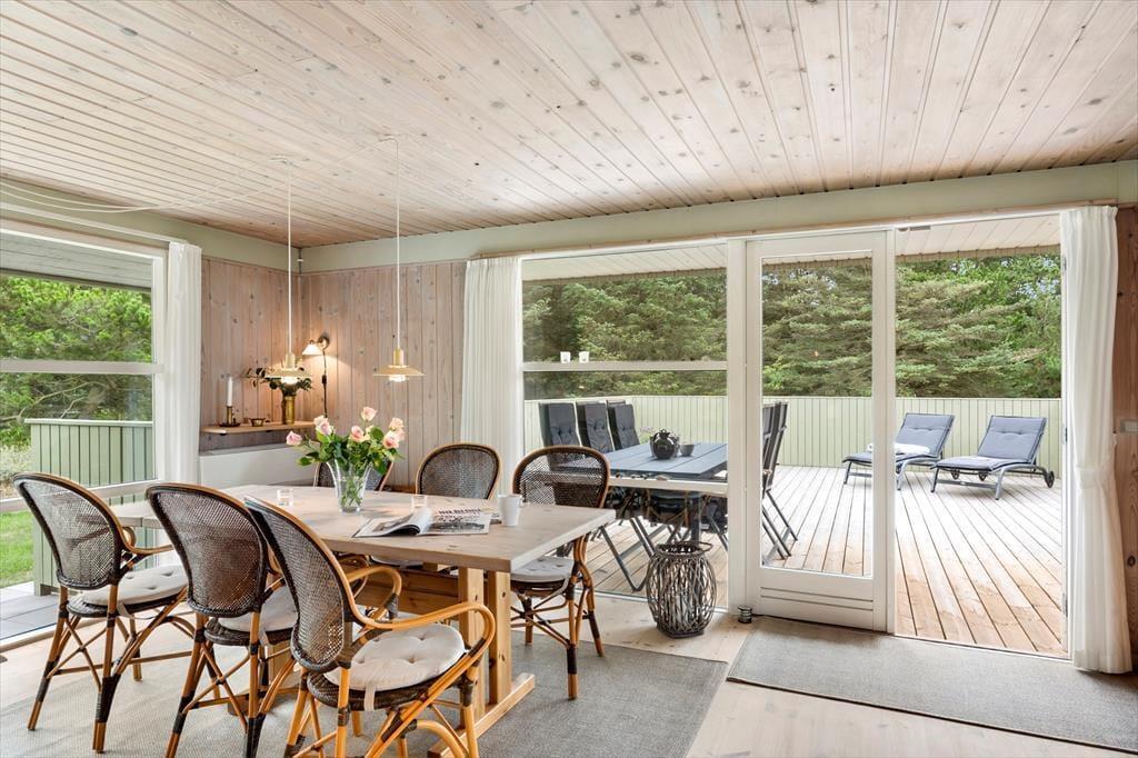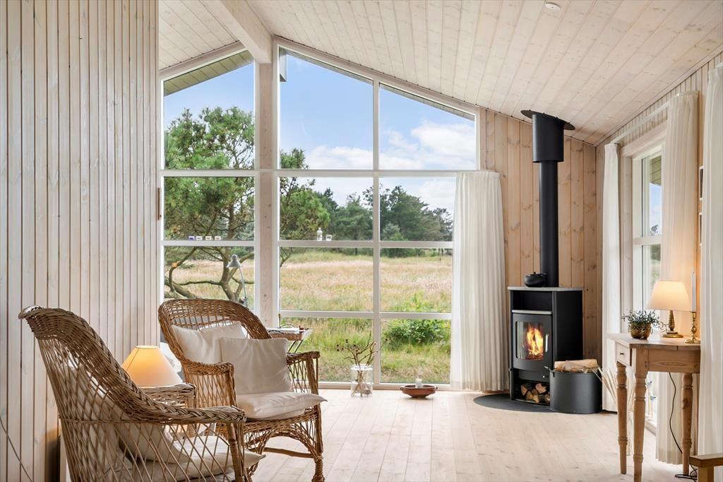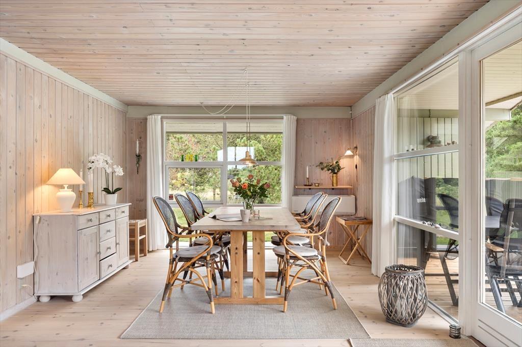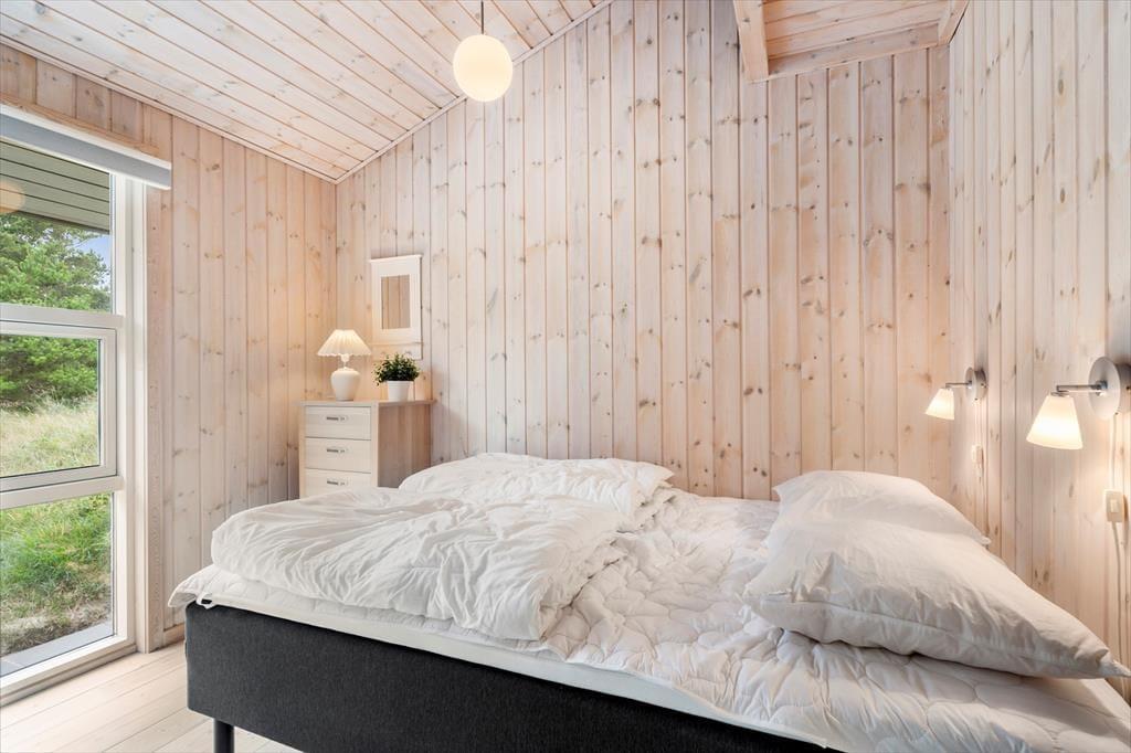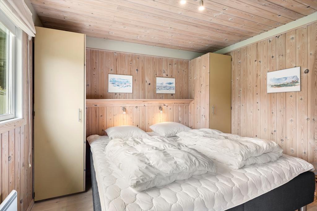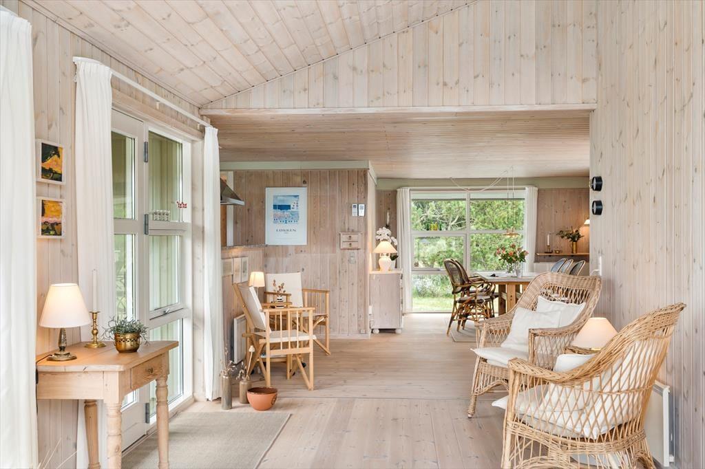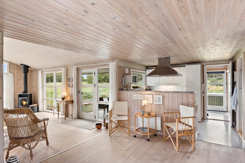 Sommerhuset byder dig velkommen med et skønt lysindfald og en indretning, hvor der er kræset for detaljerne. De store vinduespartier inviterer naturen helt tæt på og skaber en let og indbydende atmosfære i hele huset. Hjertet af sommerhuset er opholdsrummet, hvor køkken og stue er smeltet sammen i ét hyggeligt miljø. Her kan du lave mad i det åbne køkken, mens du følger med i børnenes brætspil eller sludrer med dem, der slapper af i sofaen. Når mørket falder på, lægger rummet op til ægte sommerhushygge med stearinlys og varme tæpper. Huset har tre gode soveværelser med plads til hele familien – og måske et par gæster. Badeværelset er lækkert og indbydende, og der er skruet op for komforten, så ferien kan nydes i fulde drag fra første dag.