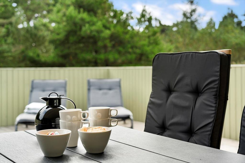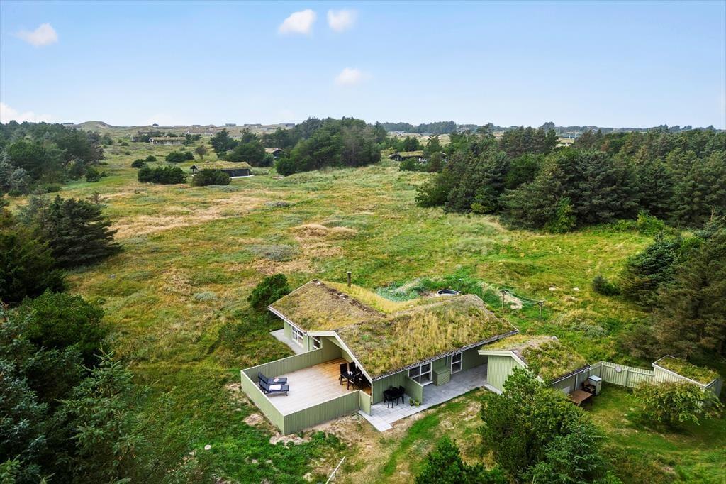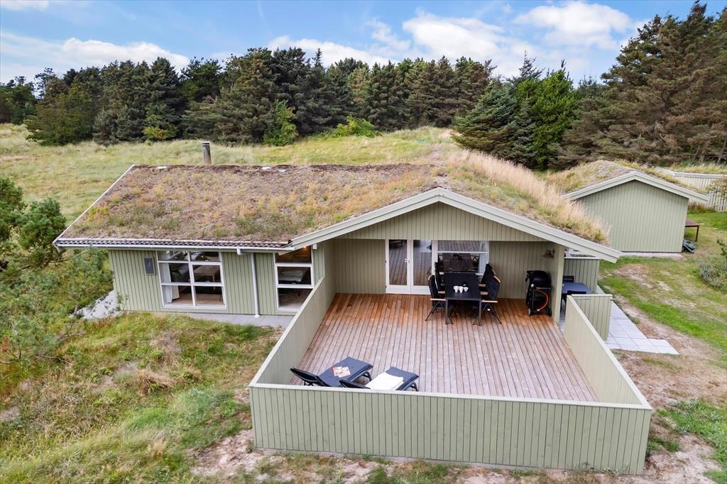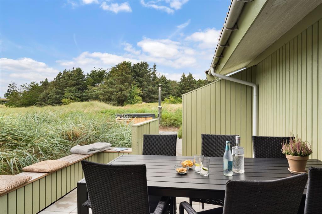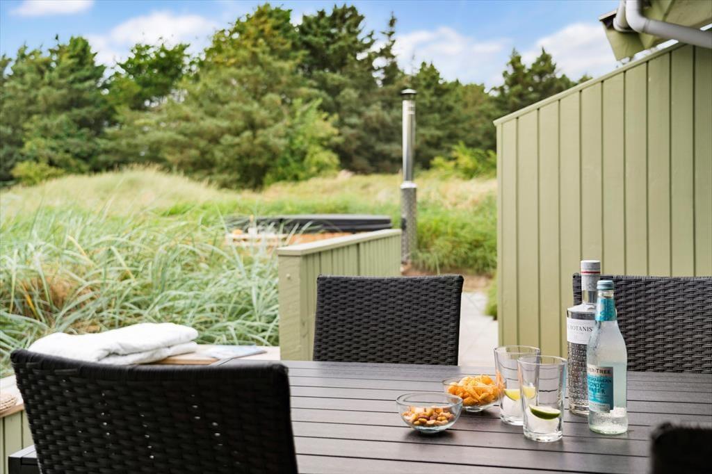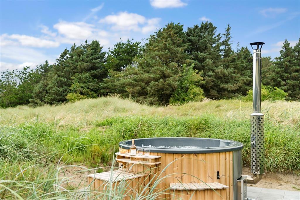Når vejret viser sig fra sin bedste side – og det gør det ofte i Kettrup Bjerge – er det udenfor, ferielivet leves. Her får du flere store, lækre terrasser, hvor der er plads til både solbadning, grillmiddage og afslappende stunder med en god bog i skyggen. Terrasserne vender i forskellige retninger, så du altid kan finde læ, sol eller skygge alt efter humør og tidspunkt på dagen. Prikken over i’et er det lækre vildmarksbad, der står klar under åben himmel. Her kan du læne dig tilbage i det varme vand og mærke roen sænke sig, mens du kigger ud over det enestående landskab, der omgiver sommerhuset. Naturen her er noget helt særligt – kuperet, vild og smuk – og den kan nydes i al sin pragt direkte fra terrassen eller fra stierne, der snor sig gennem området.