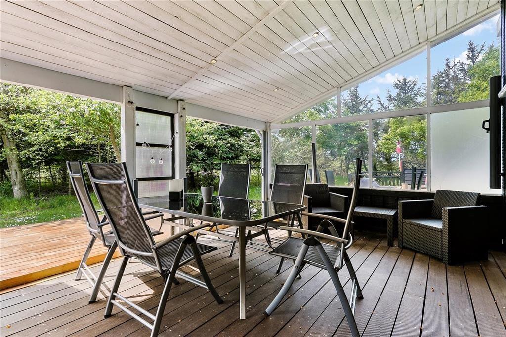 Dette ældre sommerhus byder på alle nødvendige faciliteter for en god og afslappende ferie. Et åbent køkken med direkte adgang til en dejlig og stor udestue med spiseplads og sidde arrangement. Her vil man med garanti komme til at bruge mange timer og når vejret indbyder til det, kan man herfra gå ud i en lille hyggelig solgård. I opholdsrummet finder man to sofaer med mange siddepladser og en god brændeovn, og også herfra kan man gå ud på en overdækket terrasse. Med tre værelser, hvoraf kun det ene har skabsplads, kan man overnatte 6 personer i sommerhuset og på badeværelset har man bruser, gulvvarme og en vaskemaskine. En god base for den næste familieferie i Nordjylland.