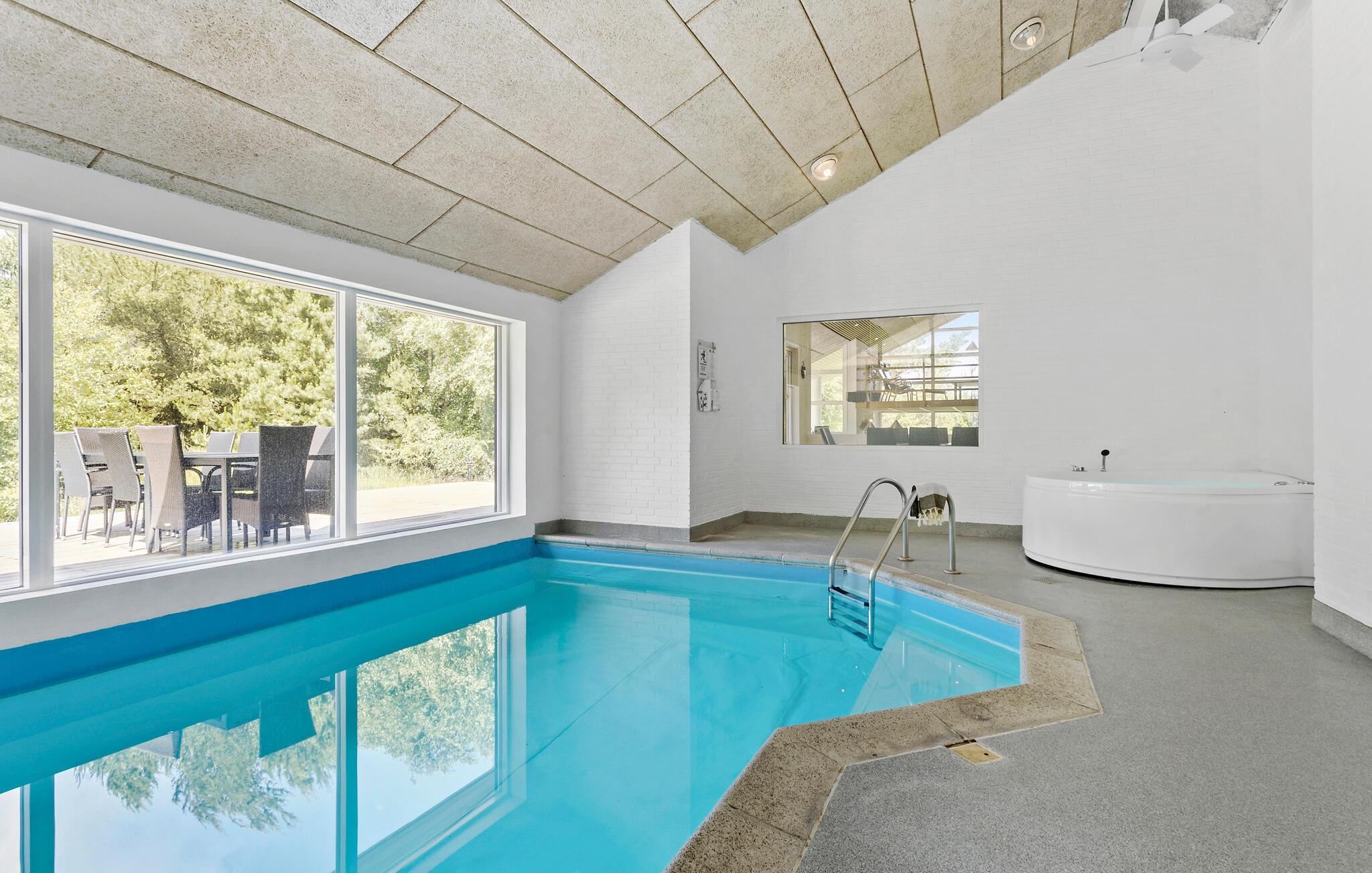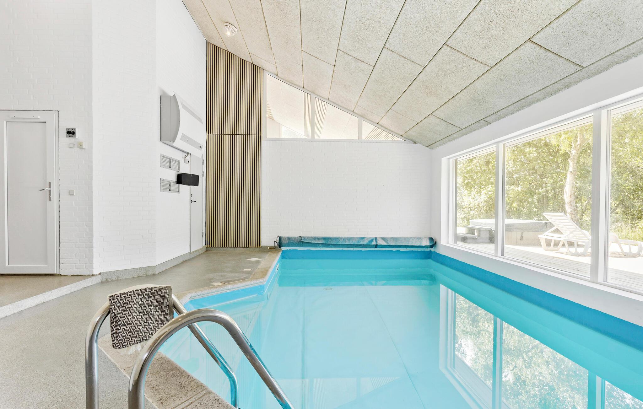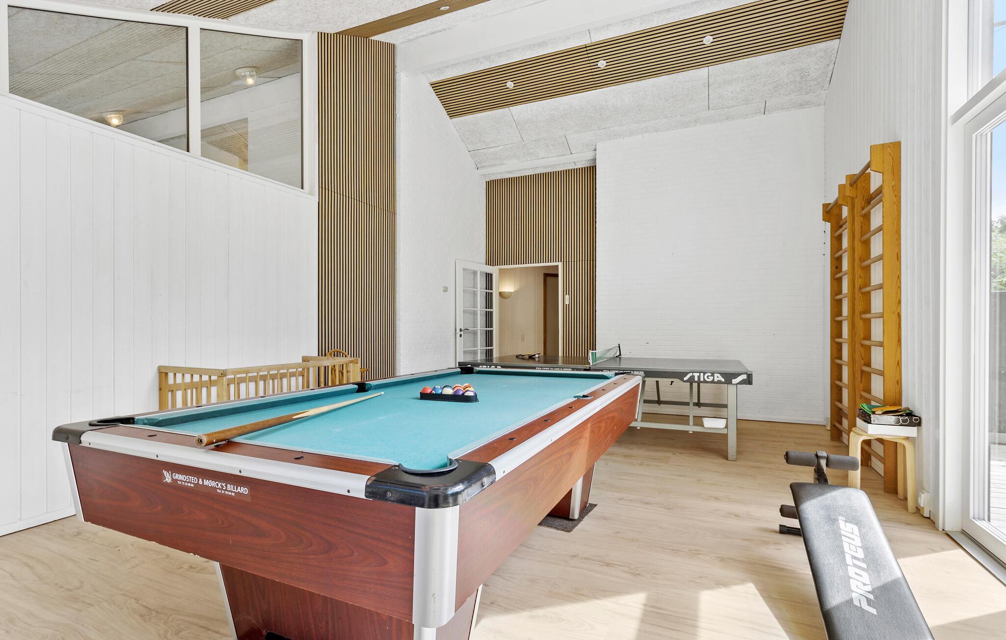 Stort feriehus ved Kjul Strand med swimmingpool, spabad, aktivitetsrum og tæt på hvid sandstrand.