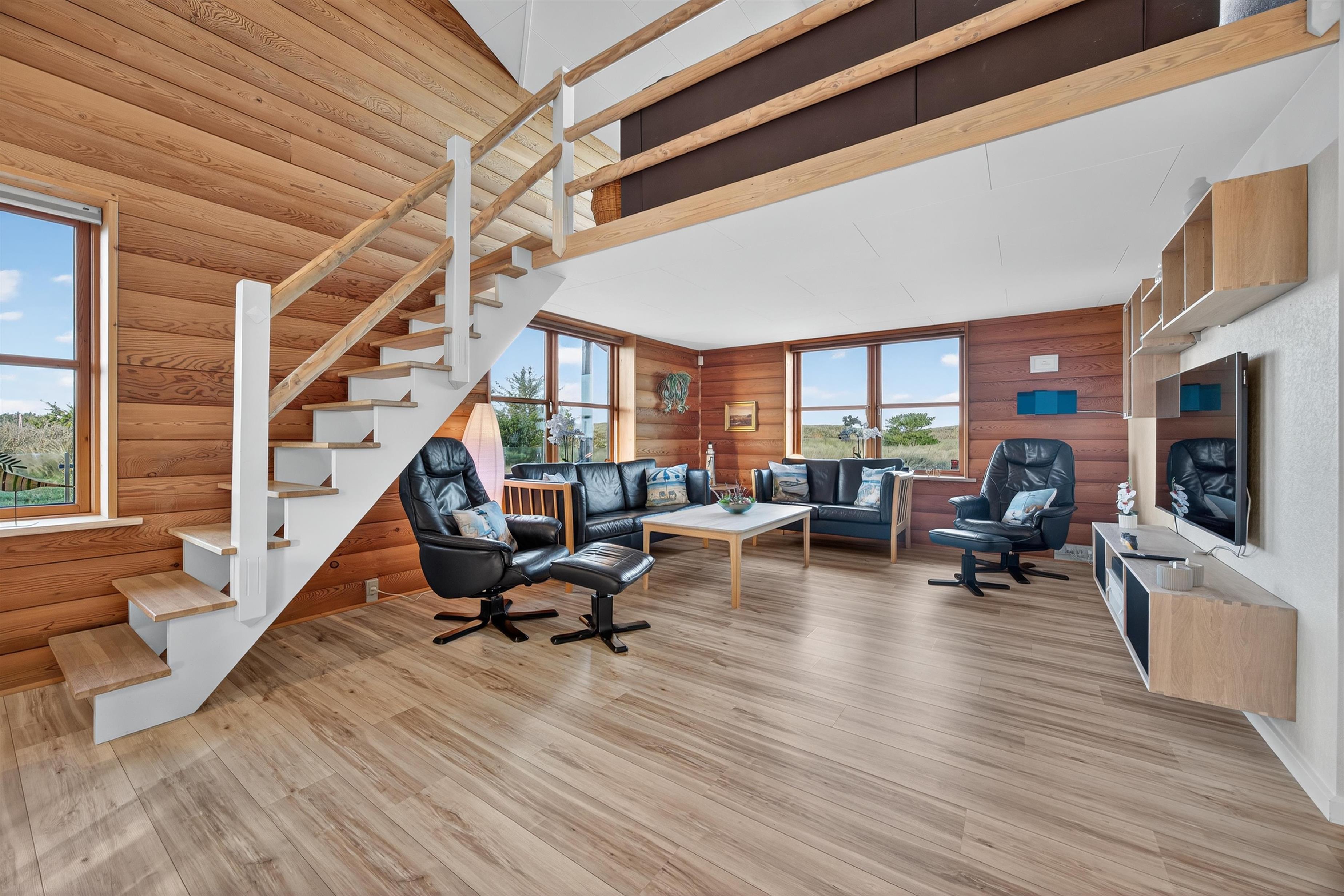 Husets hjerte er det store køkkenalrum, som ligger i direkte forbindelse med stuen. Tag plads ved køkkenøen og nyd en hyggelig snak mens aftensmaden tilberedes, eller saml jer ved spisebordet til en spilaften, mens I vender dagens mange gode oplevelser og indtryk. Fra alrummet fører en trappe op til hemsen, hvorfra I kan nyde en helt fantastisk havudsigt. Her kan I lade jer betage af solnedgangens smukke farver over Vesterhavet – et dagligt naturshow, der aldrig bliver ens. Til aften kan I slå sovesofaen ud til to ekstra sovepladser.