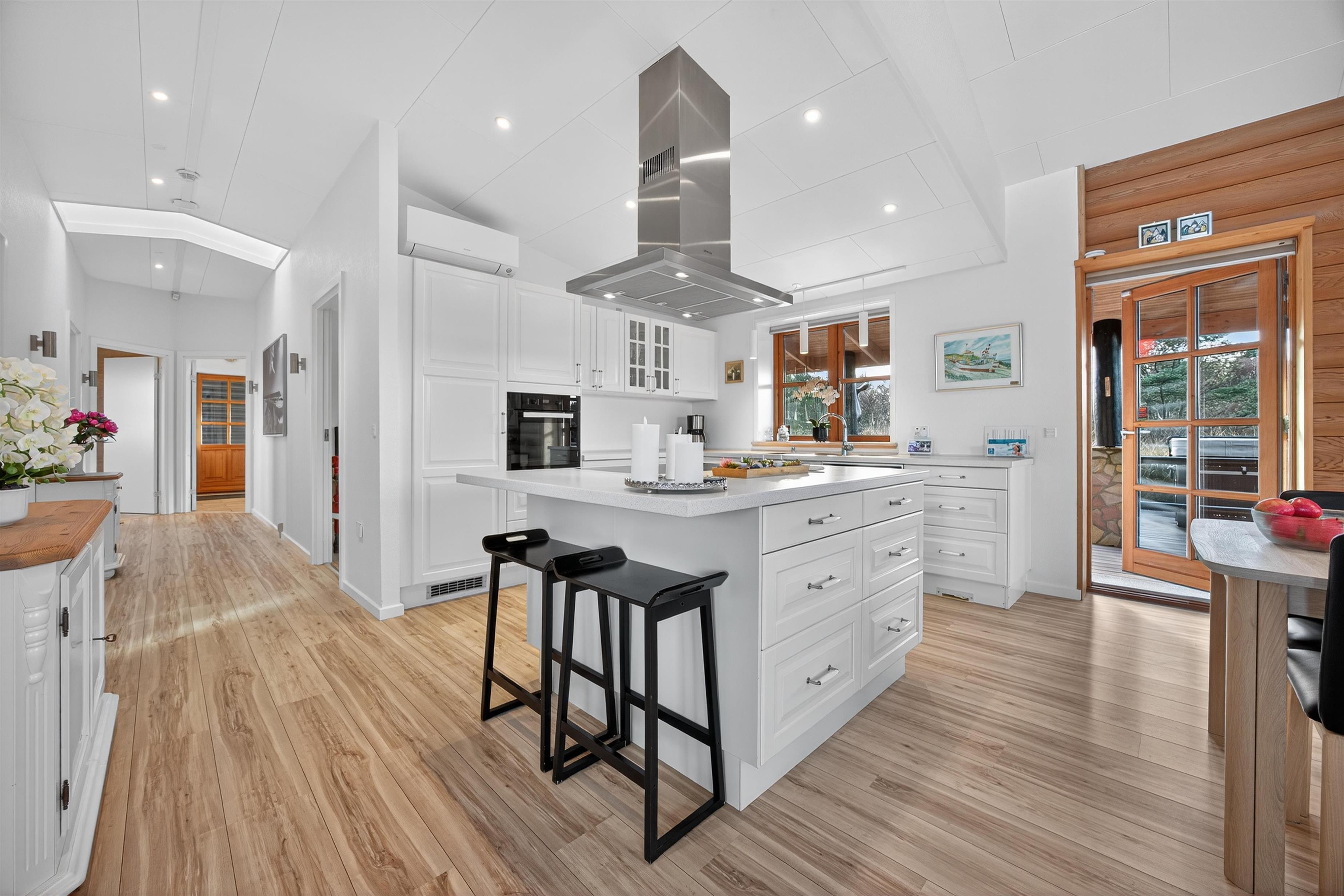 Når du træder ind i dette indbydende feriehus ved Kjul Strand, mødes du af et stort og praktisk bryggers med vaskefaciliteter og rigelig skabsplads til overtøj og strandgrej. Herfra kan man fortsætte ind i det nyrenoverede badeværelse, som er udstyret med dobbeltvask, elektrisk toilet og moderne teknik, der sikrer en komfortabel ferie fra første dag.