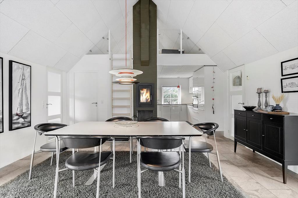 Glæd jer til at indtage husets store, åbne opholdsområde, hvor køkkenet og stuen glider i ét. Loft til kip og et pragtfuldt lysindfald fra fire verdenshjørner giver en lys og luftig ramme om måltiderne omkring spisebordet og hyggelige stunder i sofaarrangementet med en spændende film, mens ilden knitrer i pejseindsatsen. Køkkenet er stilfuldt indrettet, og her har I alt nødvendigt udstyr til madlavningen, hvor opvaskemaskinen tilmed gør rengøringen nem og bekvem. Fra stuen er der adgang til en hyggelig hems, hvor familiens yngste kan have deres egen lege- og læsehule. Derudover er her et hyggeligt værelse med en daybed, som egner sig til både middagsluren og en rar stund med en god bog. Feriehuset byder på to separate soveafdelinger, hvoraf det ene rummer et badeværelse samt to værelser med sengepladser til fire personer. Den anden byder på et soveværelse med sengepladser til to personer samt et praktisk bryggers med vaskemaskine og tørretumbler. Afdelingen rummer også feriehusets store luksusbadeværelse, der er indrettet med bruseniche, spabad og sauna.