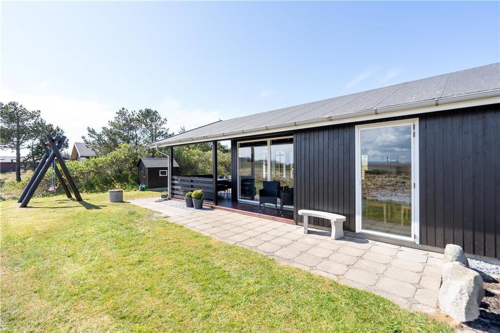 Fra stuen er der direkte adgang til et øst- og sydvendt terrassemiljø med en overdækket og en åben del. Her kan I nyde feriedagene i solen dagen lang, og under overdækningen kan I finde både ly og læ, når I vil grille om aftenen. Fra udearealerne har I et skønt udsyn til mark, eng og fjord. De yngste har god plads til leg, og her er både et gyngestativ og en sandkasse.