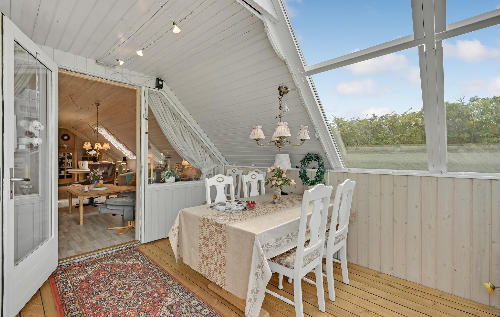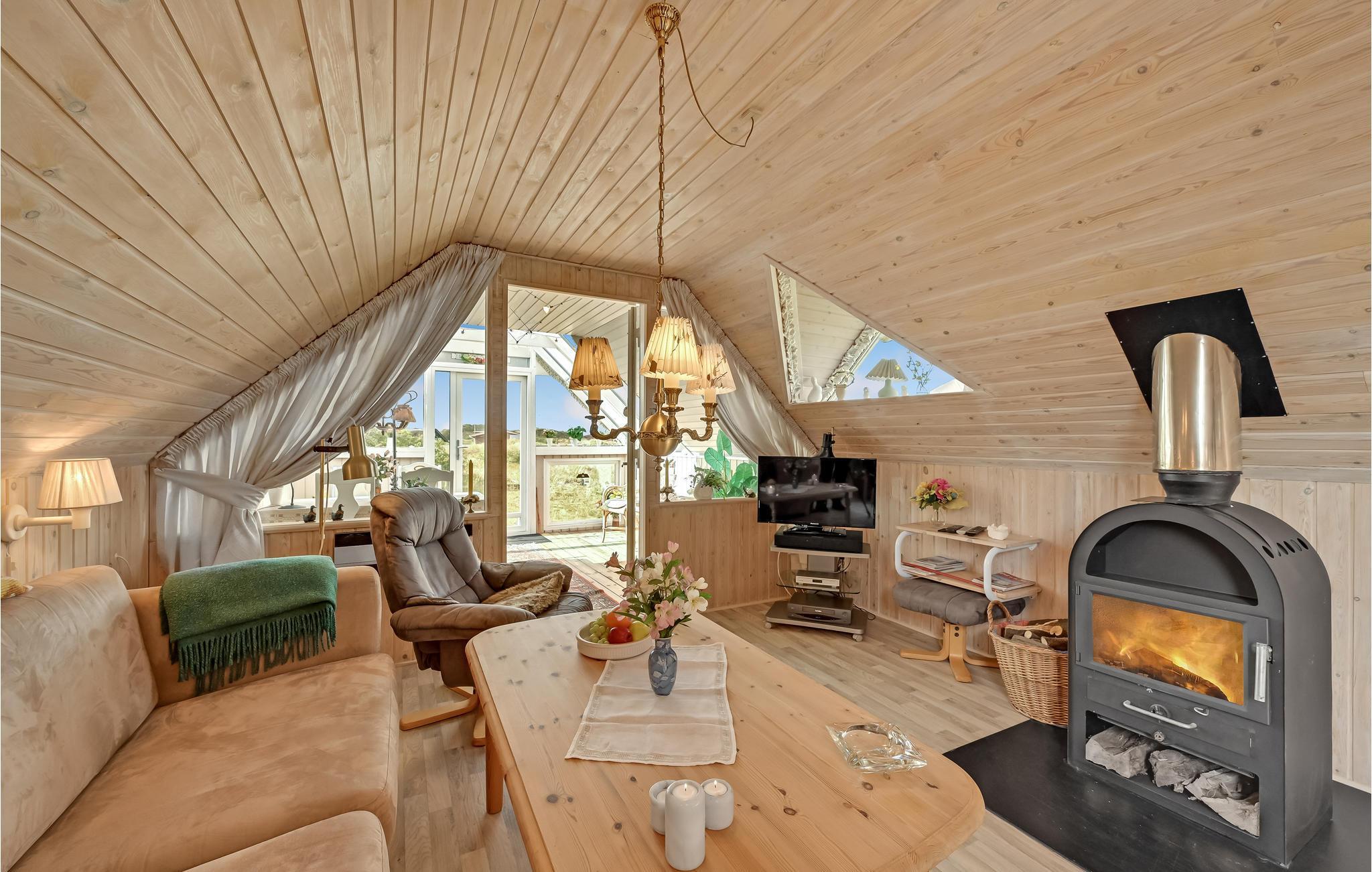Så snart I ankommer til den store naturgrund, vil I se, at I har fundet et helt unikt sommerhus her. Huset er bygget i A-form og er indvendigt beklædt med en masse træ, der giver rummene en hyggelig, hjemlig atmosfære. I stuen er der en brændeovn, så I kan hygge jer og få ekstra varme i de kolde vintermåneder og de to udestuer med flotte glaspartier placeret i hver ende af huset giver mulighed for at forlænge den varme årstid.