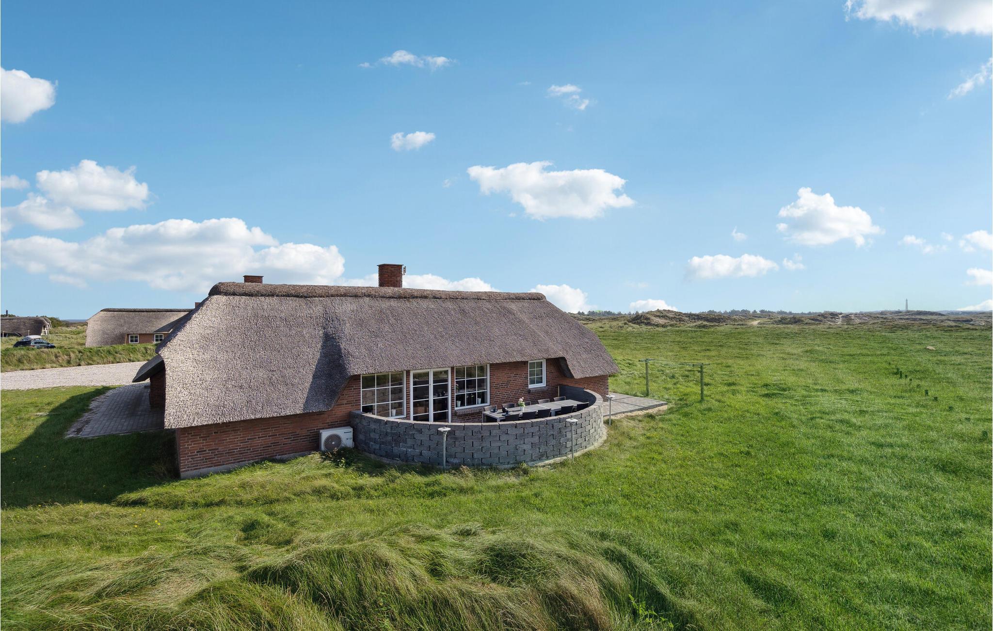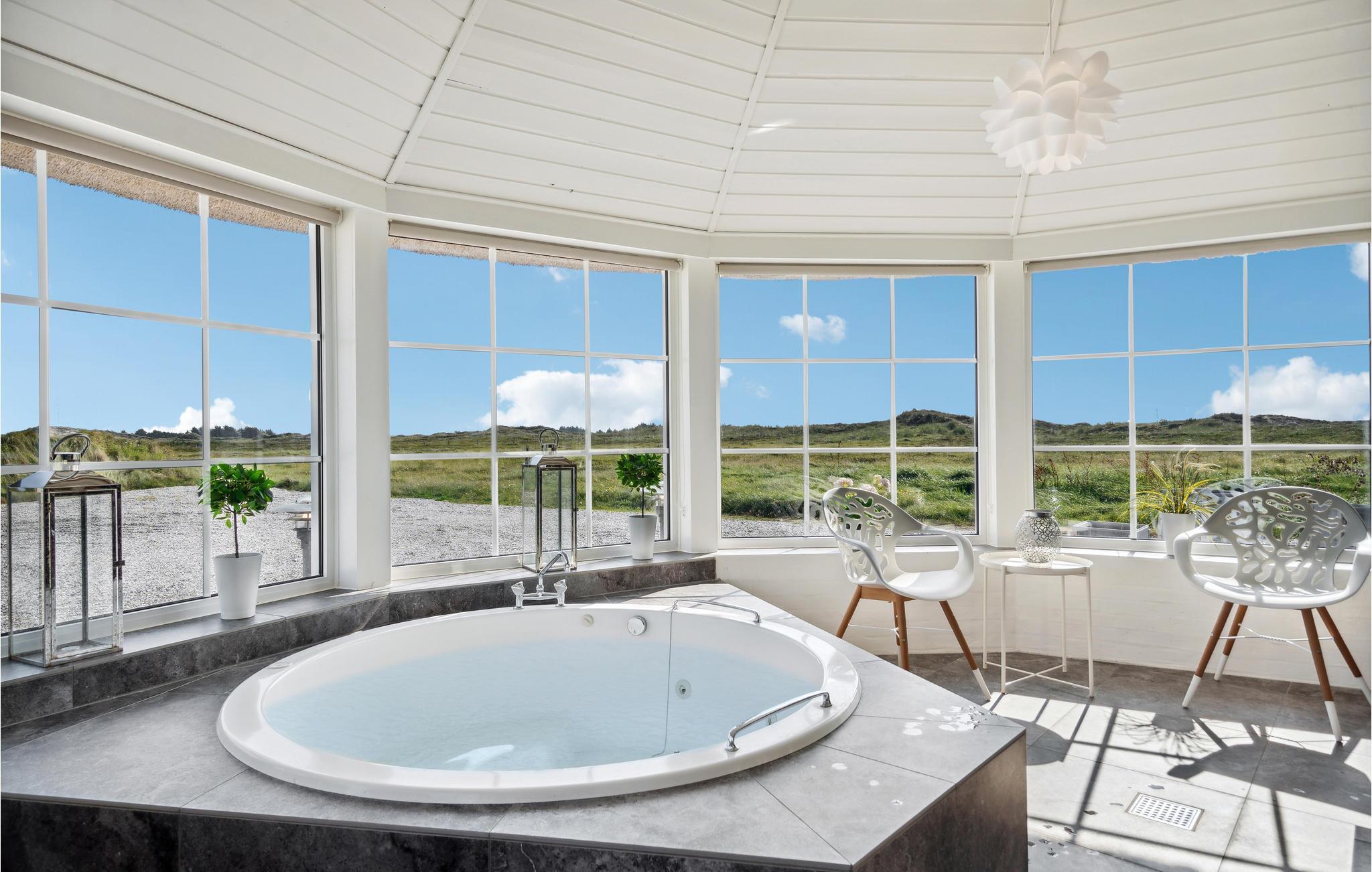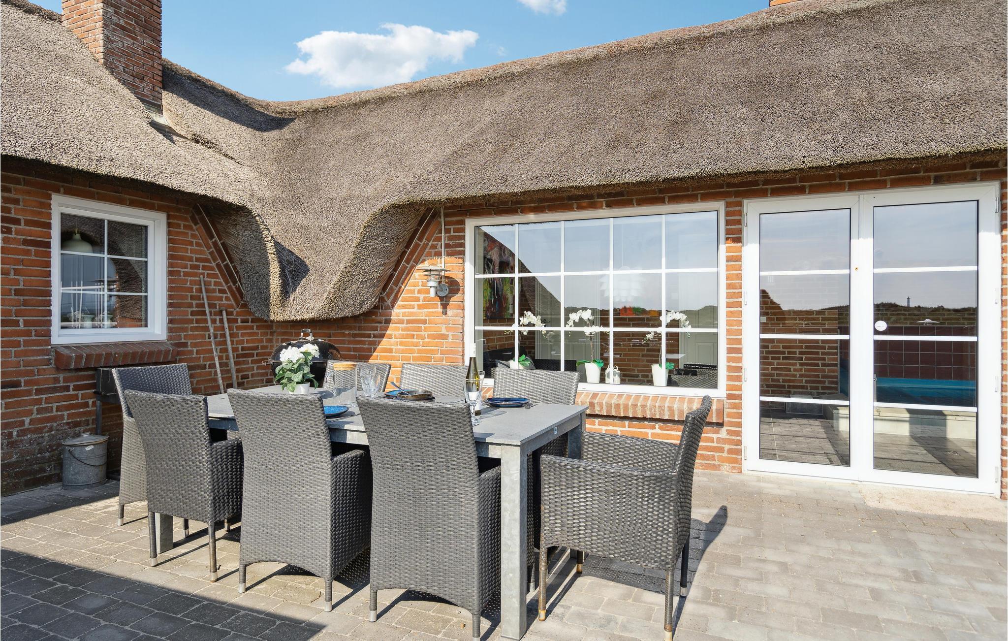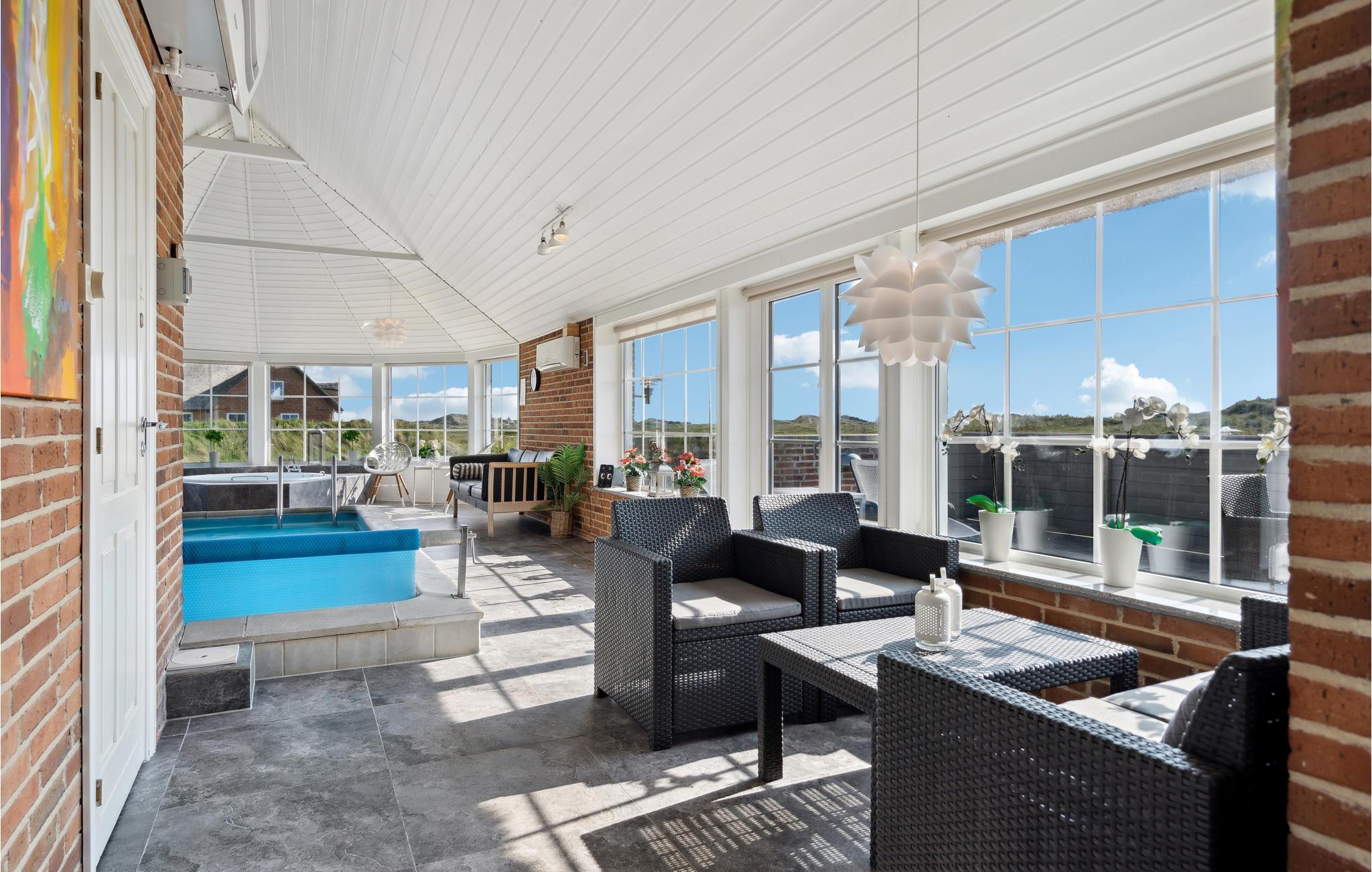 Tilbring en uforglemmelig tid med jeres nærmeste i dette indbydende, stråtækte hus med ekstra høj komfort, hvorfra I kan gå til stranden. Der venter jer en stilfuld atmosfære i de lyse rum, som byder på en fantastisk panoramaudsigt over klitterne gennem store sprossevinduer. Slå jer løs i husets lettilgængelige pool uanset vind og vejr, slap af i spabadet med en vidunderlig udsigt og glæd jer til hyggelige aftener i de komfortable sofaer, mens brændeovnen luner på kølige dage. I kan også tilbringe dejlige timer i solskinnet på en liggestol. På terrassen er I beskyttet mod vinden, og her kan I servere lækre grillretter. Spadsér ud til havet, mærk vinden i håret på en gåtur langs stranden eller spring i Vesterhavets friske bølger.