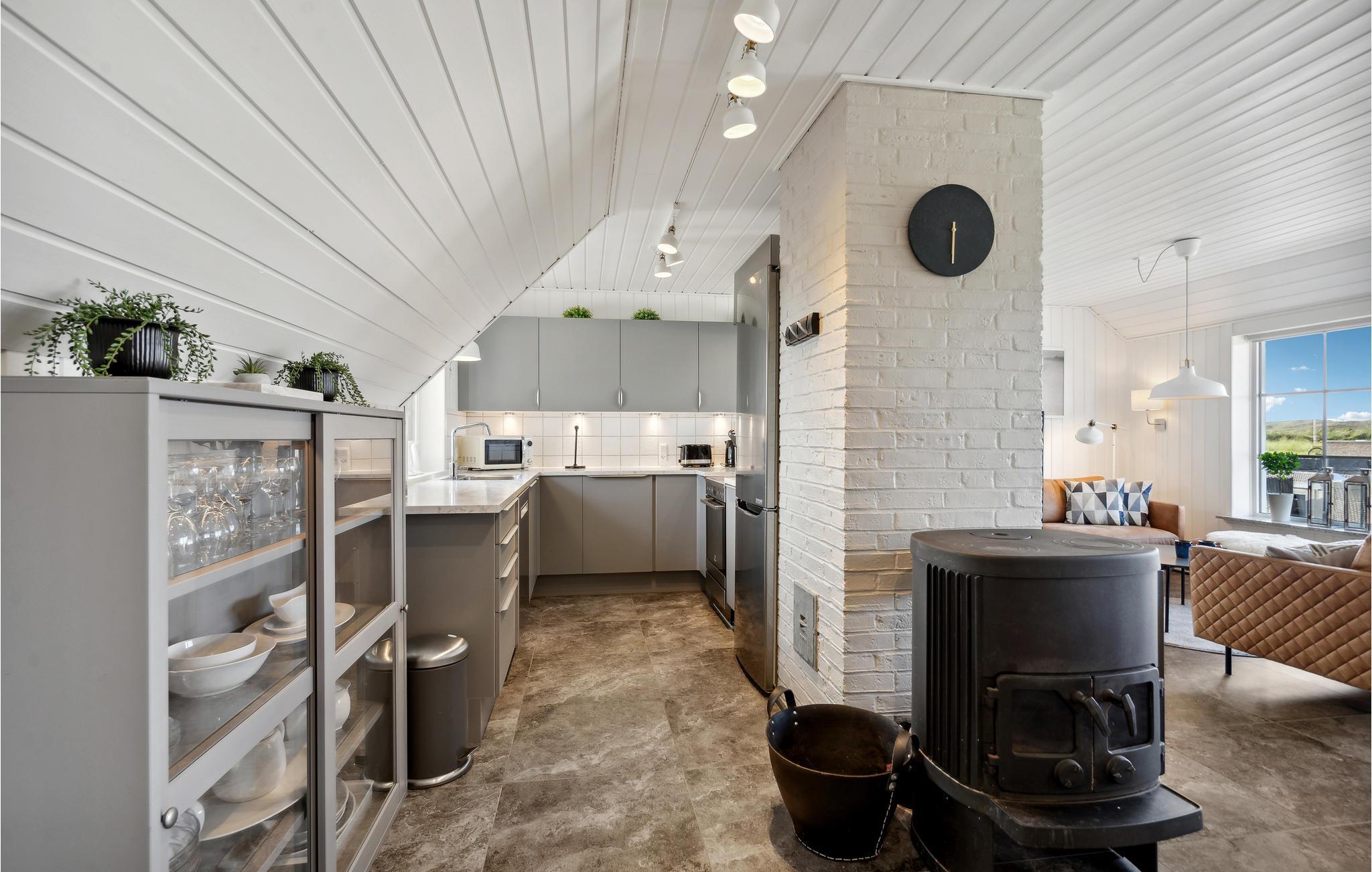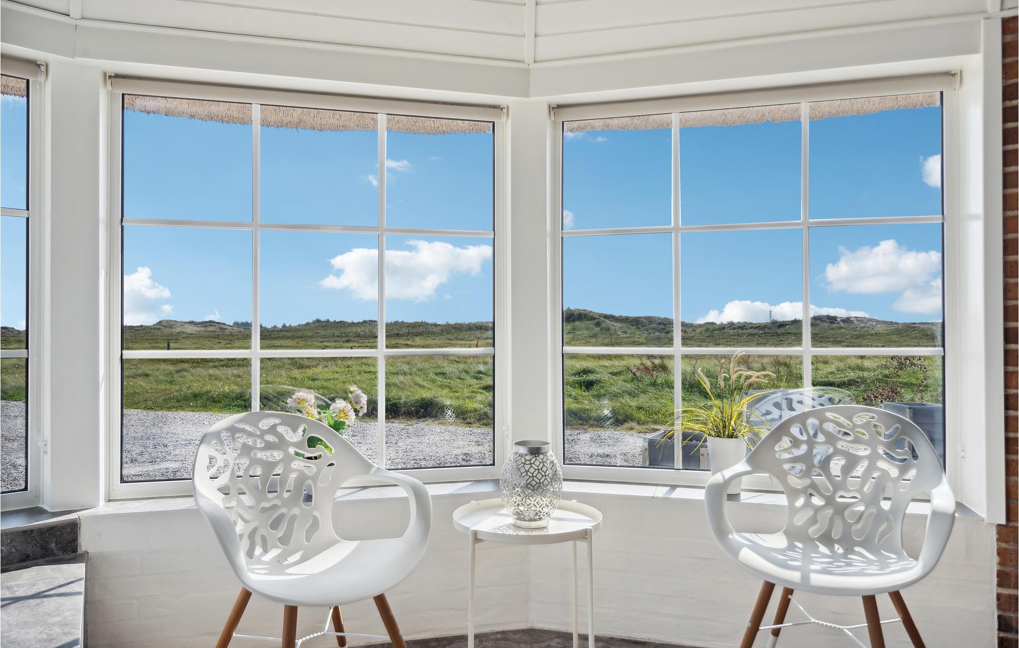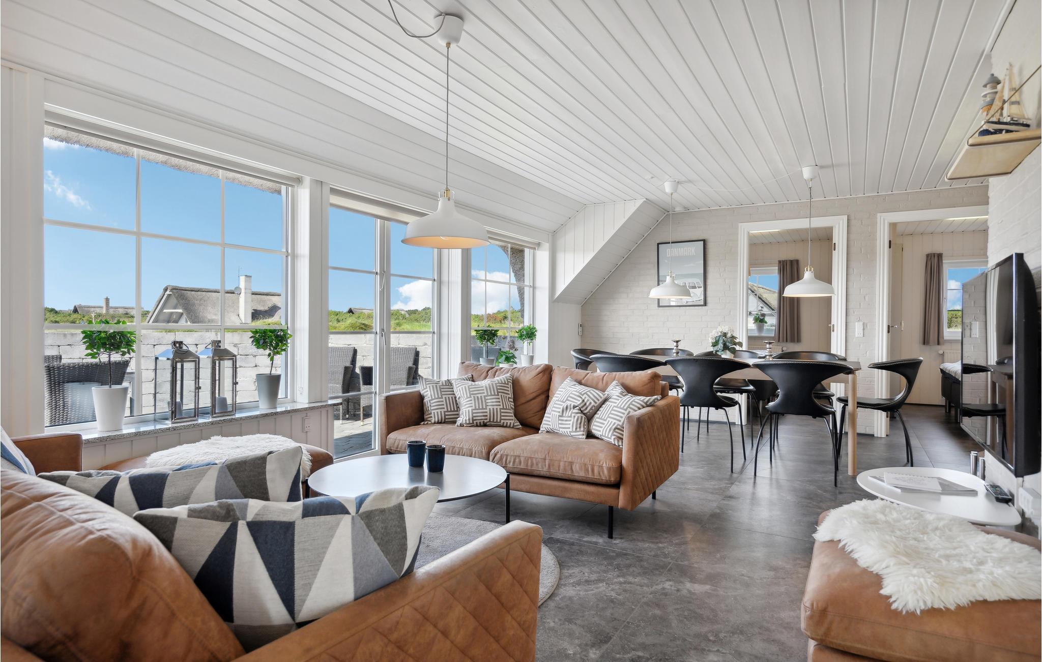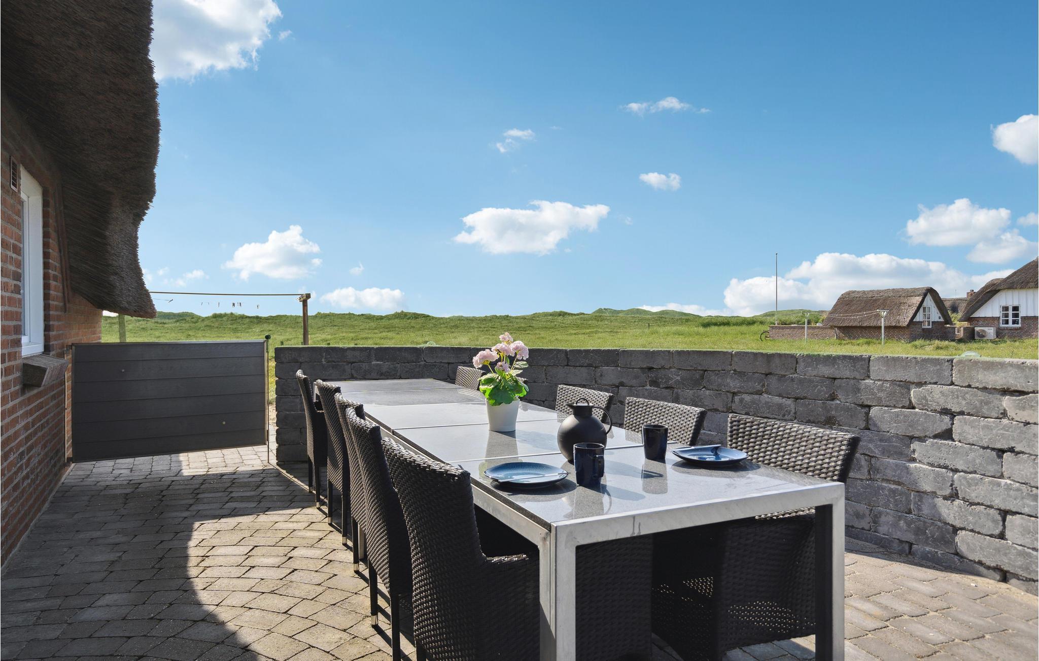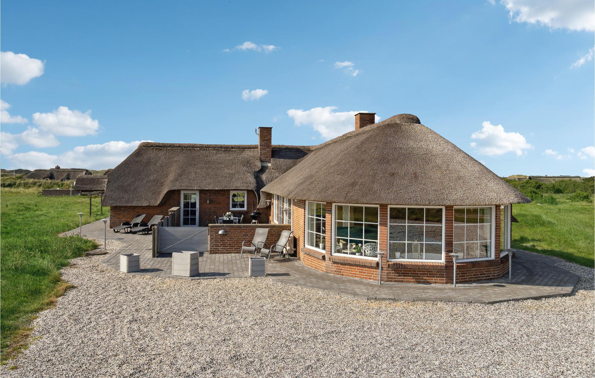 Tilbring en uforglemmelig tid med jeres nærmeste i dette indbydende, stråtækte hus med ekstra høj komfort, hvorfra I kan gå til stranden. Der venter jer en stilfuld atmosfære i de lyse rum, som byder på en fantastisk panoramaudsigt over klitterne gennem store sprossevinduer. Slå jer løs i husets lettilgængelige pool uanset vind og vejr, slap af i spabadet med en vidunderlig udsigt og glæd jer til hyggelige aftener i de komfortable sofaer, mens brændeovnen luner på kølige dage. I kan også tilbringe dejlige timer i solskinnet på en liggestol. På terrassen er I beskyttet mod vinden, og her kan I servere lækre grillretter. Spadsér ud til havet, mærk vinden i håret på en gåtur langs stranden eller spring i Vesterhavets friske bølger.