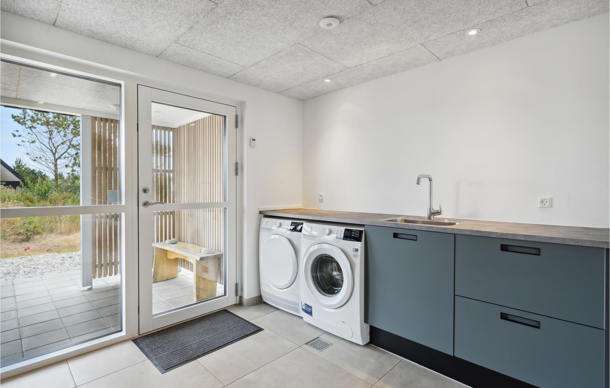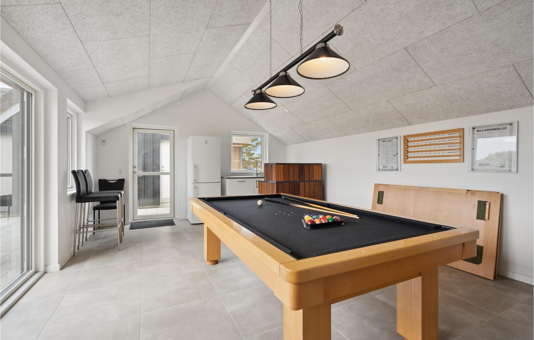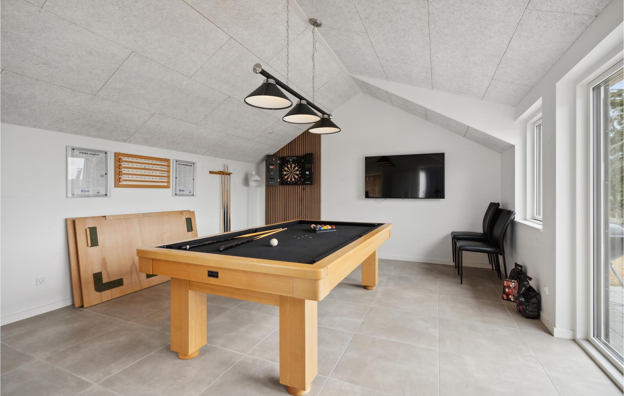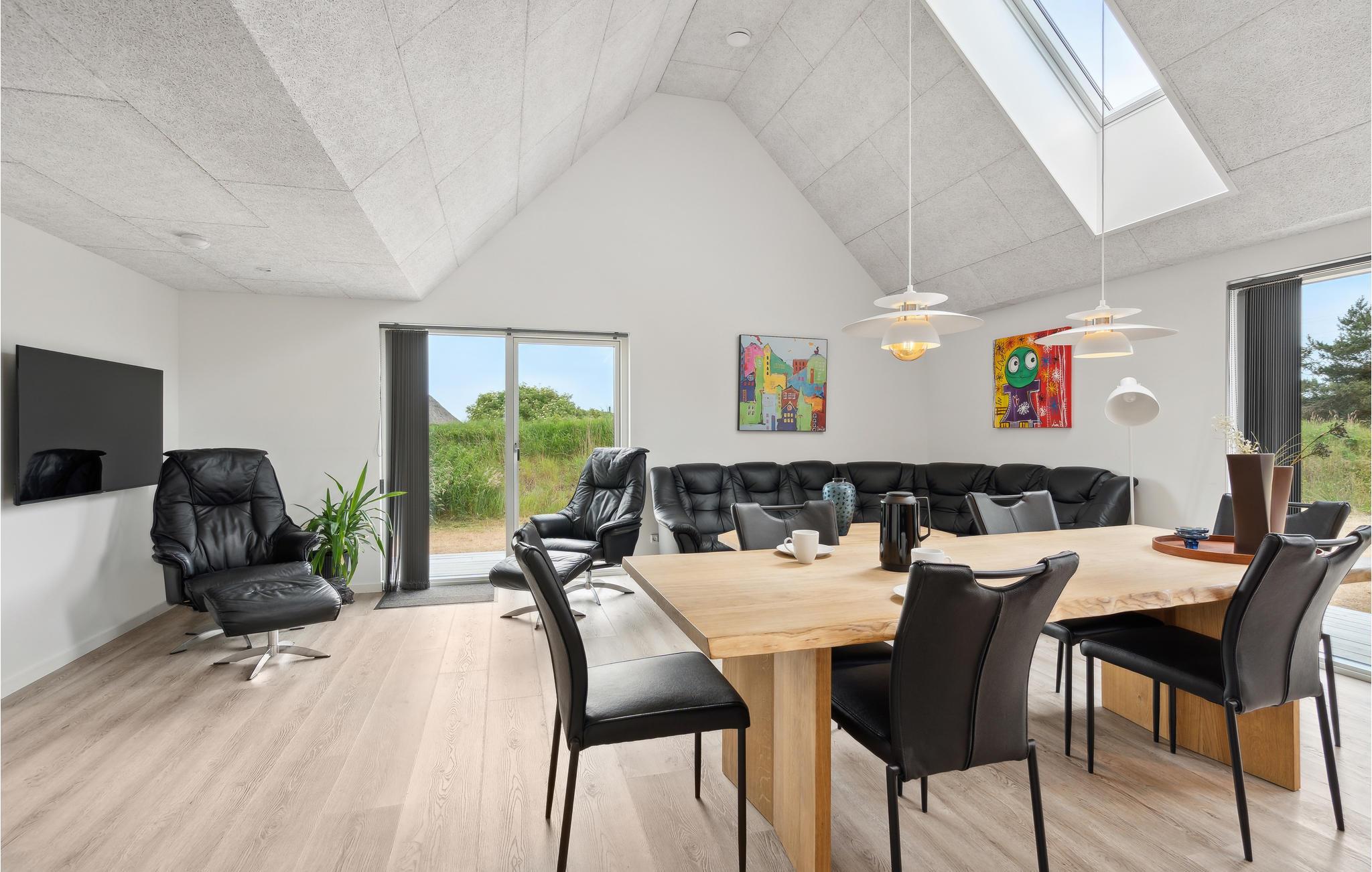 Dette rummelige, lyse feriehus har en fantastisk beliggenhed mellem Vesterhavet og Ringkøbing Fjord. Her får I et dejligt afbræk fra hverdagen, hvor I kan fokusere på samvær, friske gåture og masser af tid til afslapning. Snup en sjov dyst i aktivitetsrummet eller find sammen om et brætspil i opholdsrummet, hvor alle kan kaste sig over hver deres projekter, lige fra madlavning til bøger eller måske noget kreativt. I kan klargøre lækre måltider i det åbne, moderne køkken, mens børnene tager en pause, og ilden knitrer stemningsfuldt i brændeovnen.