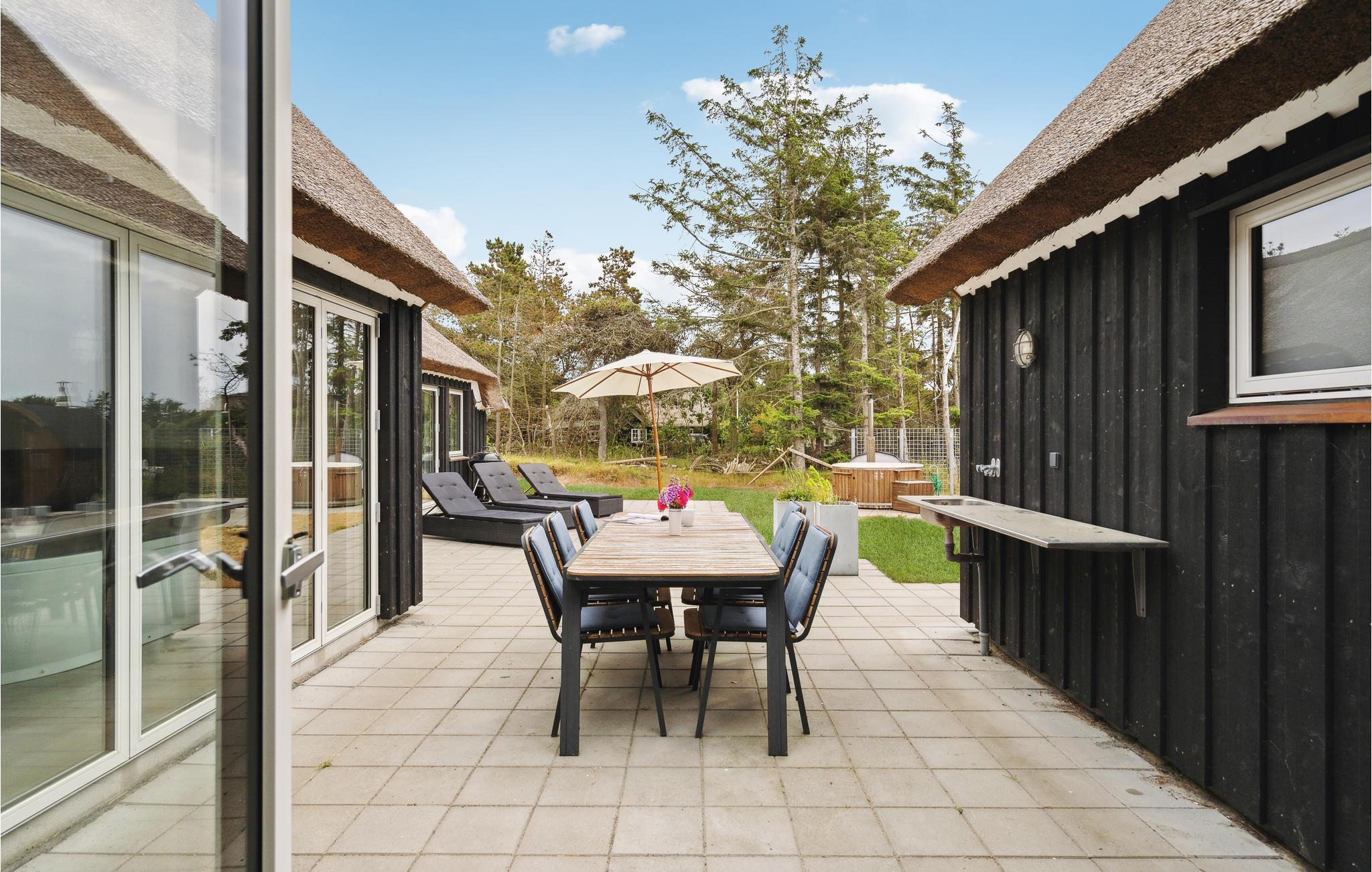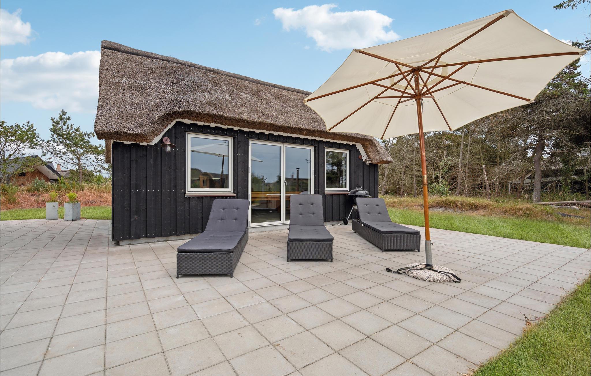 Moderne feriehus med stråtag, vildmarksbad og sauna nær Vesterhavet og Ringkøbing Fjord.