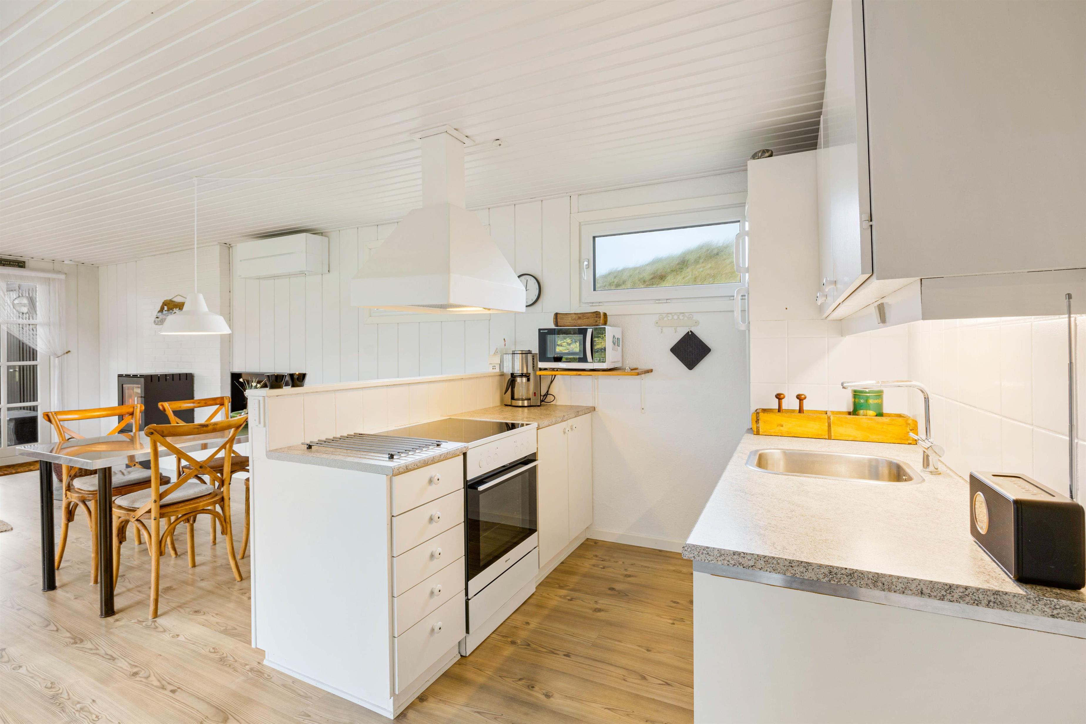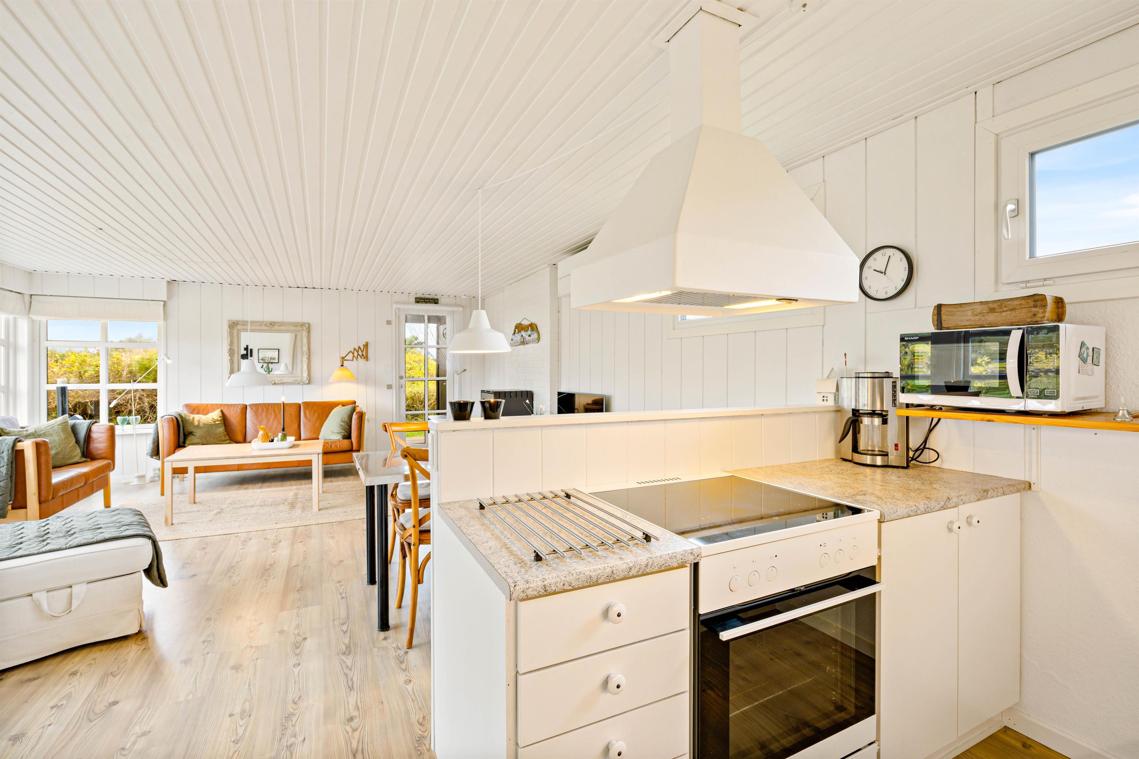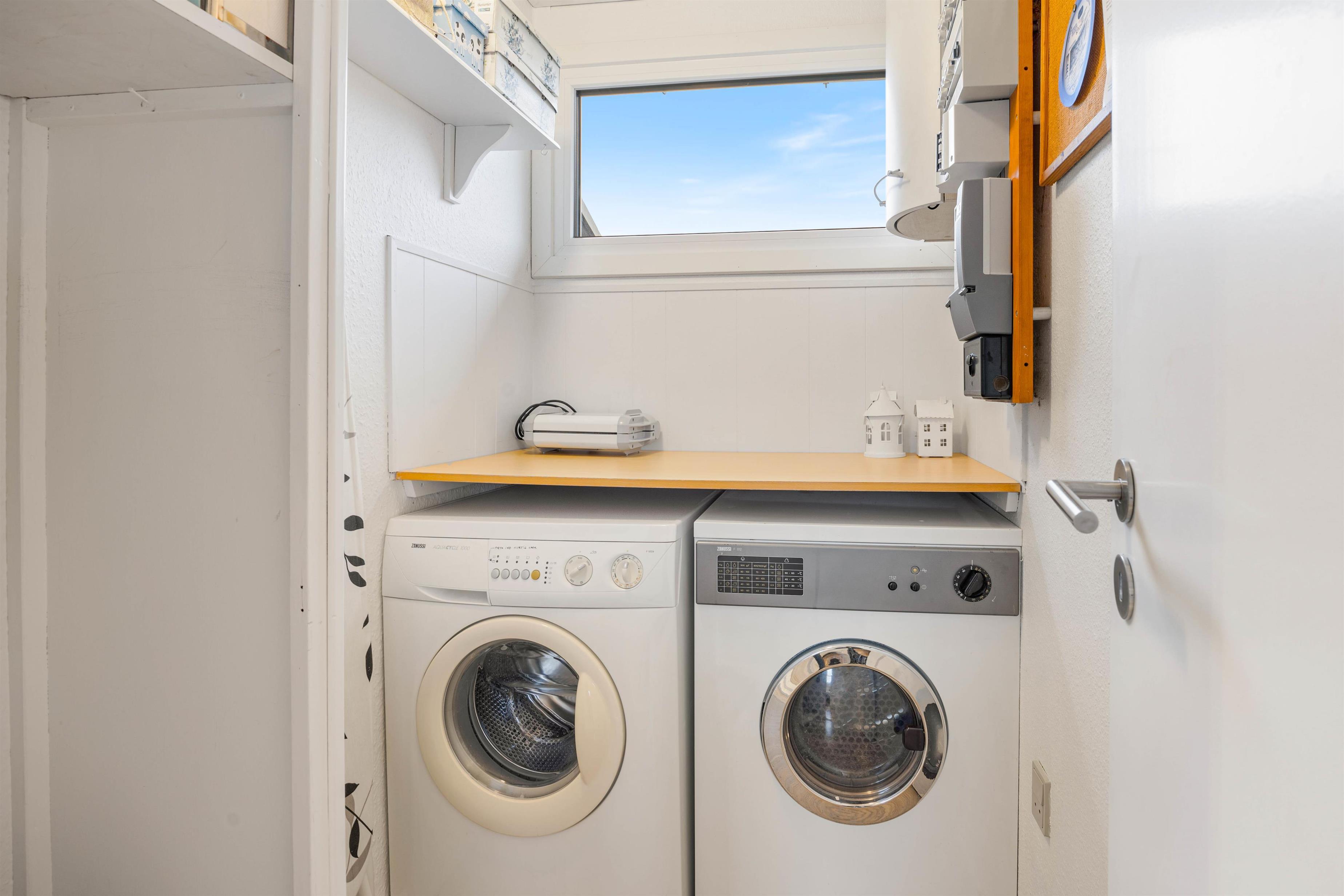 I åben forbindelse med stuen ligger køkkenet, som blandt andet er udstyret med opvaskemaskine, så I kan spare tid på opvasken og i stedet slappe af sammen. Hvis I får brug for at vaske jeres tøj under ferien, finder I både en vaskemaskine og tørretumbler i sommerhuset.