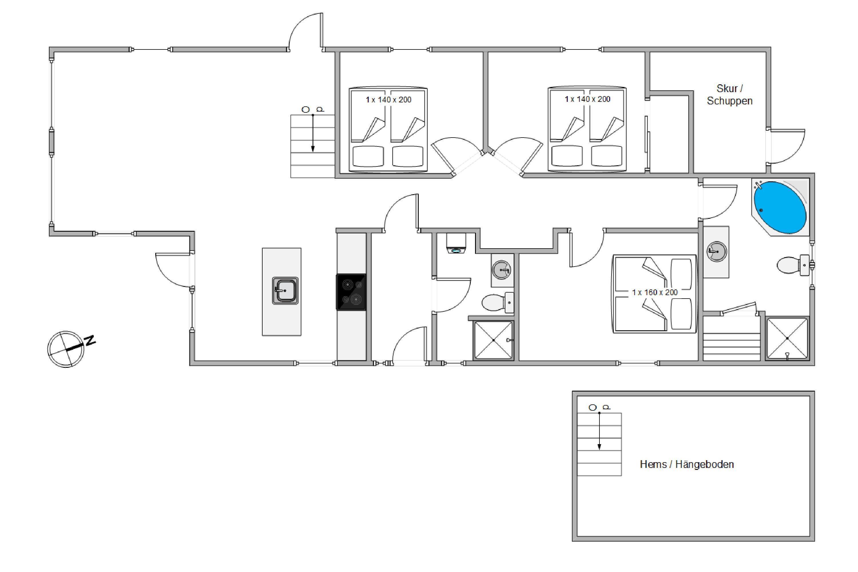 Det åbne samtalekøkken med siddemuligheden ved køkkenøen er perfekt til fælles hygge omkring madlavningen, også hvis man nøjes med at nyde et glas vin, kigge på og give gode råd til sovsetilberedningen. Imens hygger de unge eller børnene måske på hemsen, hvor der er god mulighed for at pakke legetøjet ud eller gemme sig lidt med sin computer og udnytte det gode fiberbredbånd. Børnefamilien vil sikkert glædes over højstol og muligheden for at kunne vaske og tørre tøj i husets vaskemaskine og tumbler.