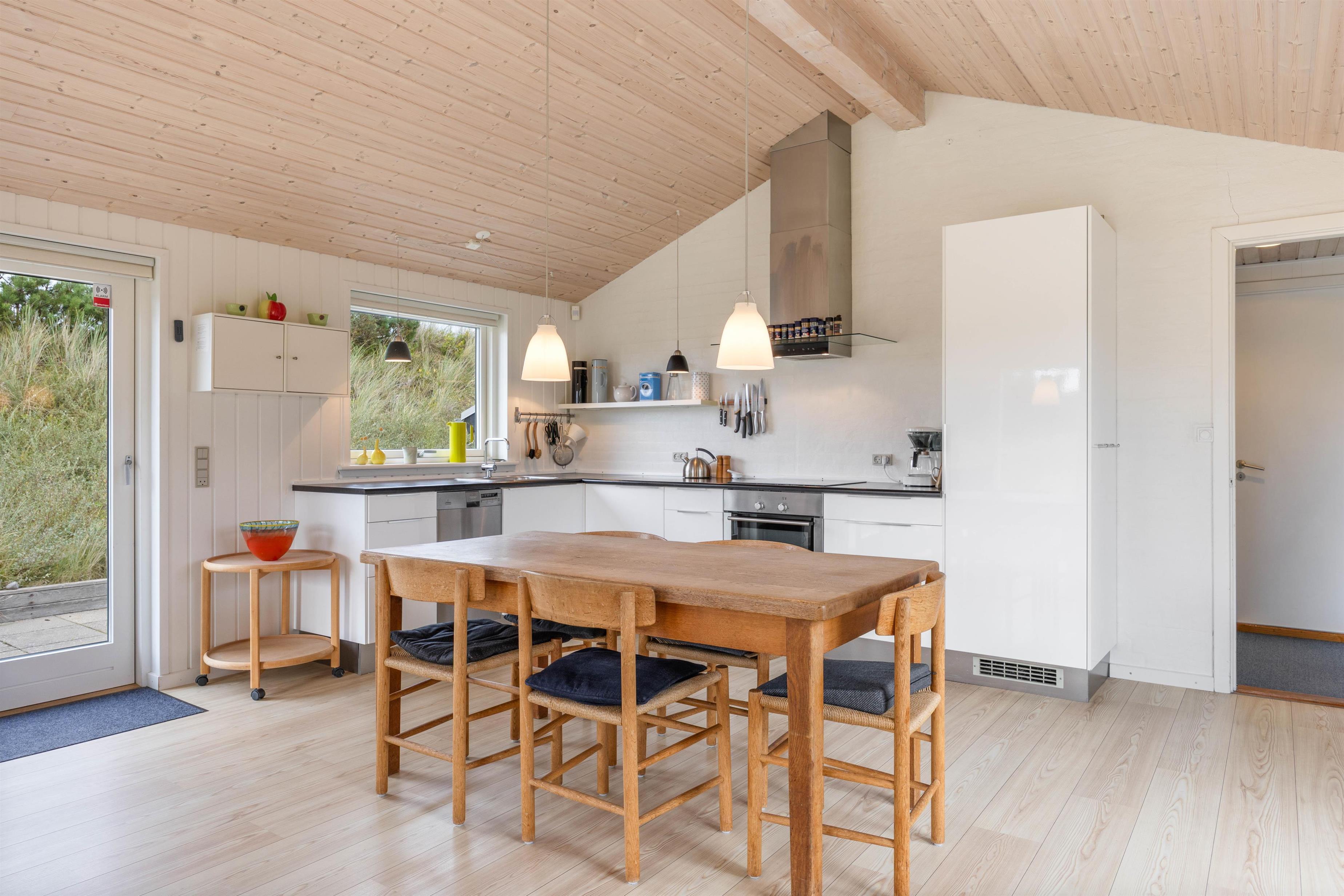 Når I træder ind på Lyngvejen 114, vil I straks blive mødt af et lyst og imødekommende indre med hvide vægge og varme træfarver. Store vinduer lukker den vestjyske natur ind og sørger for masser af lys i feriehjemmet.