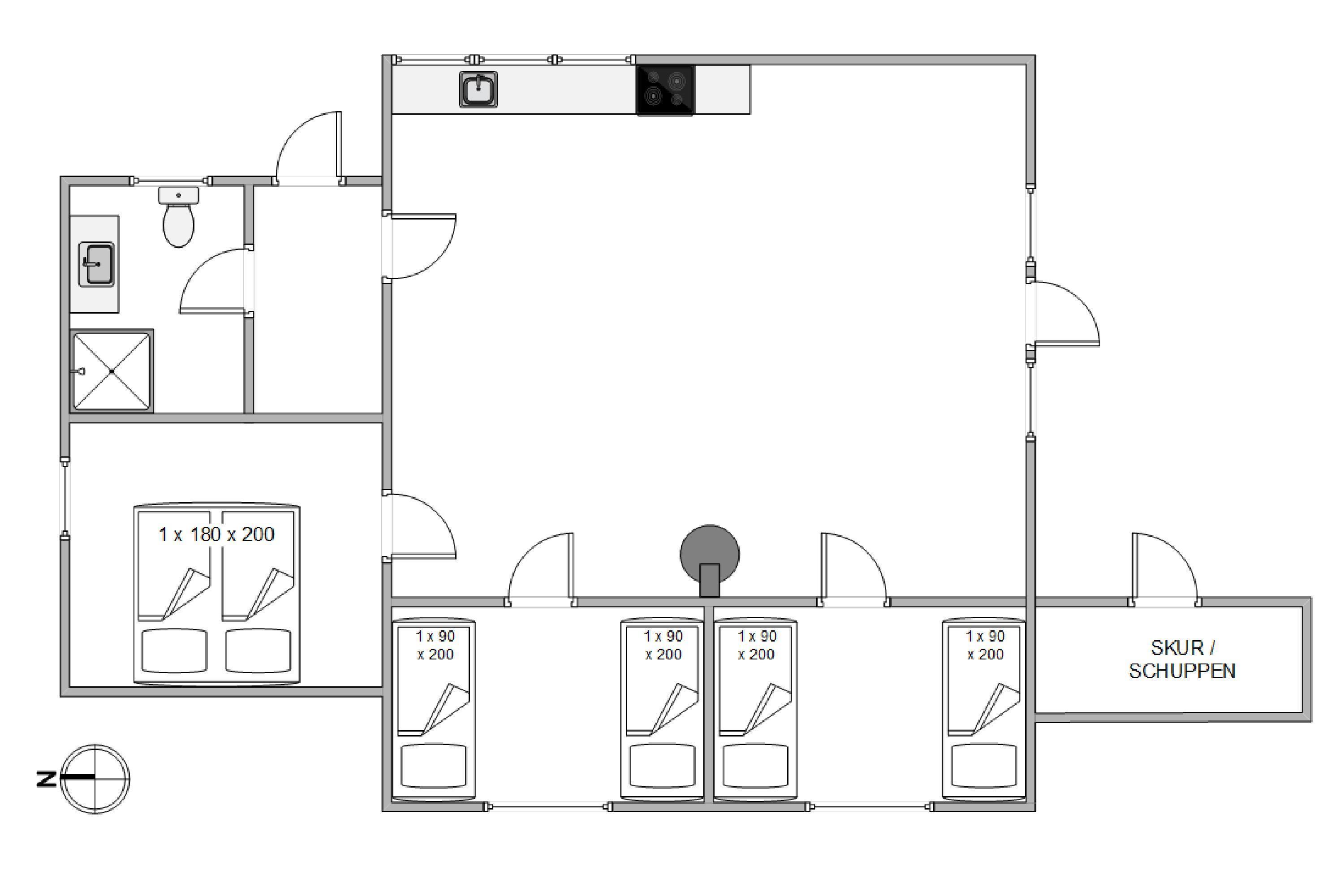 Det åbne køkkenalrum rummer både et langt spisebord, et sofaområde og det flotte køkken med masser af plads til fælles madlavning. På kølige dage kan I tænde op i brændeovnen og sætte jer tilrette med en spændende bog i den dejlig varme ferieatmosfære.