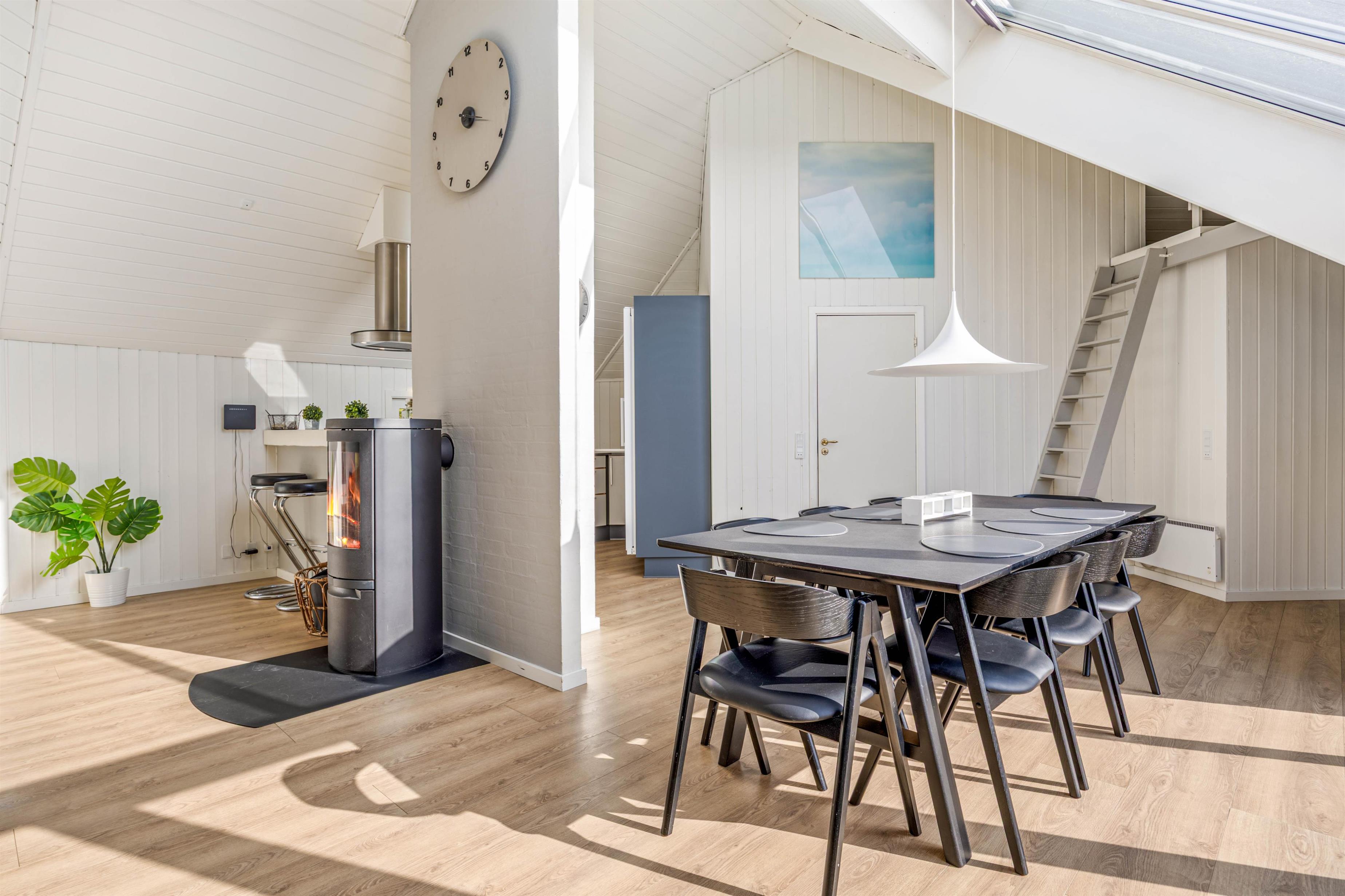 Hyggelig indretning med brændeovn og praktiske faciliteter