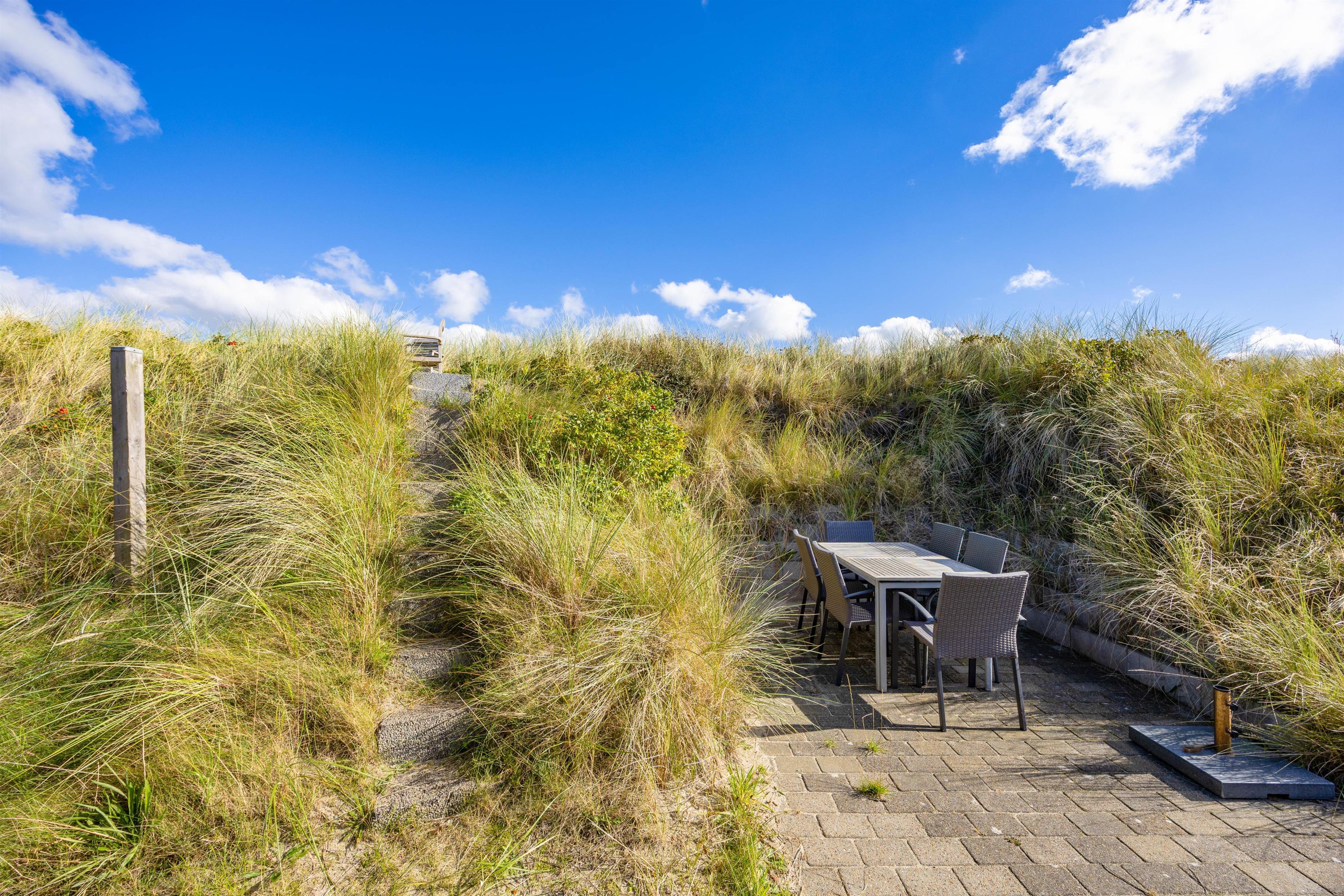 På de lune sommeraftener er sommerhusets åbne terrasse helt perfekt til hyggelige grillaftener, hvor I kan nyde udsigten til klitterne med et glas god vin, alt imens børnene leger i sandkassen, og bøfferne tilberedes på grillen. Rundt omkring sommerhuset finder I flere hyggekroge, hvor det er muligt at finde et godt sted med læ, hvor man kan nyde en stille stund.