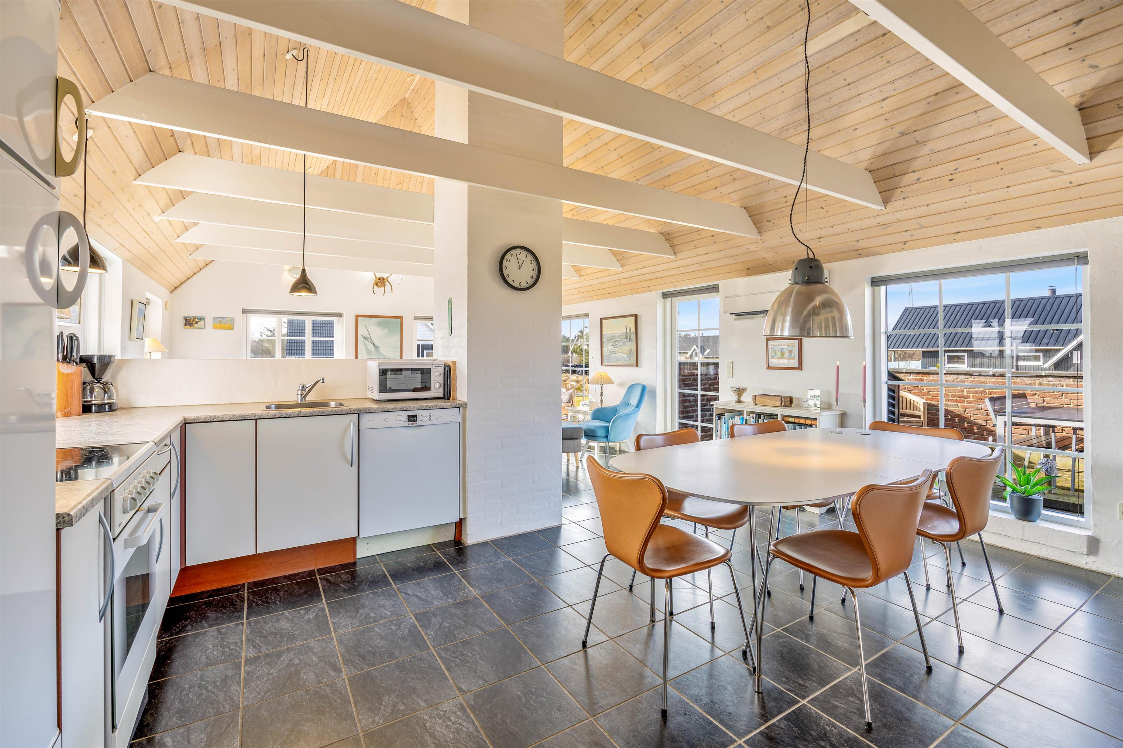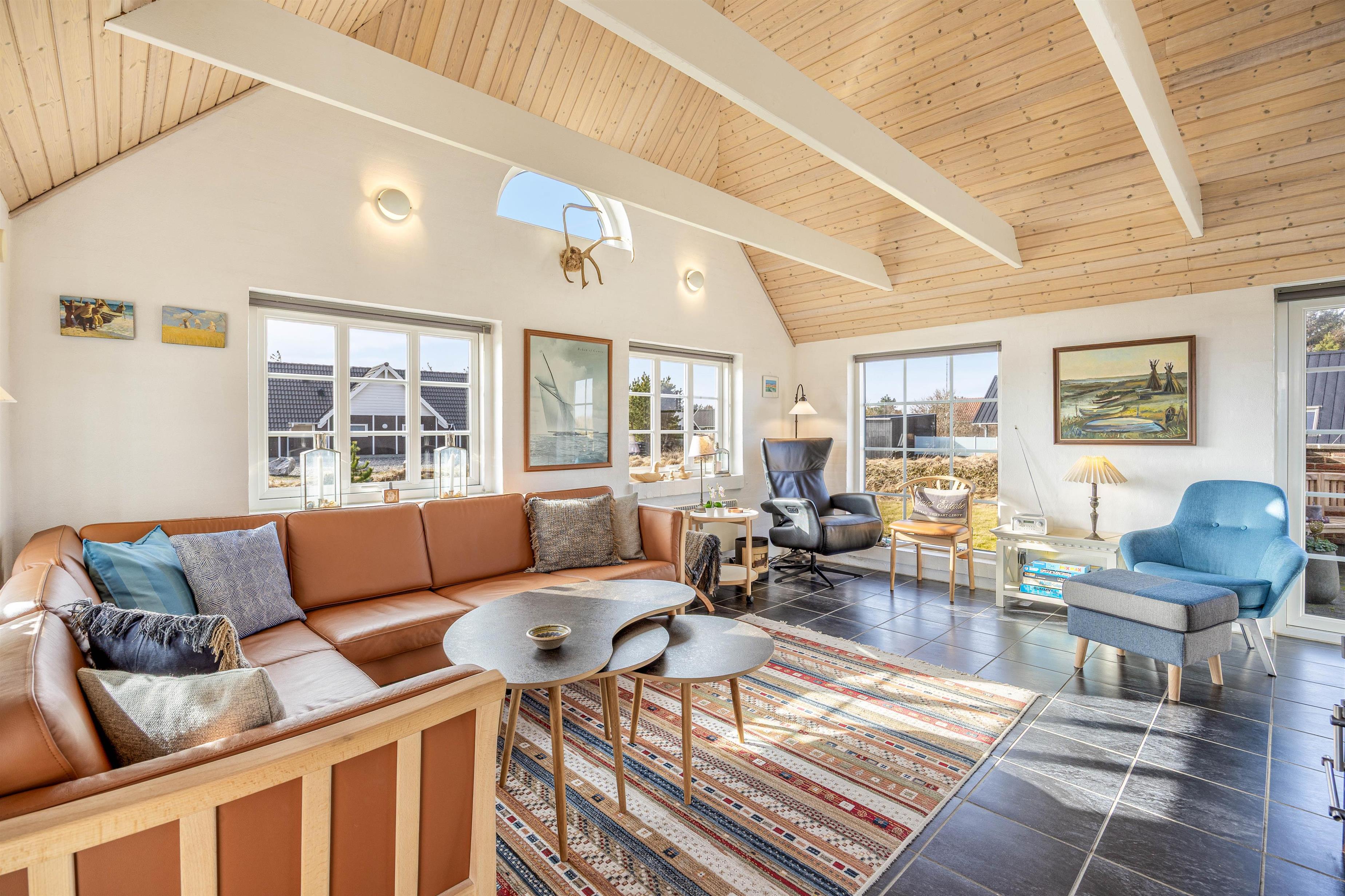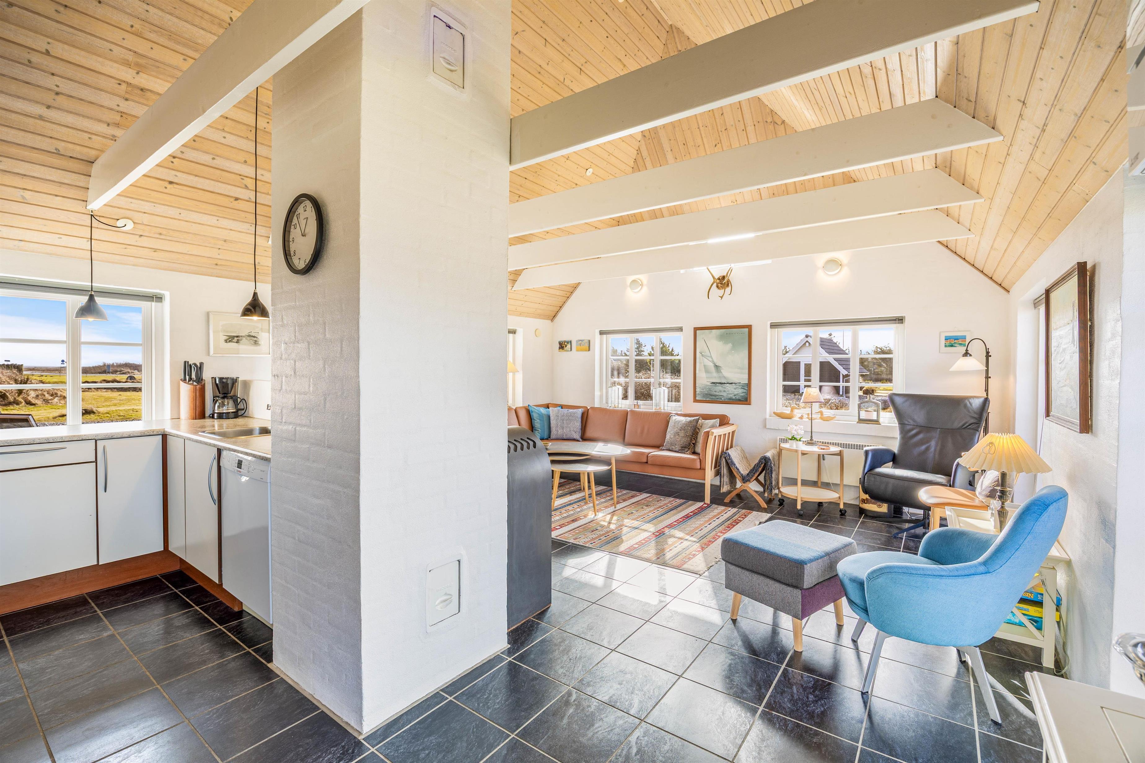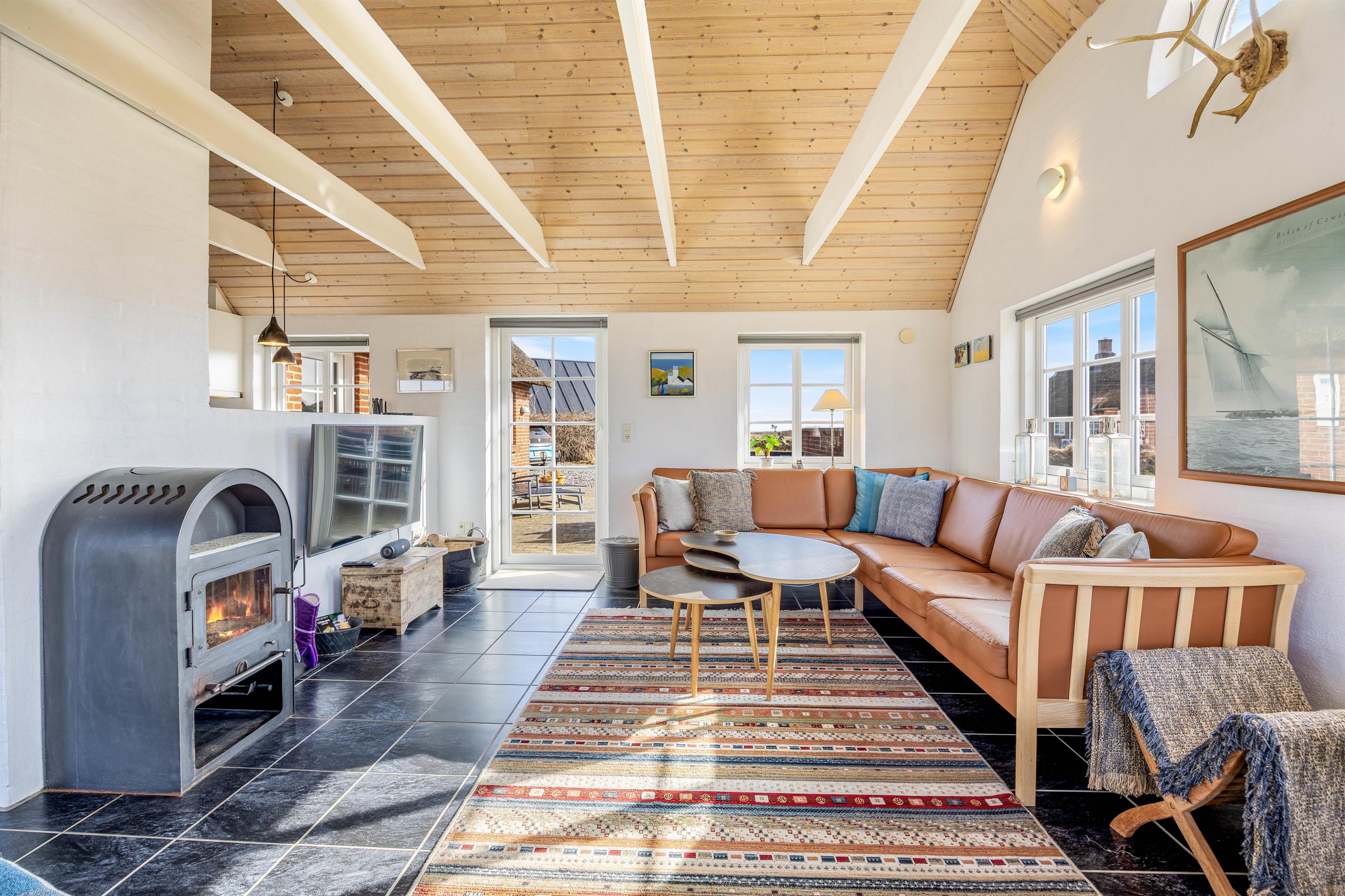 Sommerhusets hjerte er det åbne opholdsrum, der med garanti kommer til at danne rammen om masser af skønne ferieminder. Her kan I samle hele ferieflokken til fælles madlavning, underholdende spilaftener og stille stunder foran den knitrende brændeovn, mens mørket falder på udenfor.