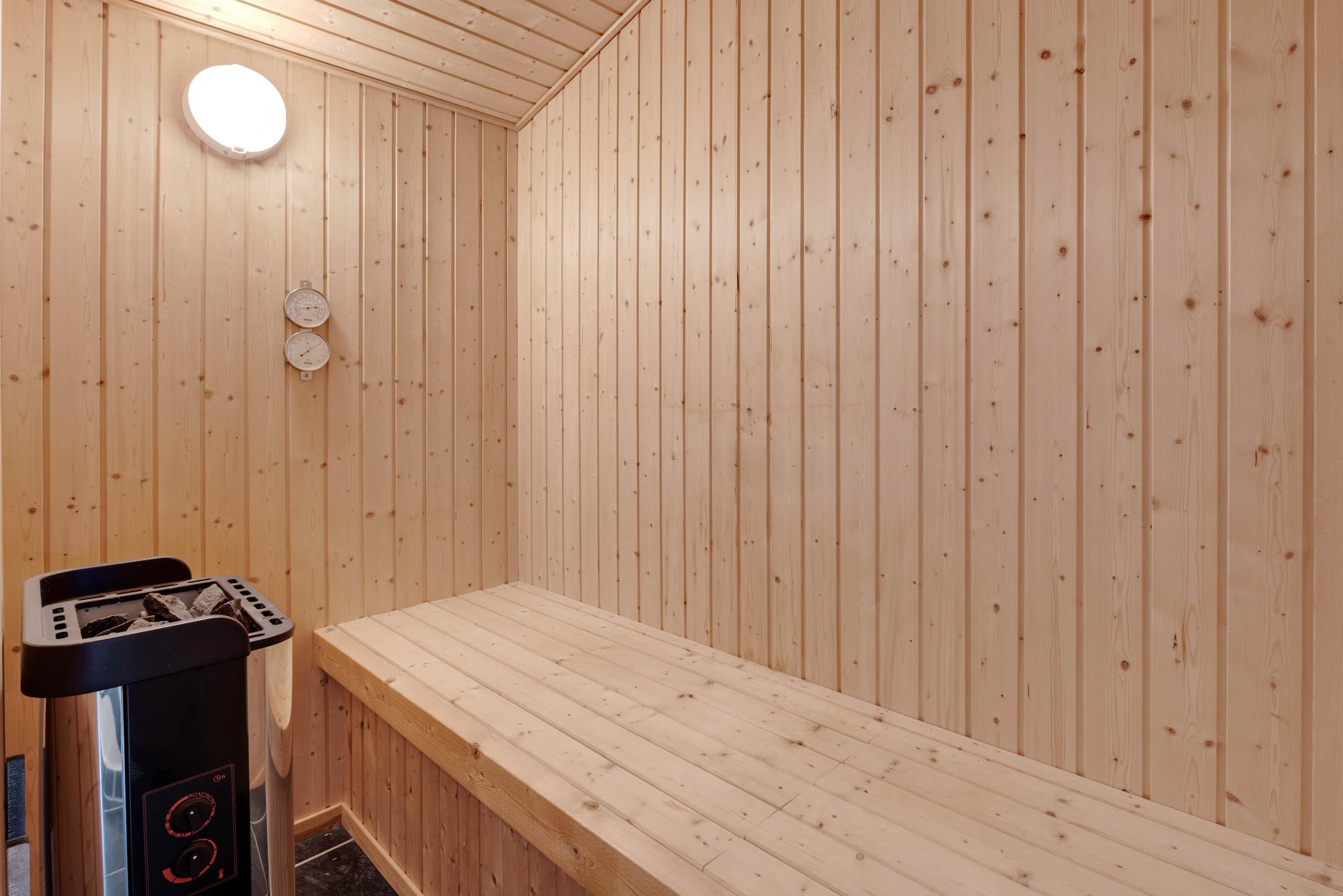 Indbydende og praktisk indretning med sauna, spabad og brændeovn
