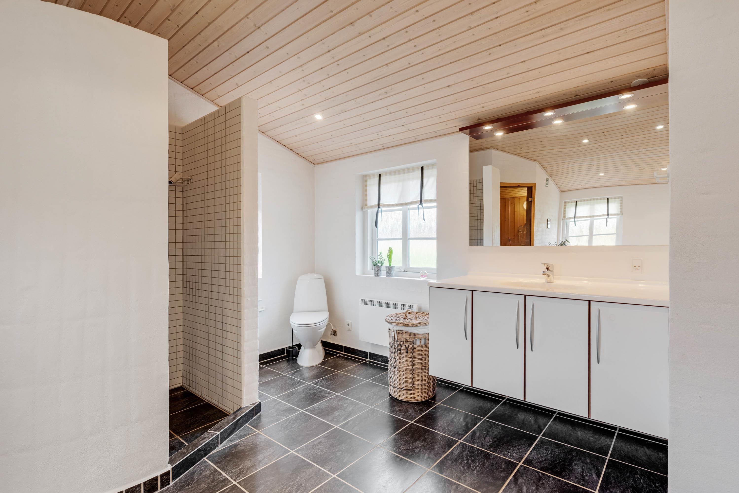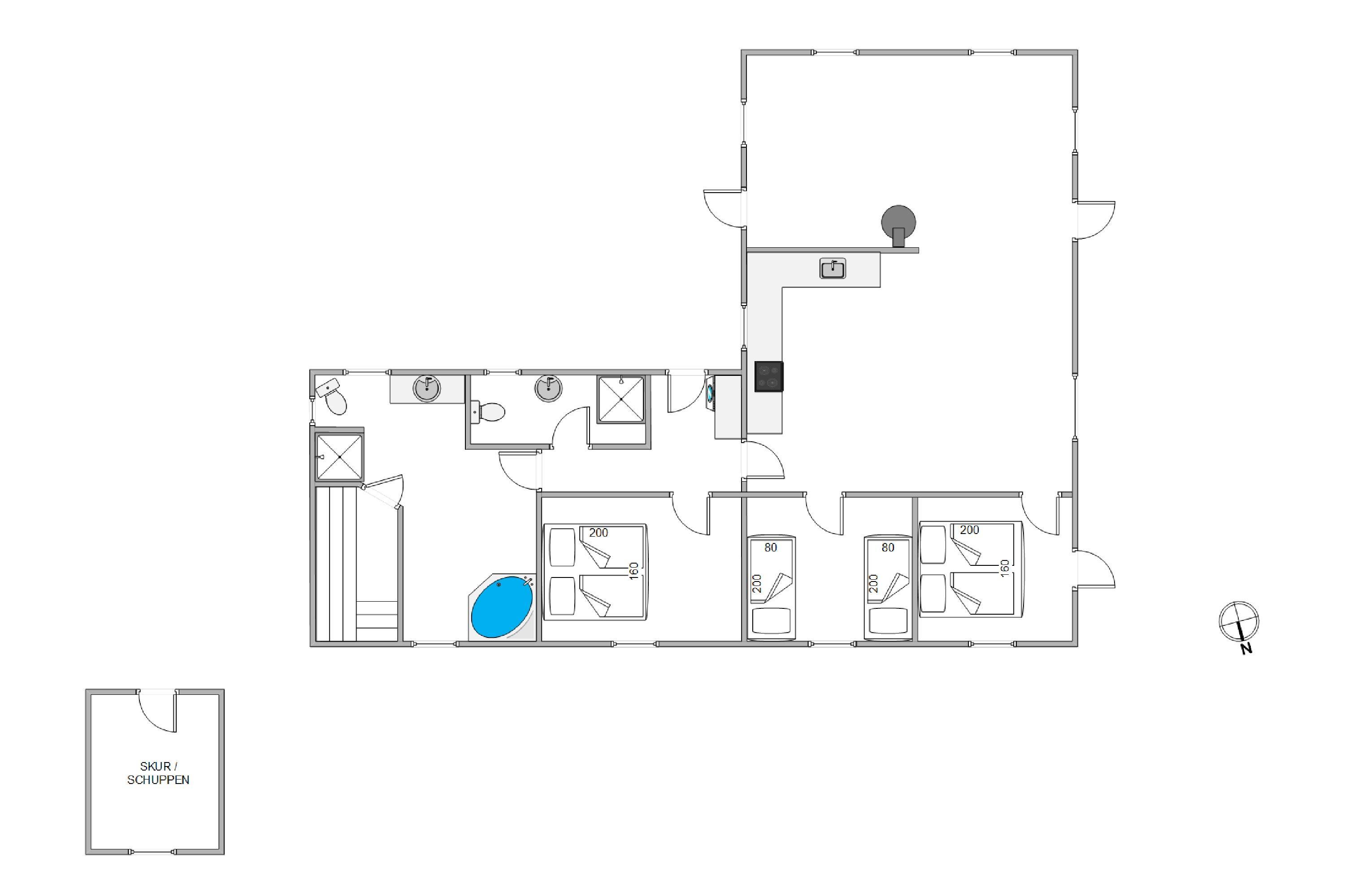 Det velholdte feriehus på Opstrupsvej 4 råder over en både indbydende og praktisk indretning. De 101 kvadratmeter fordeler sig på 3 soveværelser, 2 badeværelser – hvoraf det ene er indrettet med sauna og spabad – og et hyggeligt opholdsrum, hvor stue, køkken og spiseafdeling er lagt sammen til ét stort fællesrum.