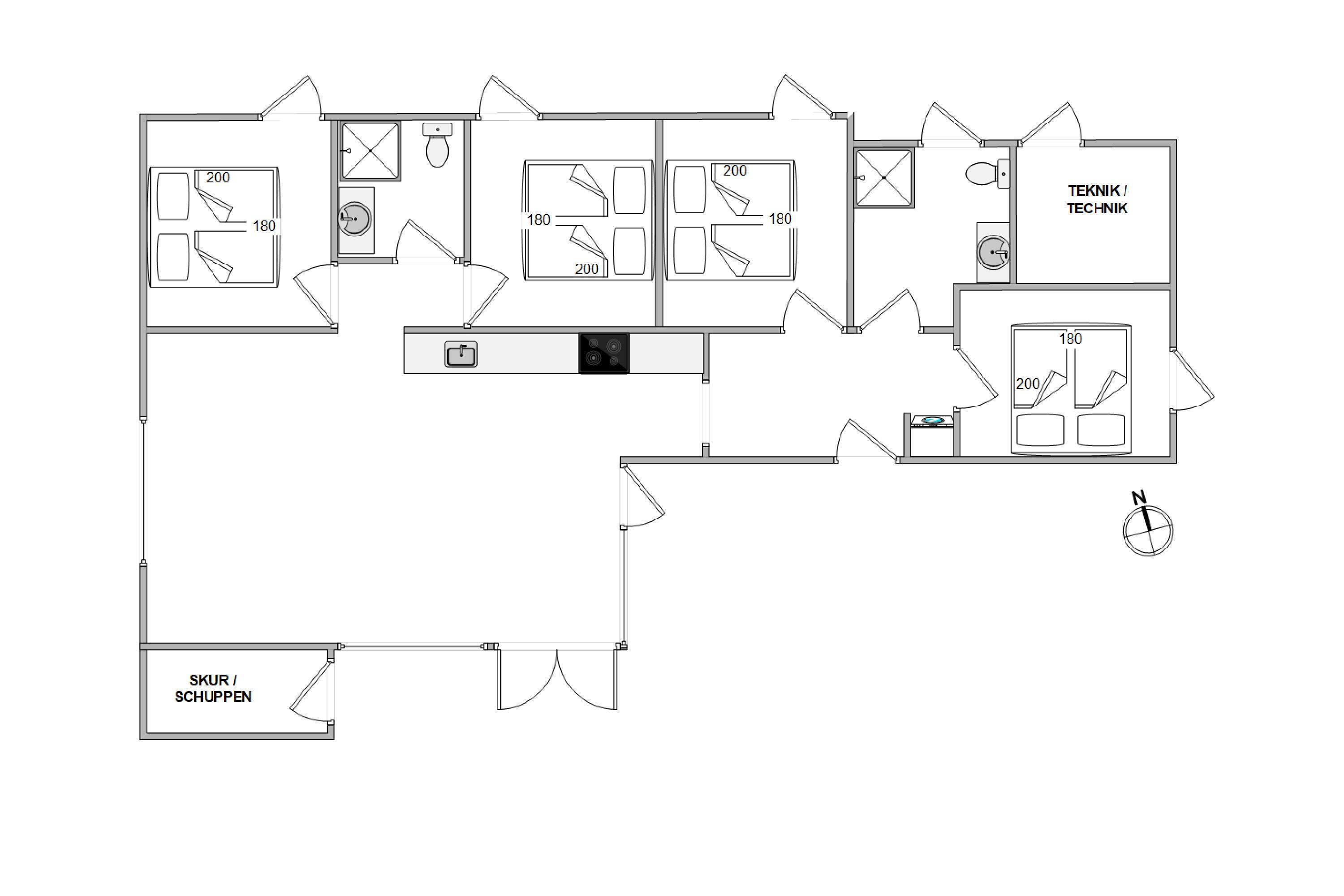 Indvendigt er huset praktisk inddelt i 2 soveafdelinger med hver 2 dobbeltværelser og med hvert sit fine badeværelse, hvor det ene opfylder lovkravene til handicapvenlige boliger. Så er I 2 familier der rejser sammen, er huset virkeligt fint indrettet til det formål. Den dejlige stue har masser af lysindfald, er udstyret med brændeovn og i åben forbindelse med køkkenet. Her kan I være sammen både store og små, spille et spil eller bare slappe af med en god bog eller en kop the.