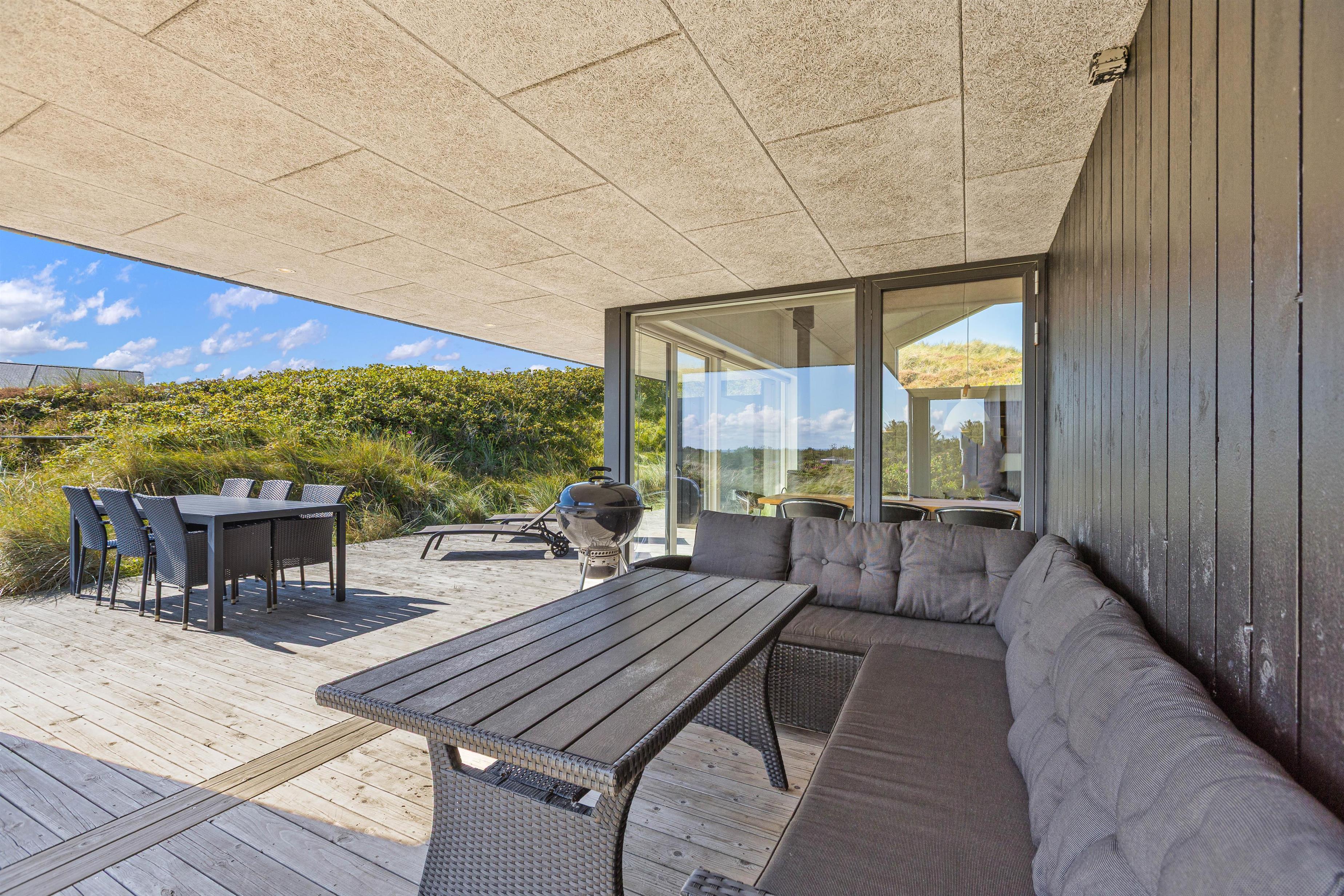 I dette flotte moderne sommerhus, er der rig mulighed for hygge og samvær med hele familien, og det oven i købet i fantastisk smukke rammer. Her er god plads til at være sammen både inde og ude. De fine overdækkede terrasser giver dig mulighed for at nyde naturen i næsten al slags vejr, så tænd op i grillen, sæt dig godt til rette og nyd så den smukke udsigt. Efter en lækker middag fra grillen, kan du tage et glas vin i hånden og gå op på klittoppen bag huset og nyde en smuk solnedgang mod vest, og står du tidligt op får du samme smukke oplevelse når solen næste dag stiger op mod øst over Ringkøbing Fjord.