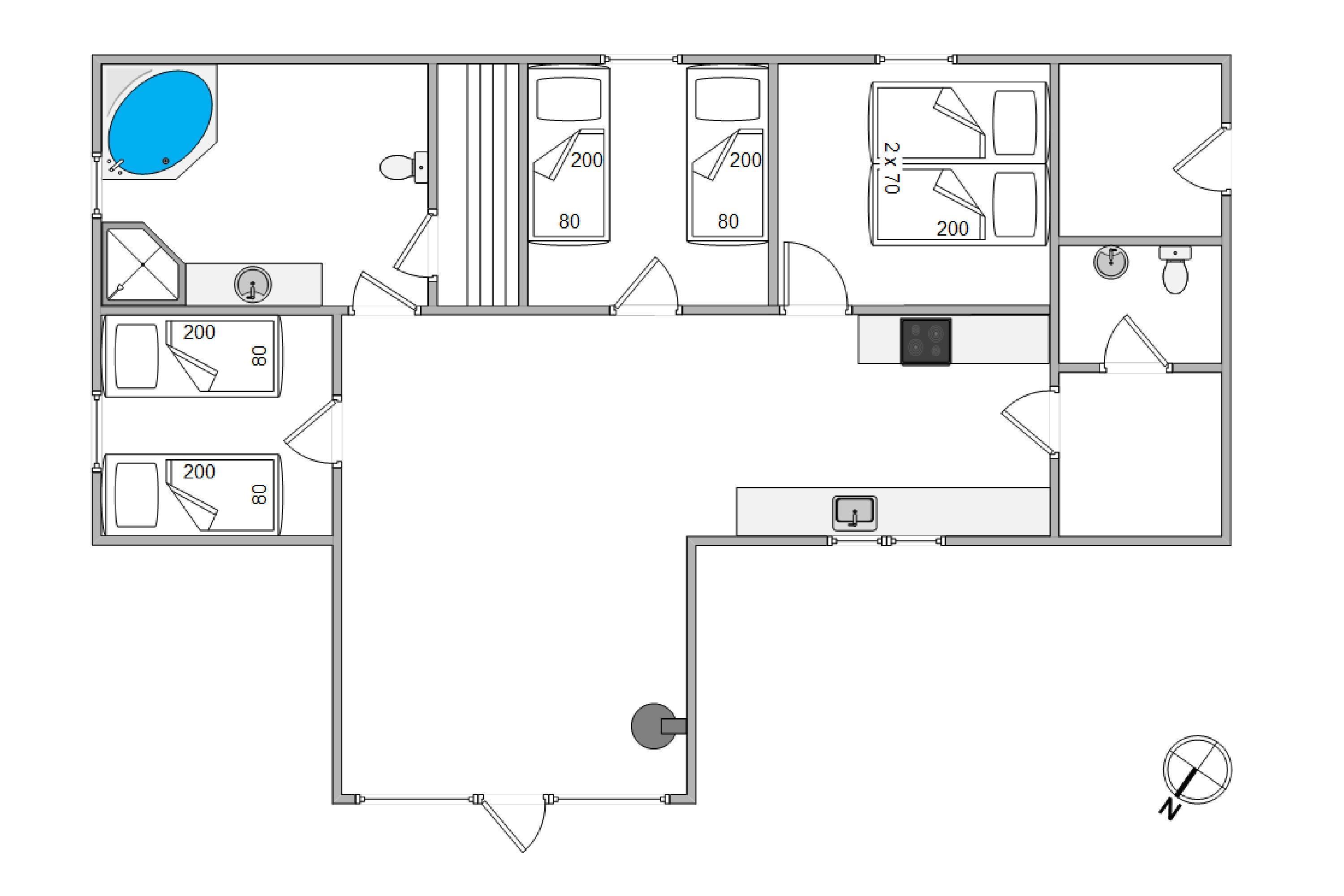 Huset har 3 gode soverum. 1 af værelserne er indrettet med en dobbeltseng og 2 med to enkeltsenge hver. Huset har et superdejligt stort badeværelse med spa og indgang til en dejlig sauna. Huset har desuden også et lille gæstetoilet, og i huset står en kondicykel også til rådighed. På både det store badeværelse og gæstetoilettet er der også gulvvarme, så dine fødder altid holdes dejlig lune.