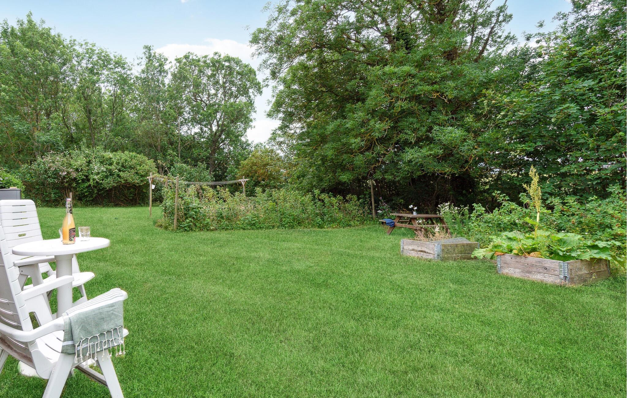 Fra opholdsrummet er der god udsigt over markerne og udgang til naturgrunden med flere hyggelige kroge og muligheder for at nyde dagens første kop kaffe i solskin.