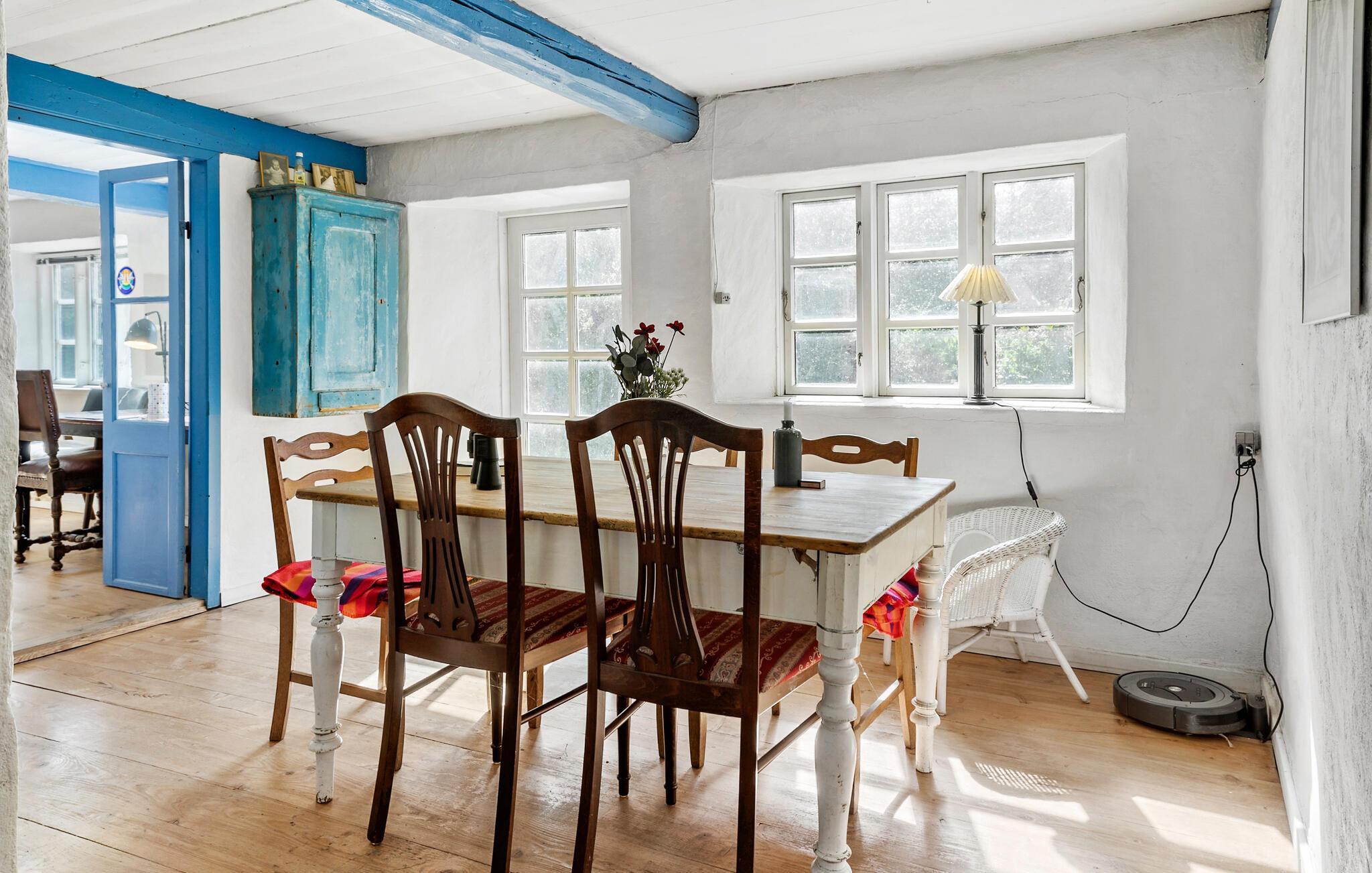 Der er mange fine detaljer i dette fine landhus, som ligger midt inde på øen i den nordlige ende af Bornholm. Her kan I nyde feriestunderne mellem flotte trælofter, karakterfulde gulve og en smuk kamin. Der er to etager med velindrettede opholdsrum og værelser, alt sammen med rustikke detaljer, hvilket giver jer en helt særlig ramme. Begynd dagene med morgenmad i det store landkøkken med brændeovn. Her kan I sidde og blive klar til dagen, mens I nyder udsigten gennem de sprossede vinduer ud mod det grønne.