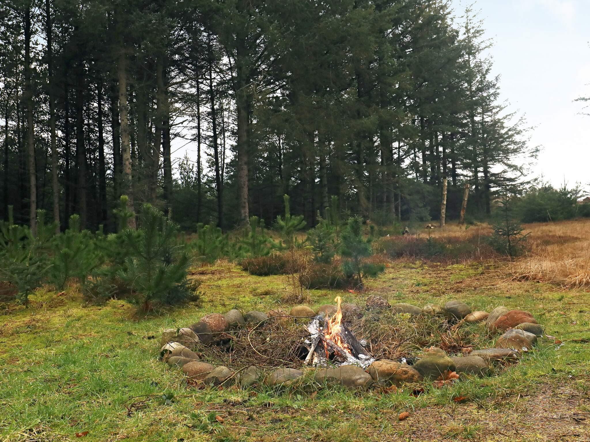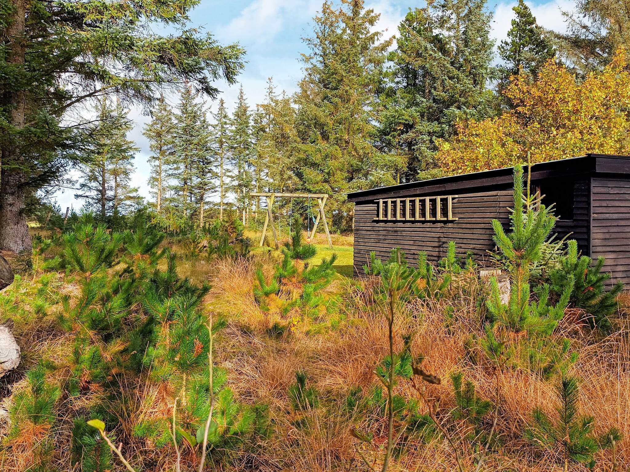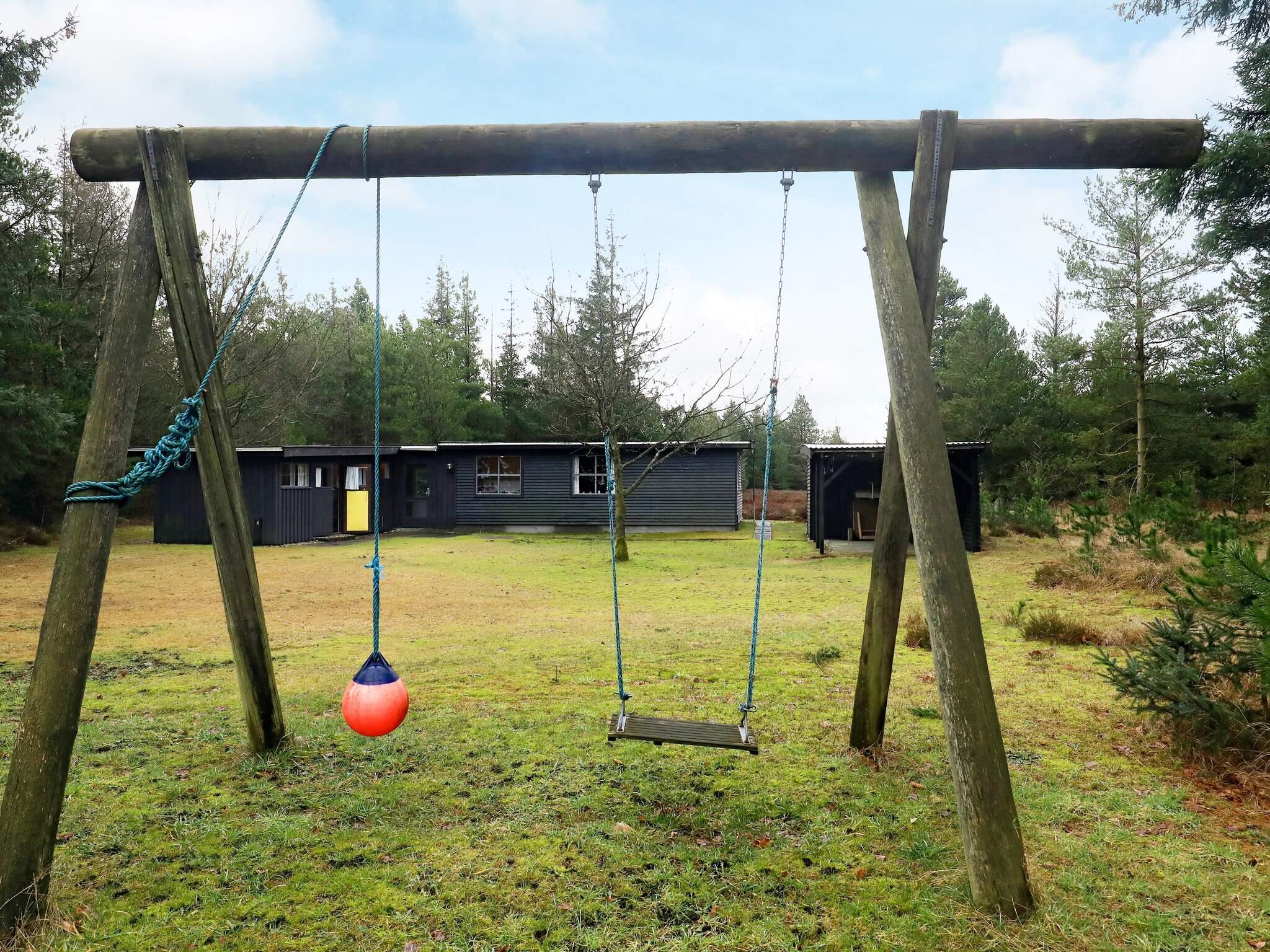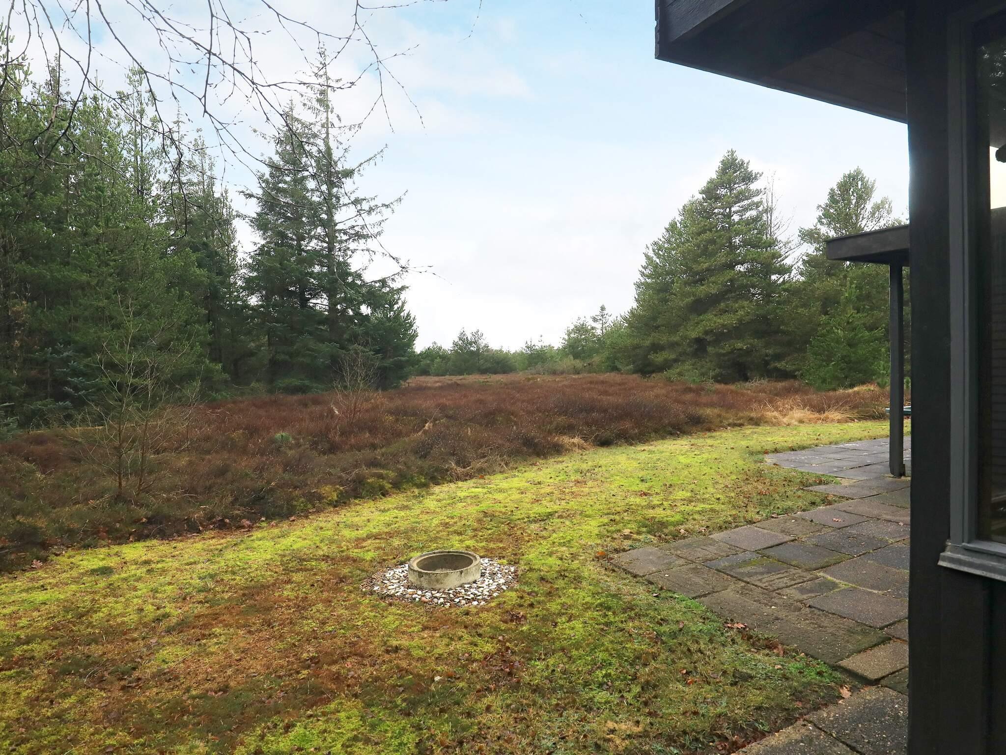 Haven har en gynge og en stor bålplads. Huset ligger på en naturgrund delvist beklædt med grantræer, mos og buske.