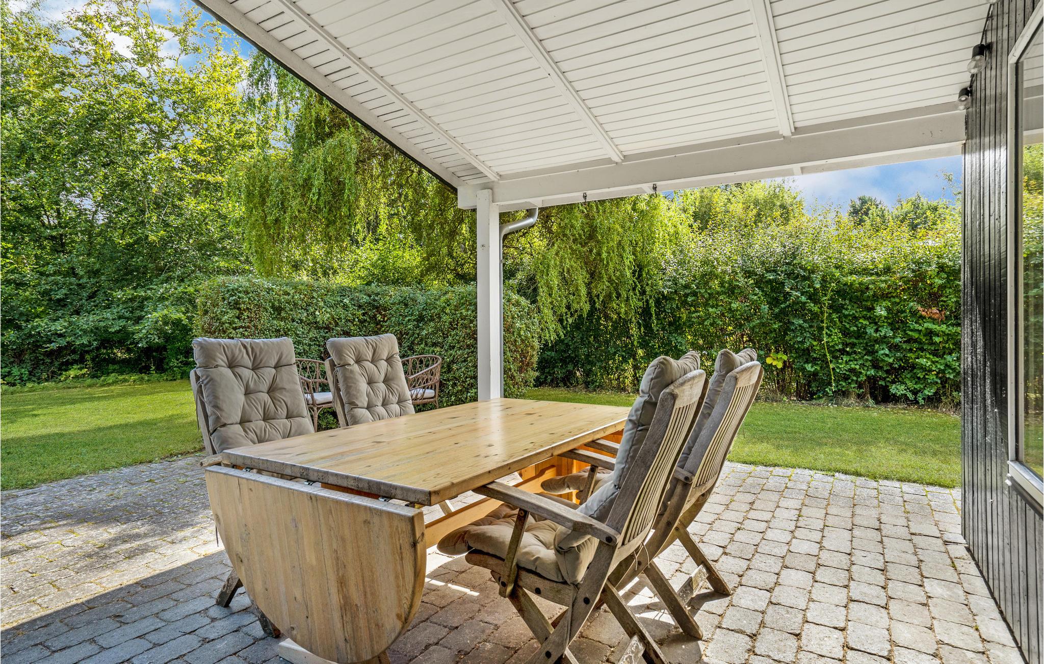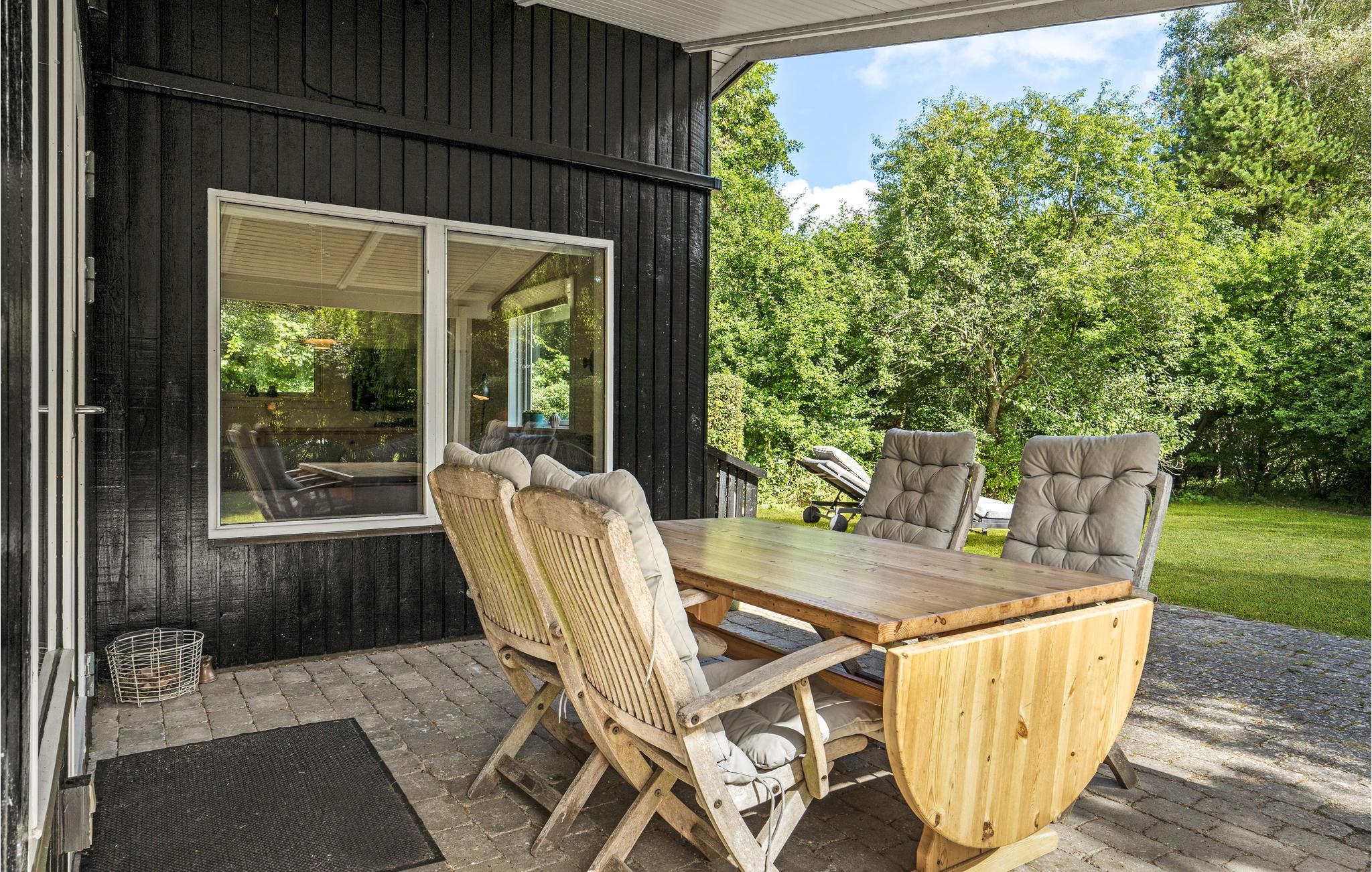 Sommerhuset ligger på en naturgrund med store græsplæner, hvor børnene har masser af plads til at lege og være aktive, og jeres hund kan boltre sig. Den åbne, overdækkede terrasse er det perfekte sted at nyde de lange, lyse sommeraftener med et glas vin eller en kold drink i hånden. I er også meget velkomne til at benytte grillen, så I kan tilberede lækker grillmad.